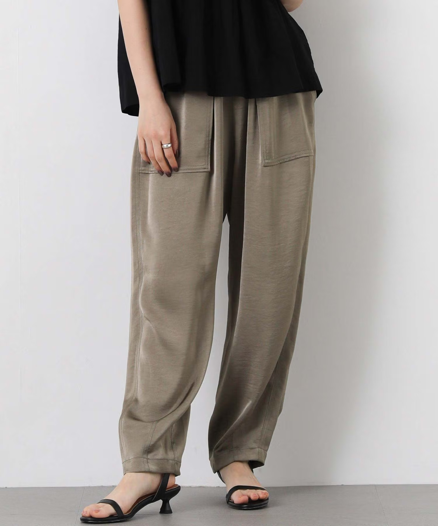 ワイドパンツやテーパードパンツなど、縦ラインが出るボトムはオフィスシーンに馴染みやすく、ブラウスのボリューム感とのバランスも取りやすいです。
