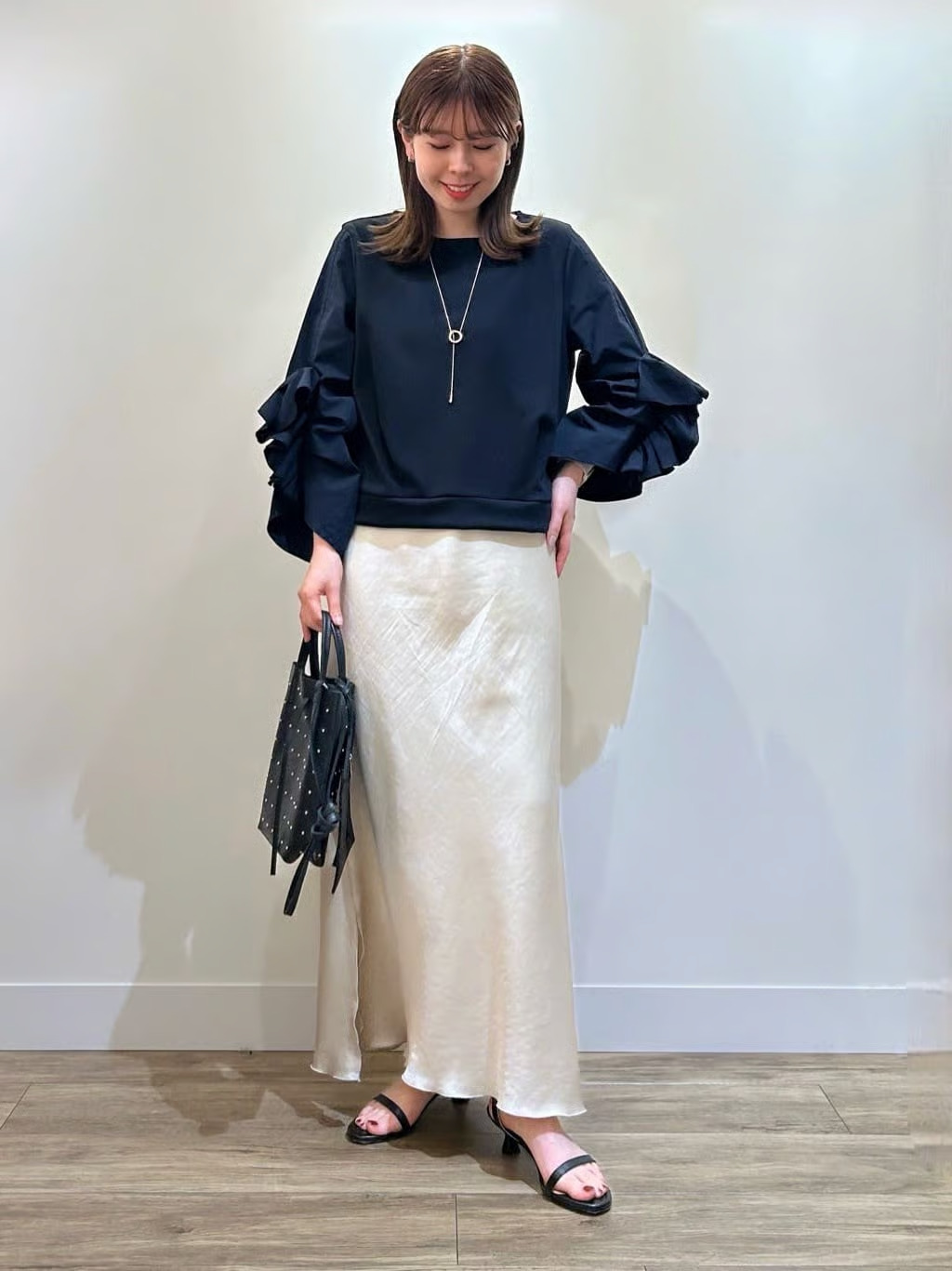 スタイリング① ラッフルブラウス×バイアススカートで女性らしい上品スタイル