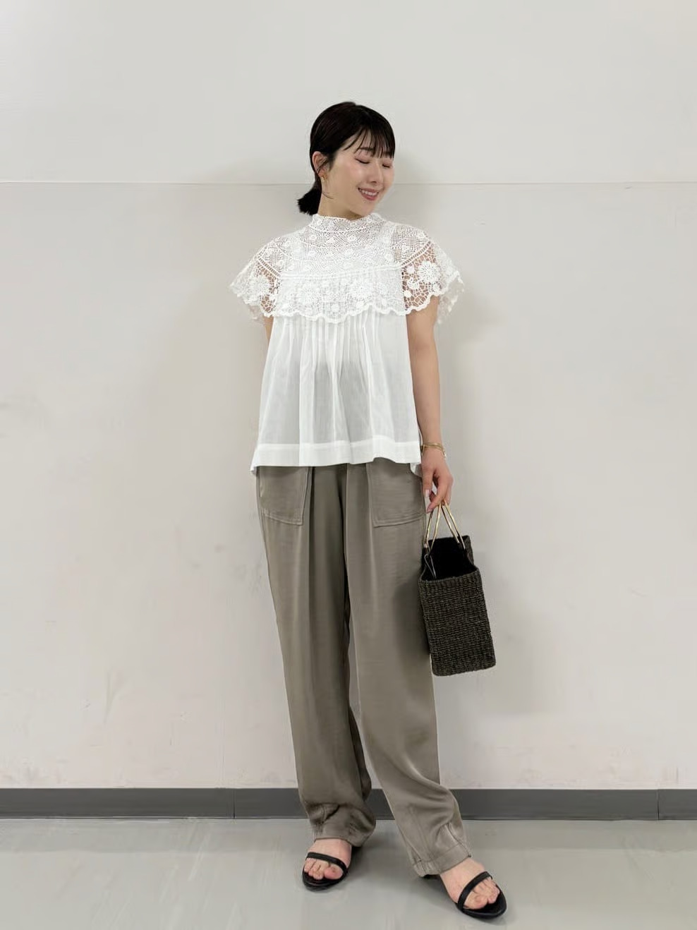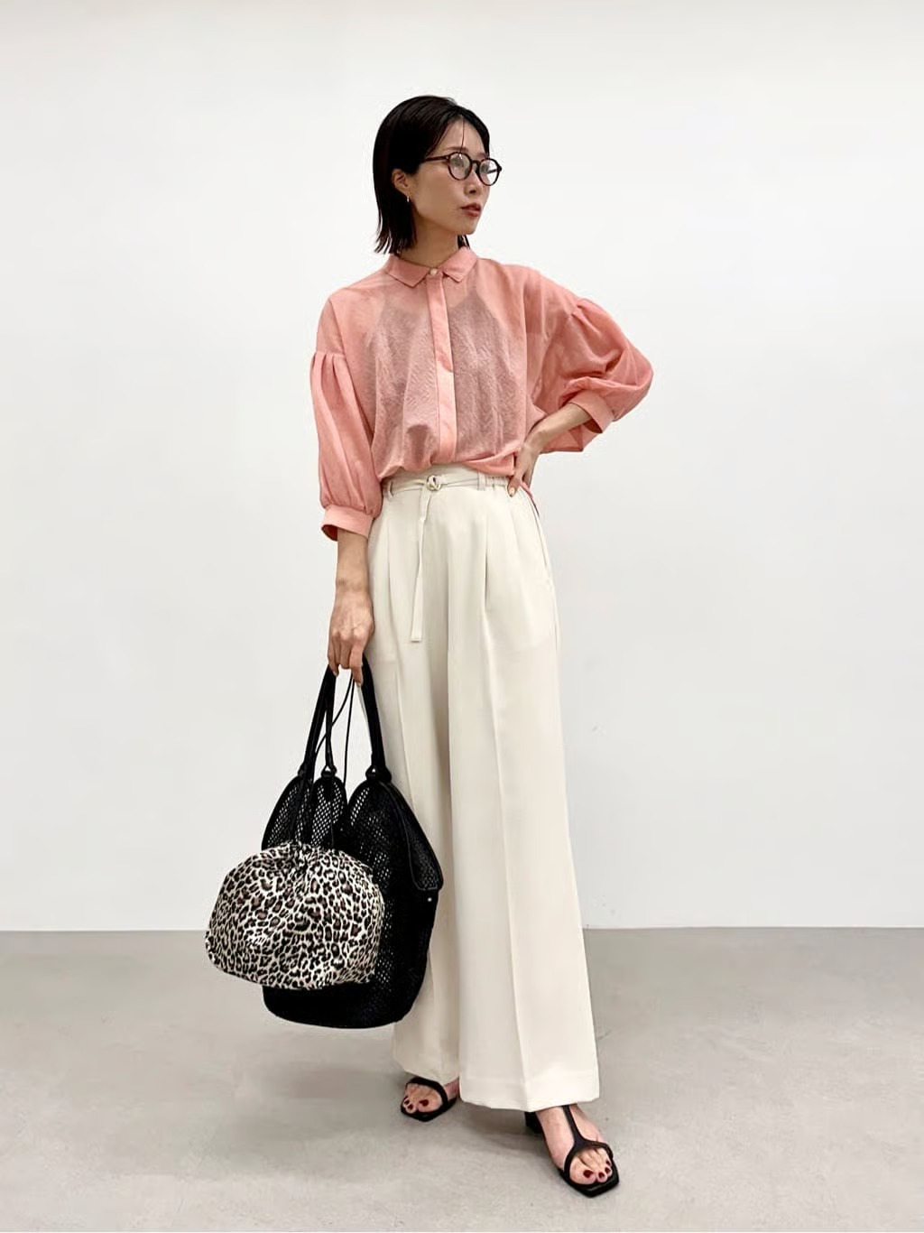 2026年春夏の注目素材「シアー」を取り入れたパフスリーブブラウスに、カルゼワッシャー素材のリラクシーなワイドパンツを合わせたスタイリング。衿付きのデザインで上品さをキープしながら、袖のボリュームと素材の軽やかさで今季らしいニュアンスを醸し出しています。