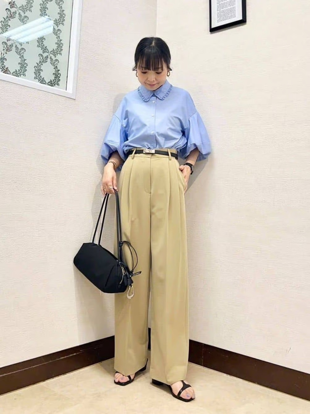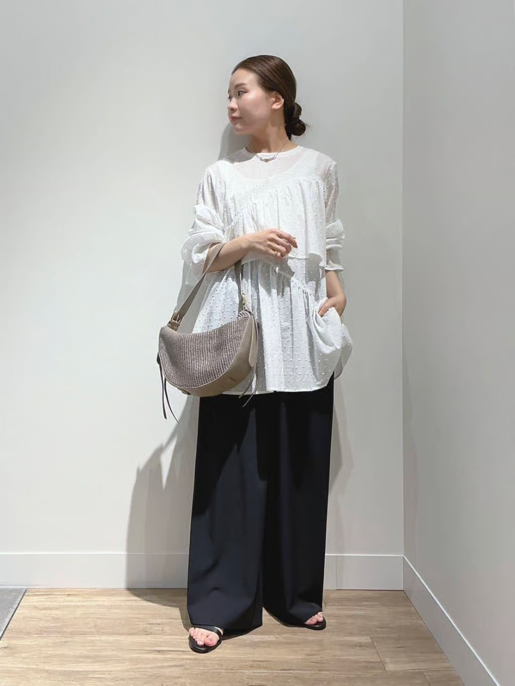 スタイリング③ シアーパフブラウス×ワイドパンツで今季らしさ全開
