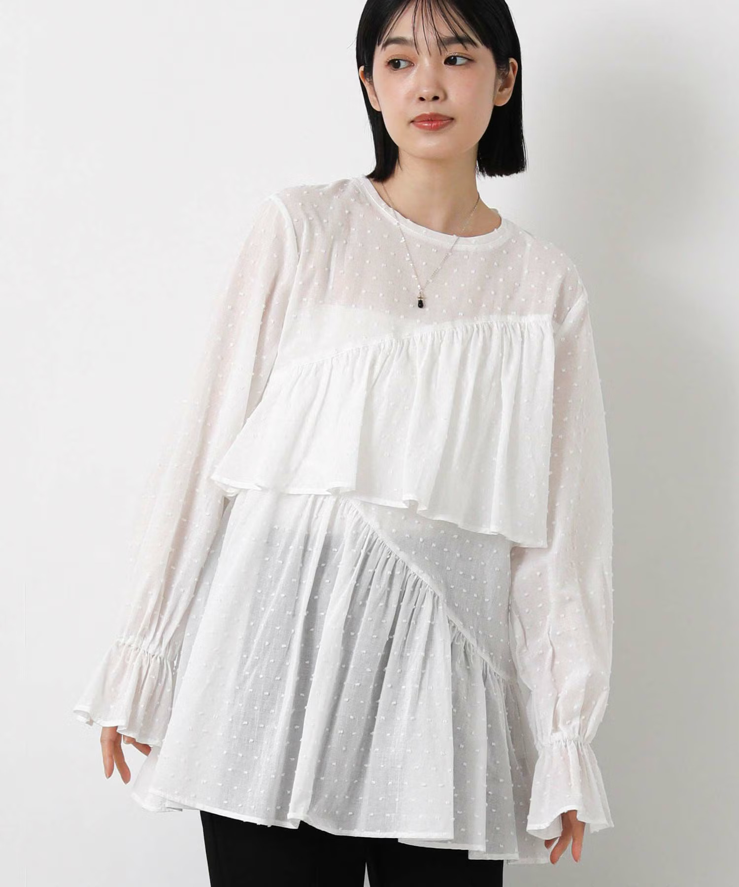 2026年春夏の注目柄「ドット」をドビー織で表現したフリルブラウスに、スッキリとしたフルダルワイドパンツを合わせたスタイリング。柄物のブラウスもフリルのデザインが上品さを演出し、オフィスシーンにも自然に馴染みます。パンツは2way仕様で着回し力も抜群。