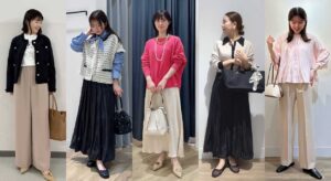 細かなプリーツ加工と、ふわっと立ち上がるフリルネックが上品。ボトムはワイドパンツで引き算すると、甘さがほどよく整って“大人のフェミニン”に着地します。