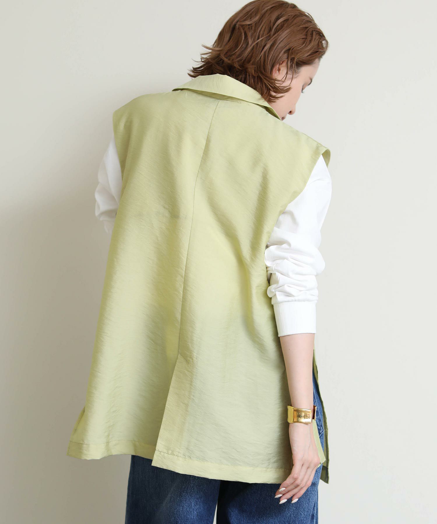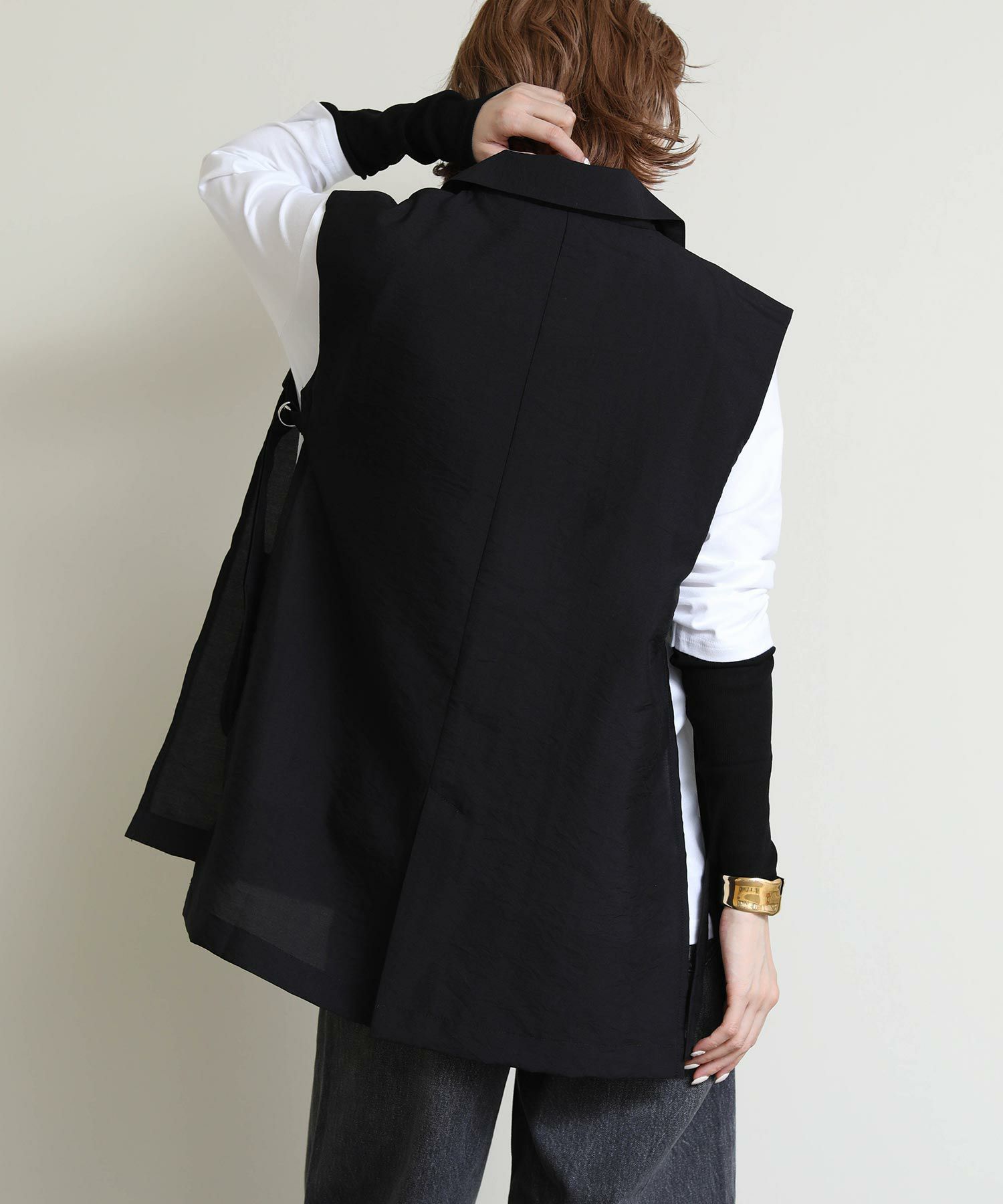 両サイドのバックルがポイントのジレ。