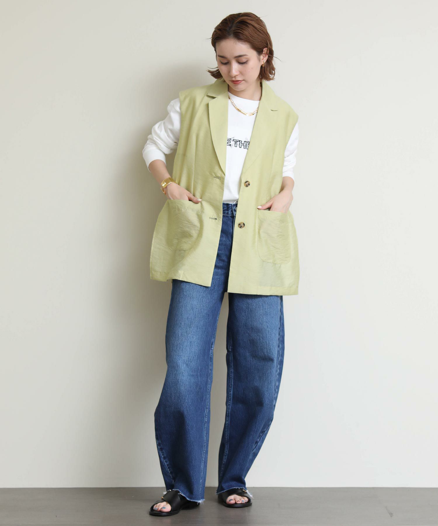 シンプルなインナーやカットソーの上から合わせるだけでワンランク上のスタイリングが完成します。