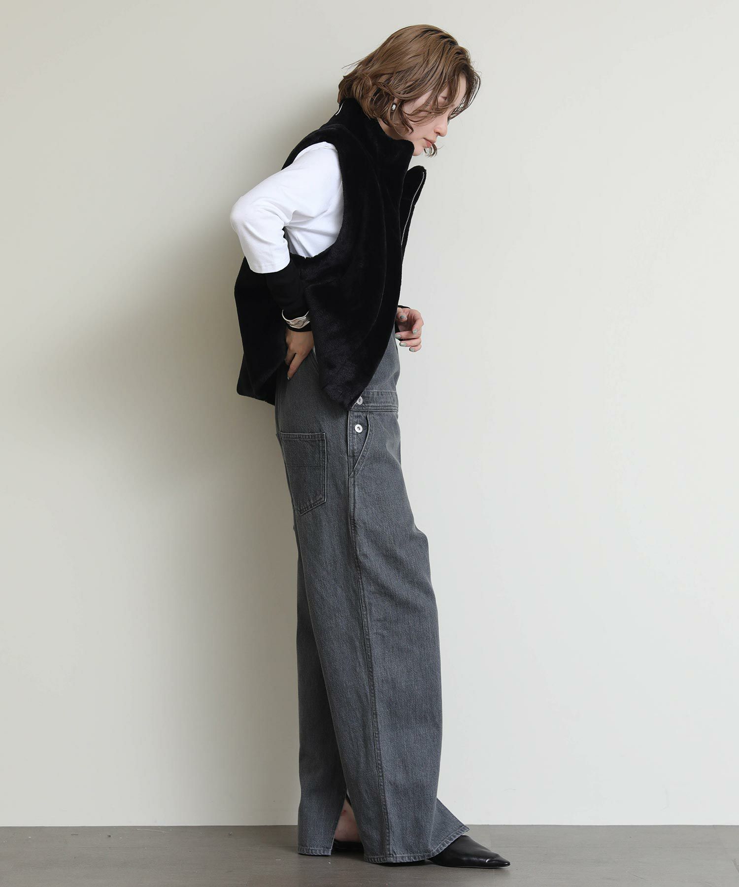 ゆとりがありながら裾スリットを入れることで足元はすっきりと見えるストレートシルエットに仕上げました。