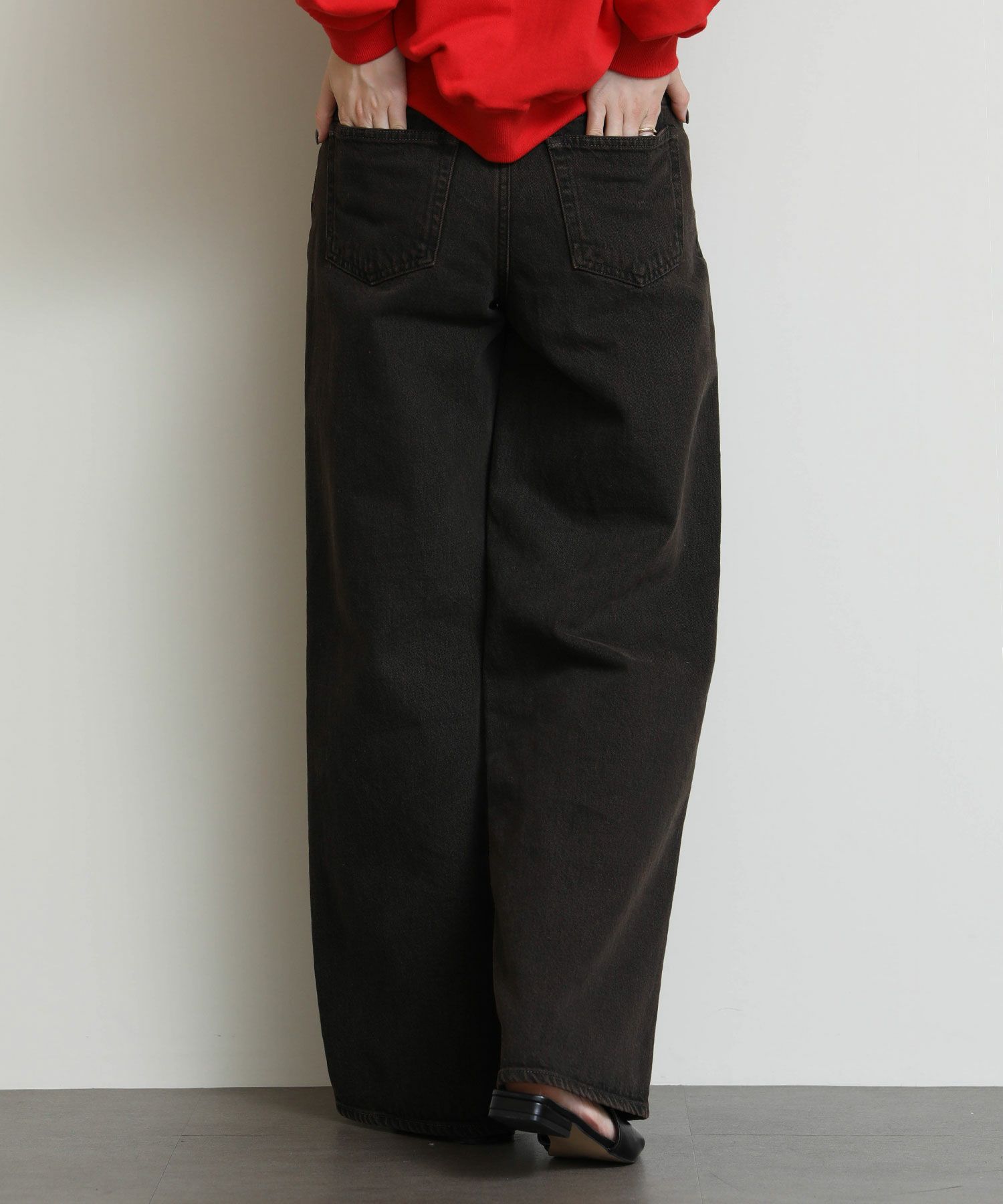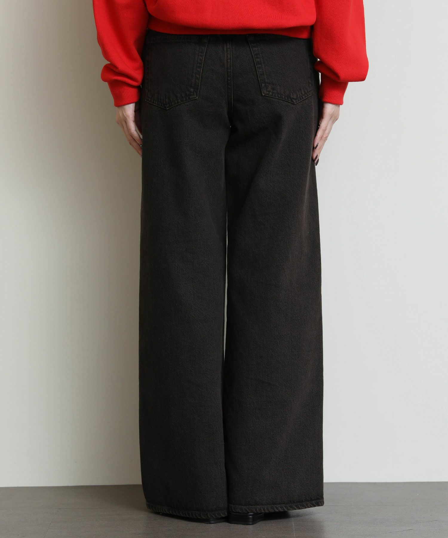 ウエストからヒップにかけてコンパクトな設計になっている為、ワイドながらルーズさはなく上品なシルエットが特徴です。13ozリサイクルブラックデニム使用し、製品染を施した一枚。