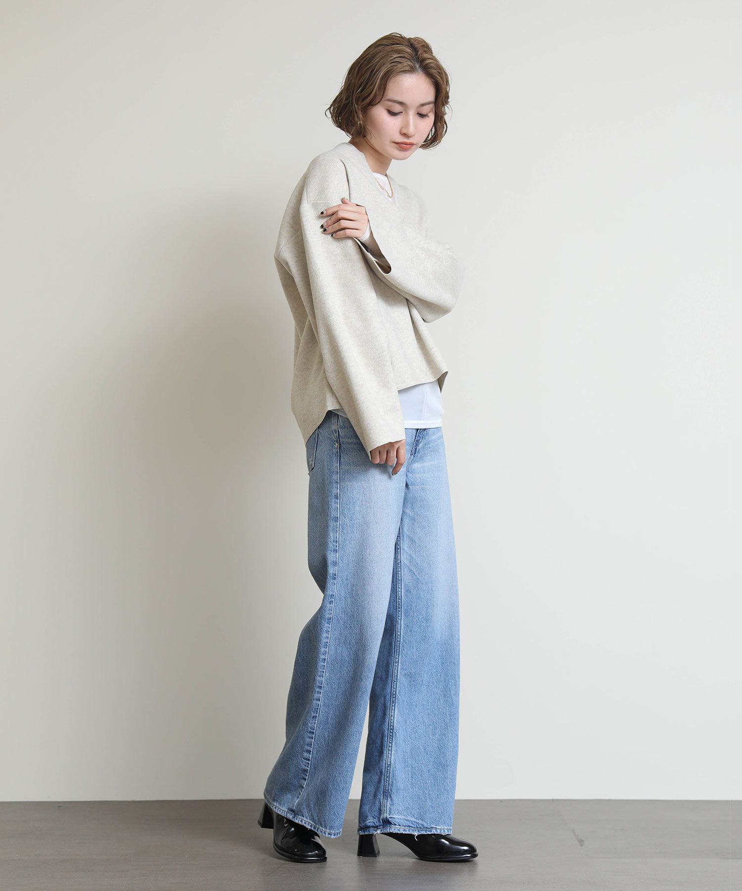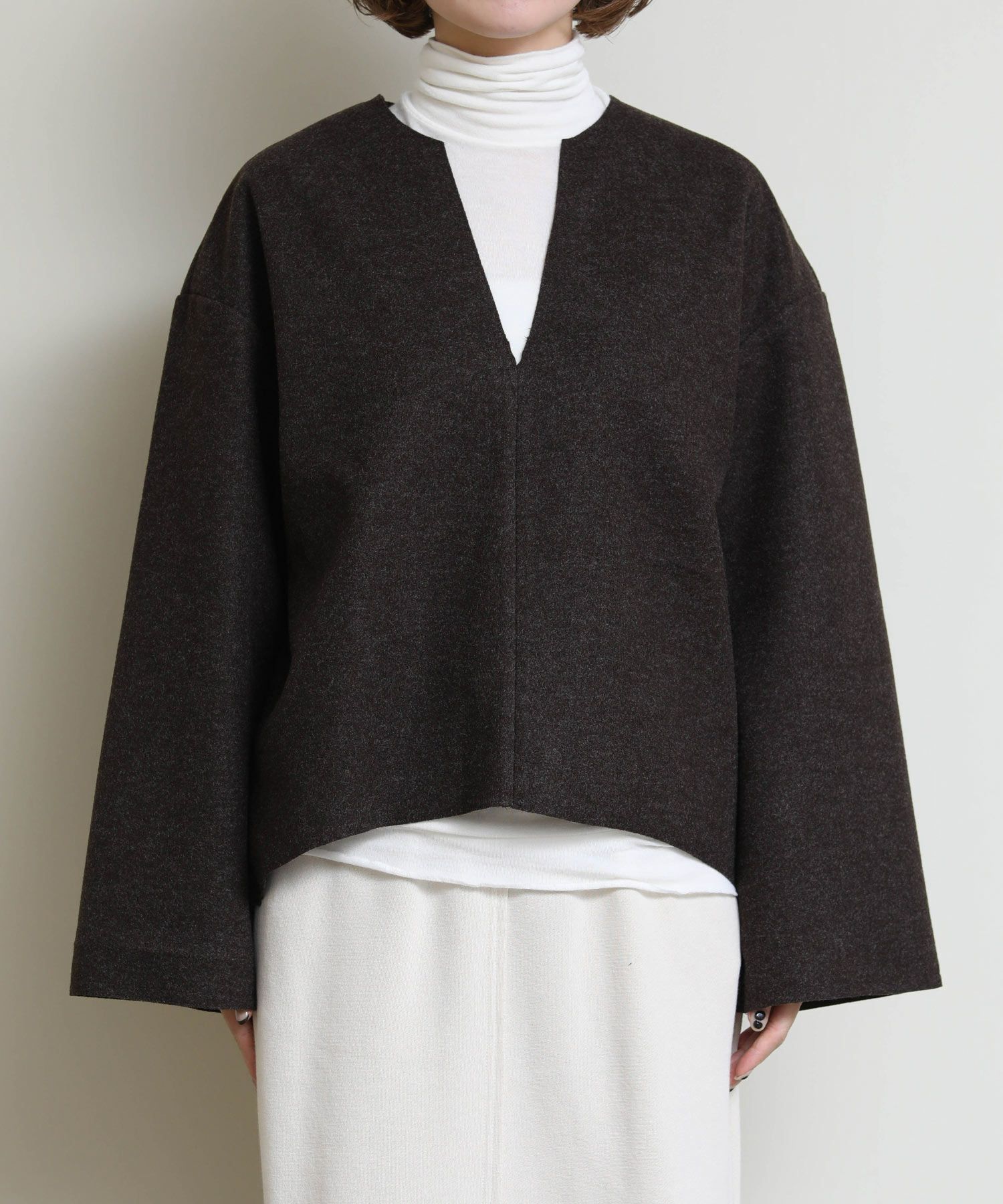 ゆとりのある身幅とドロップショルダーが身体のラインをカバーし、リラクシーな着心地を叶えます。シングルユースは勿論、Tシャツやハイネックなどをレイヤードすれば、雰囲気を変えて着用していただけます。