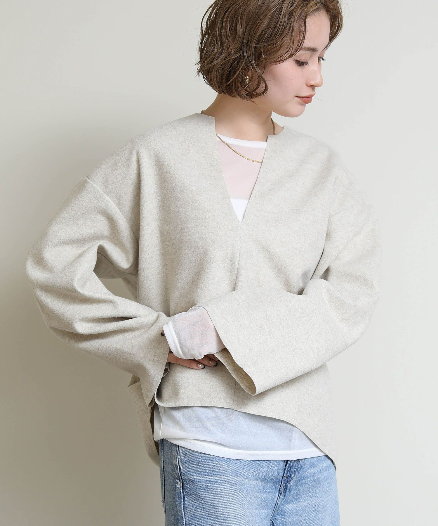 温かみのある風合いのメルトン生地で仕上げた、顔周りをスッキリと見せてくれるキーネックデザインのカットソー。