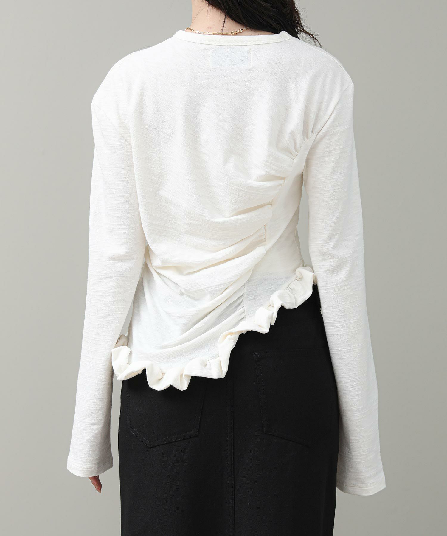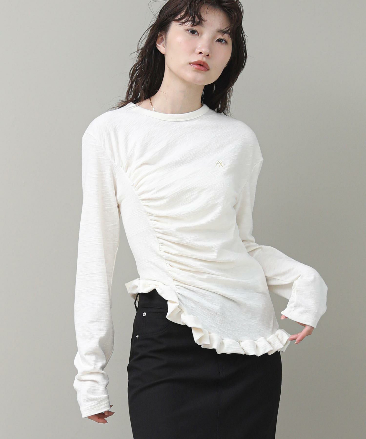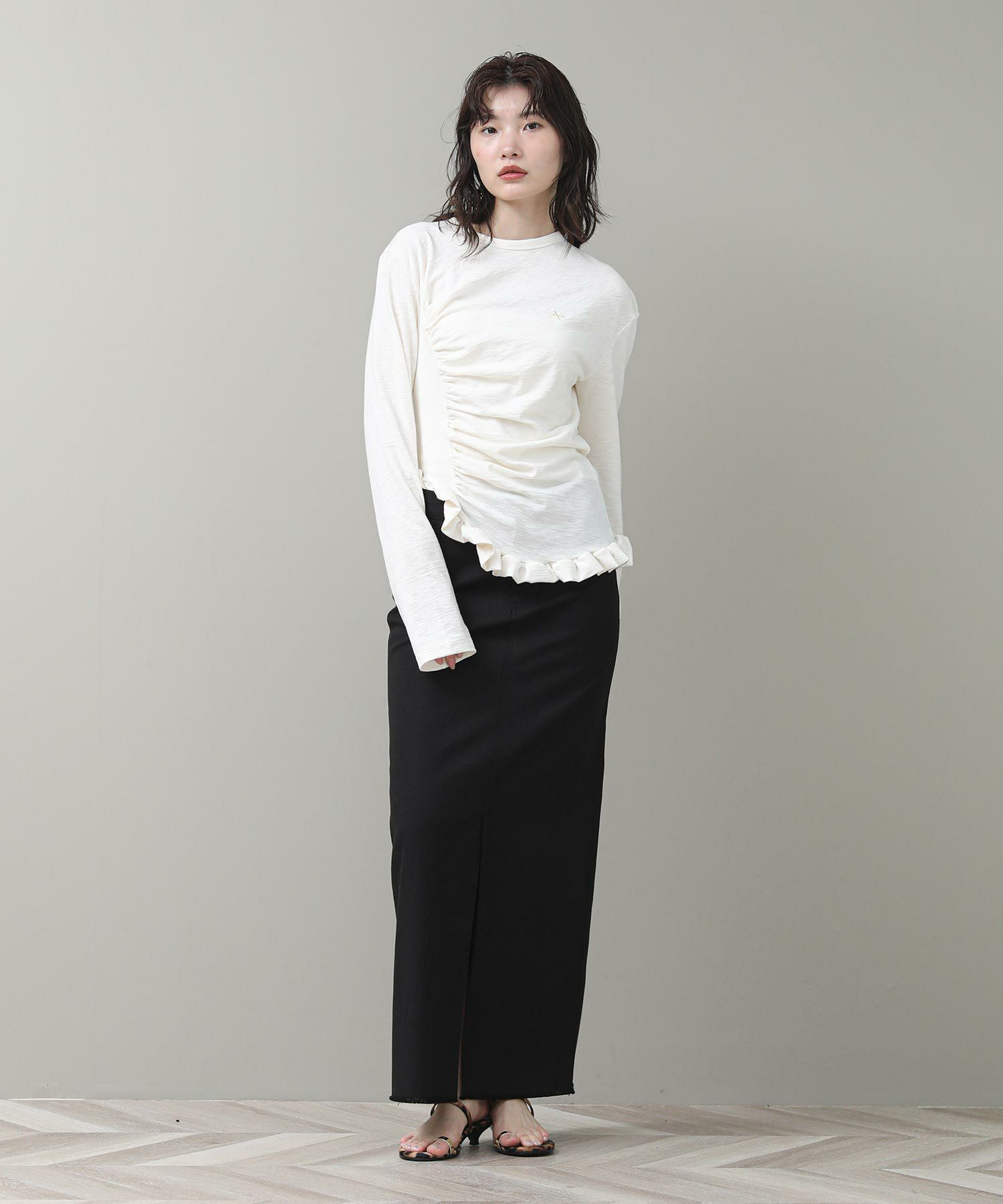 カットソーやスウェットなど日常的なアイテムにエッジの効いたデザインを加え、着心地の良さとデザイン性を両立させたアイテムが魅力のブランド。1枚で着映えるデザイントップス。デニムやスラックスなどベーシックなボトムと合わせてもモードな印象にまとまります。
