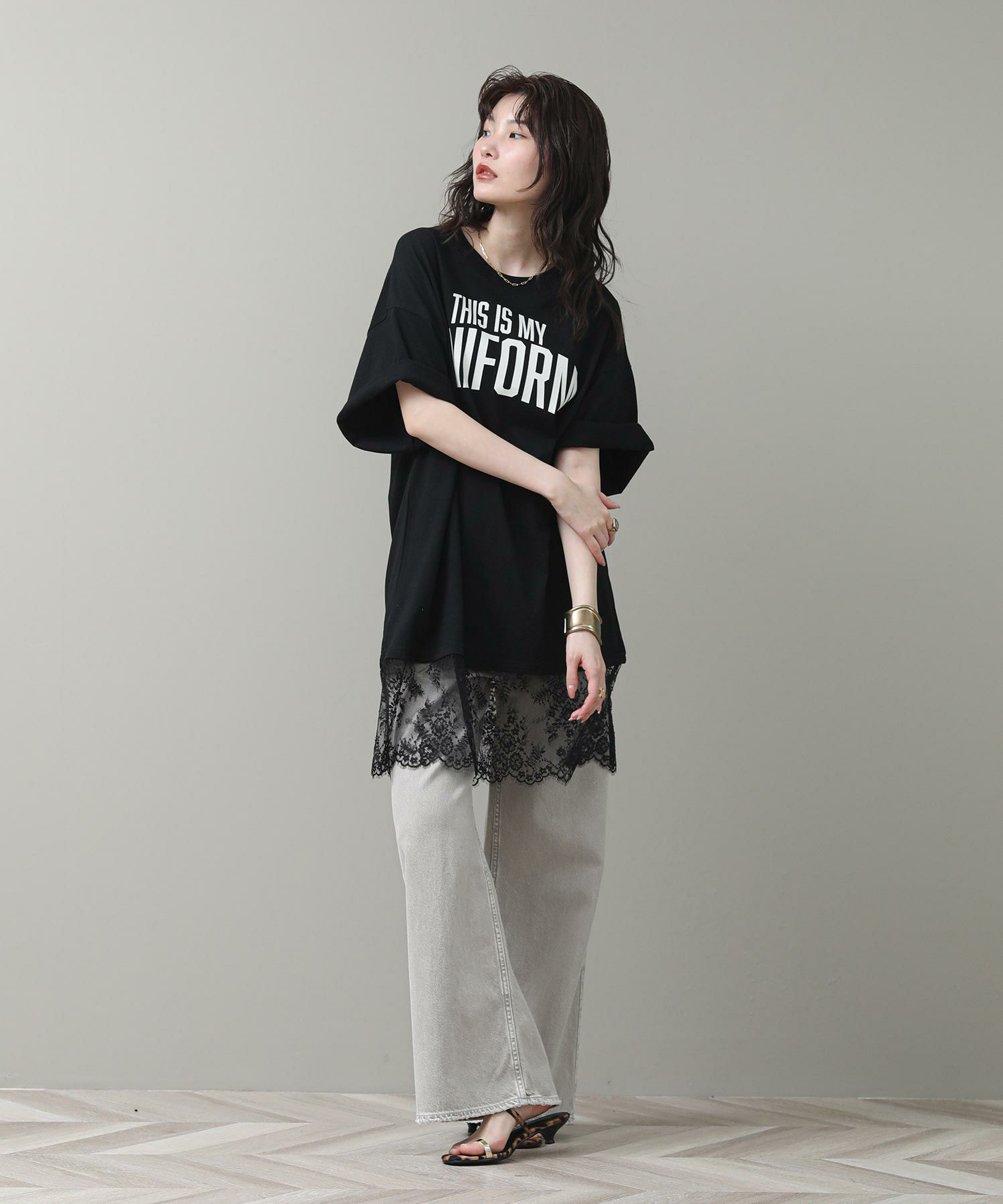 す。甘くなりがちなレースを大人の女性が着てもかっこよく着られるアイテムです。前後のロゴでバックスタイルも決まります。