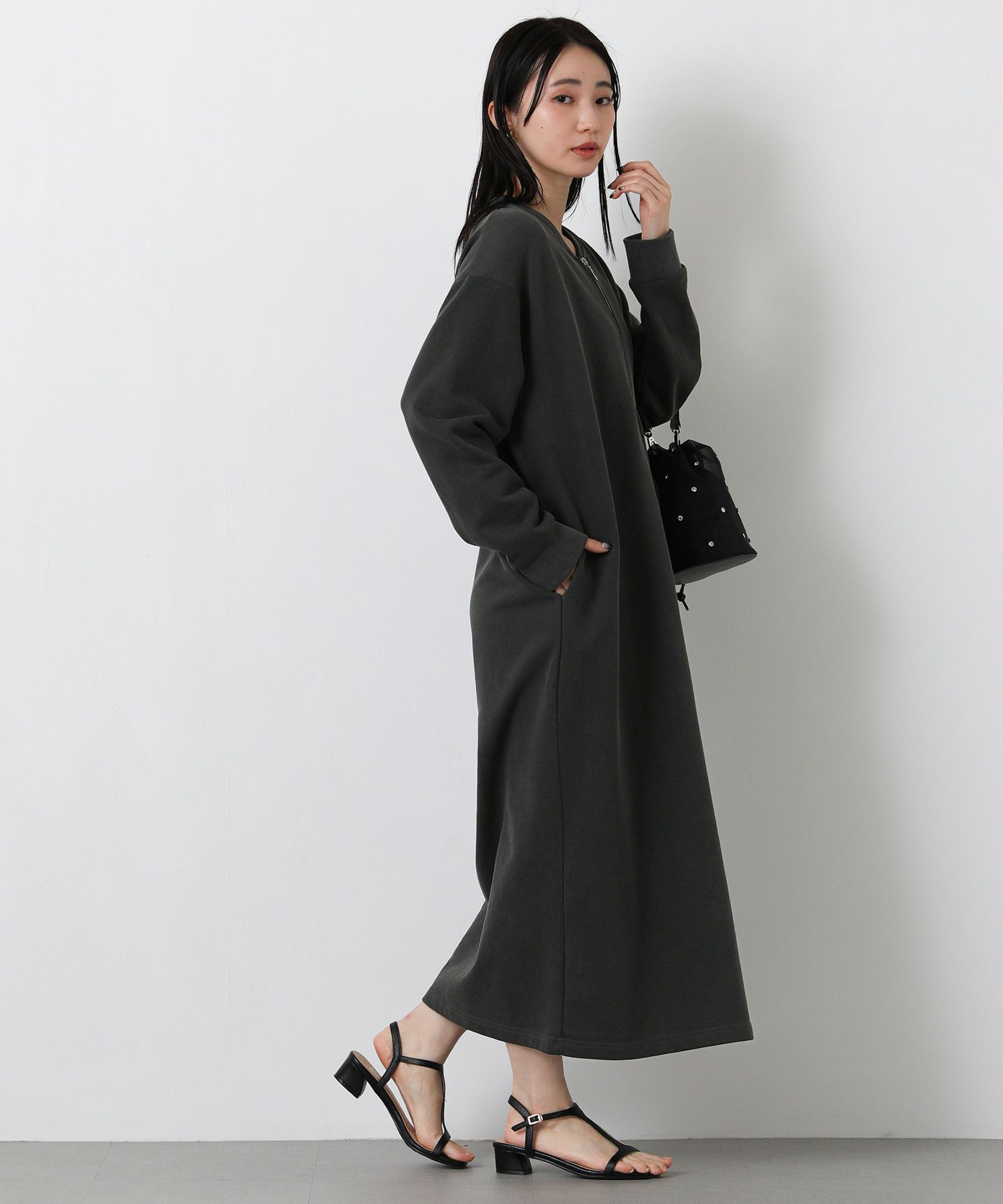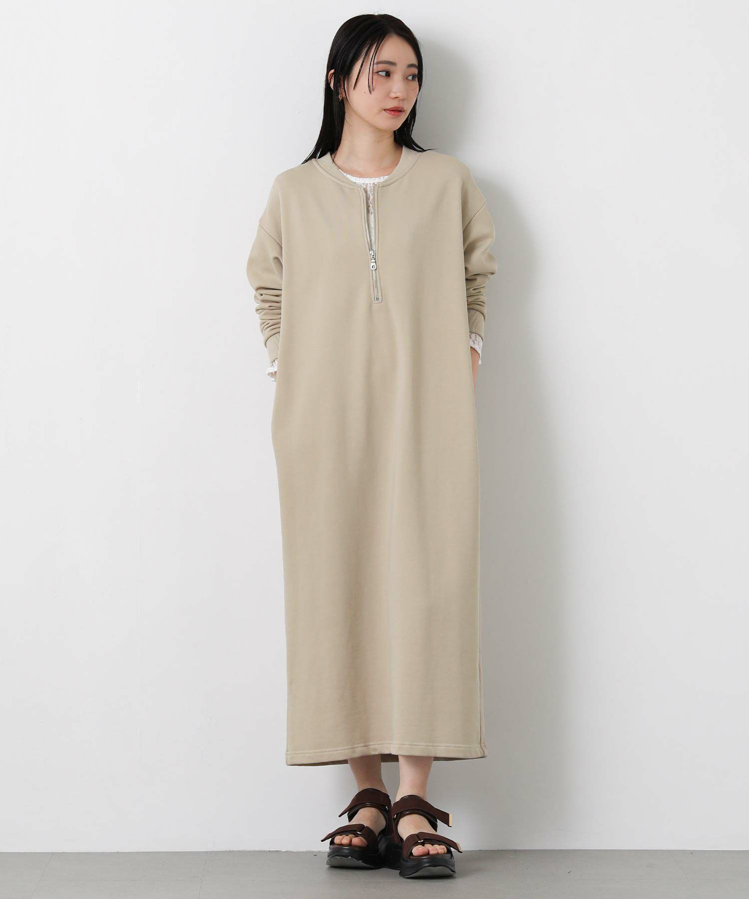裏毛カットソーを使用した、程よい厚みで春先まで着用できるハーフジップワンピース。