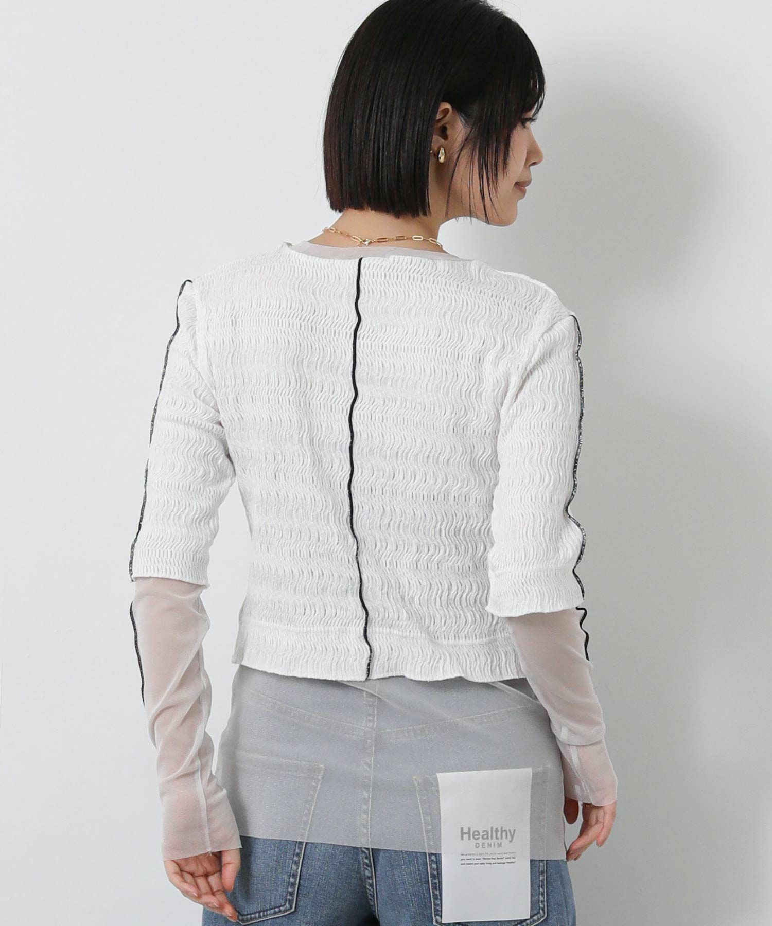 袖とネックライン、裾から覗くチュールが、軽やかで上品な印象に。