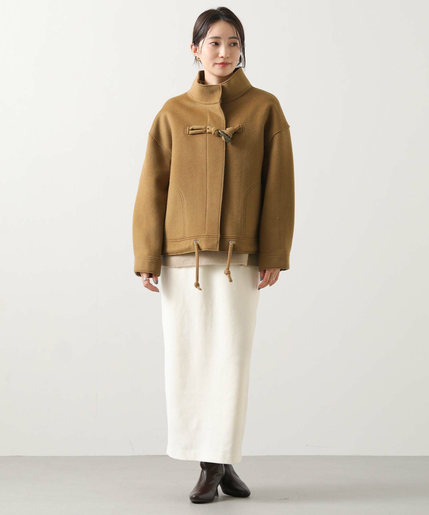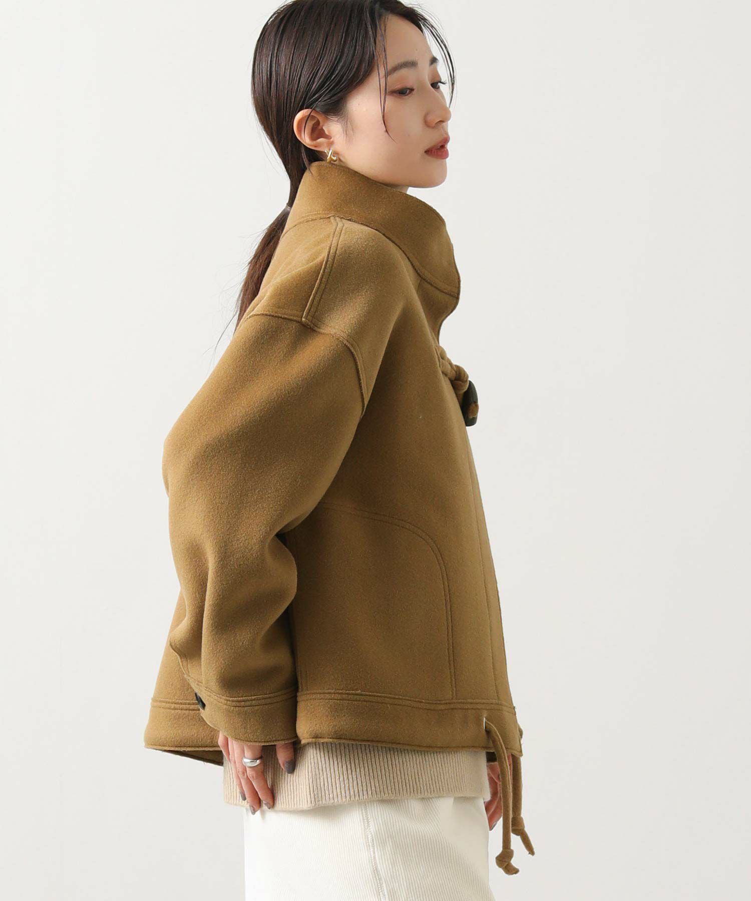 裾やトグルにロープでなく共地を袋にした紐使いにして、ダッフルのマリンやトラッドライクなイメージを少し控えてシックに仕上げました。