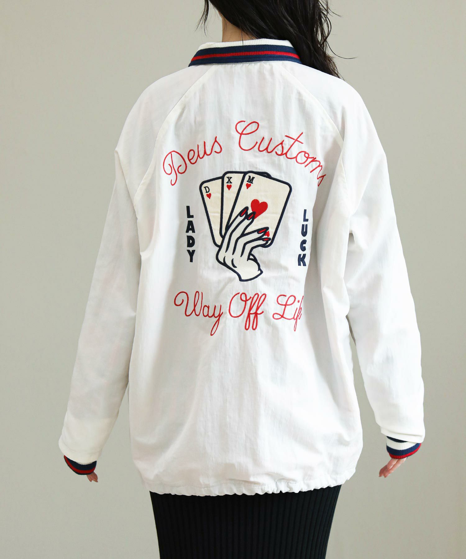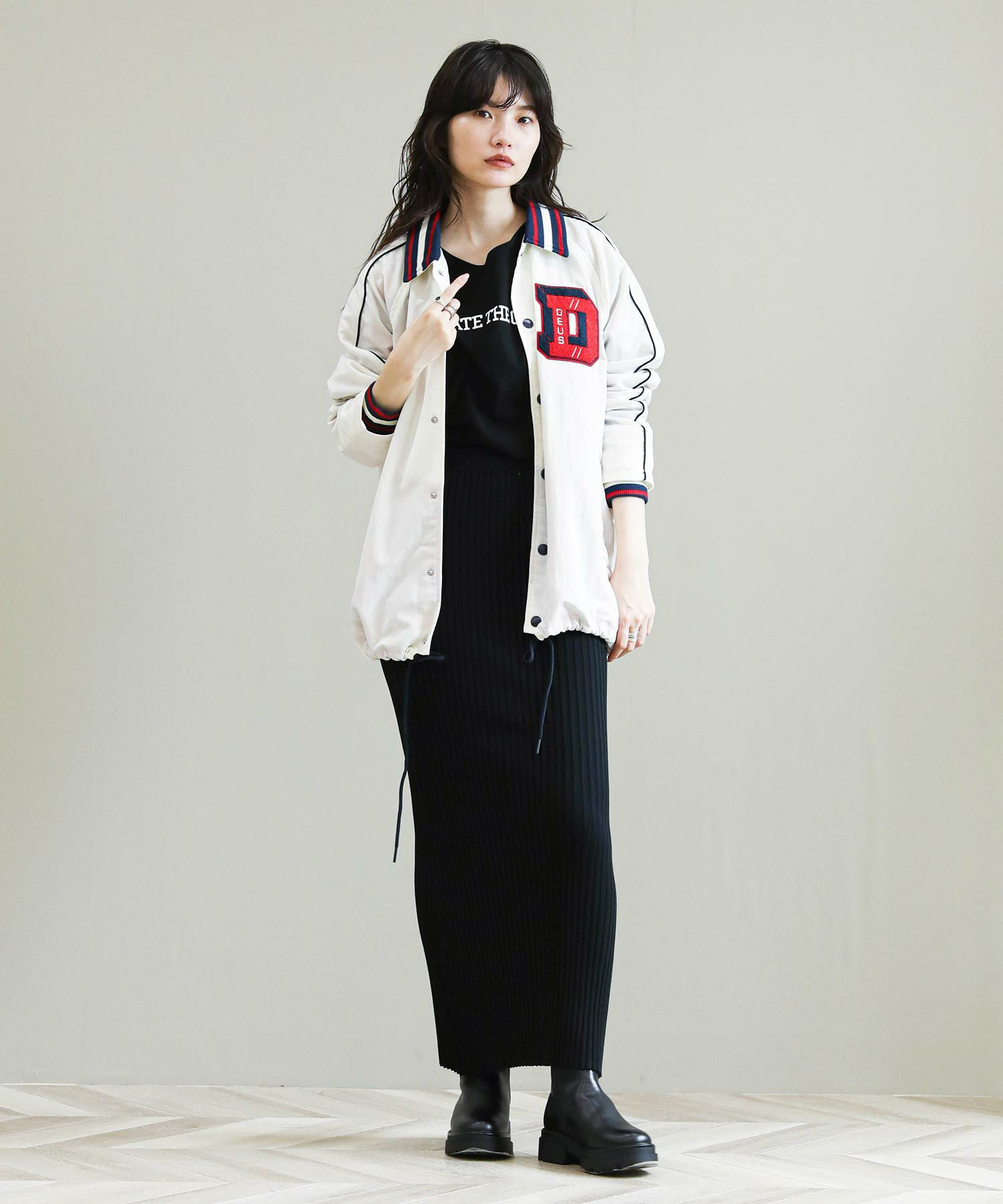 チェーンステッチや背中のワッペンがデザインポイント。 華やかな「D」のシュニール織のフロントパッチが目を引きます。ベーシックなタイトスカートやスラックスなど大人アイテムと合わせるとバランス◎