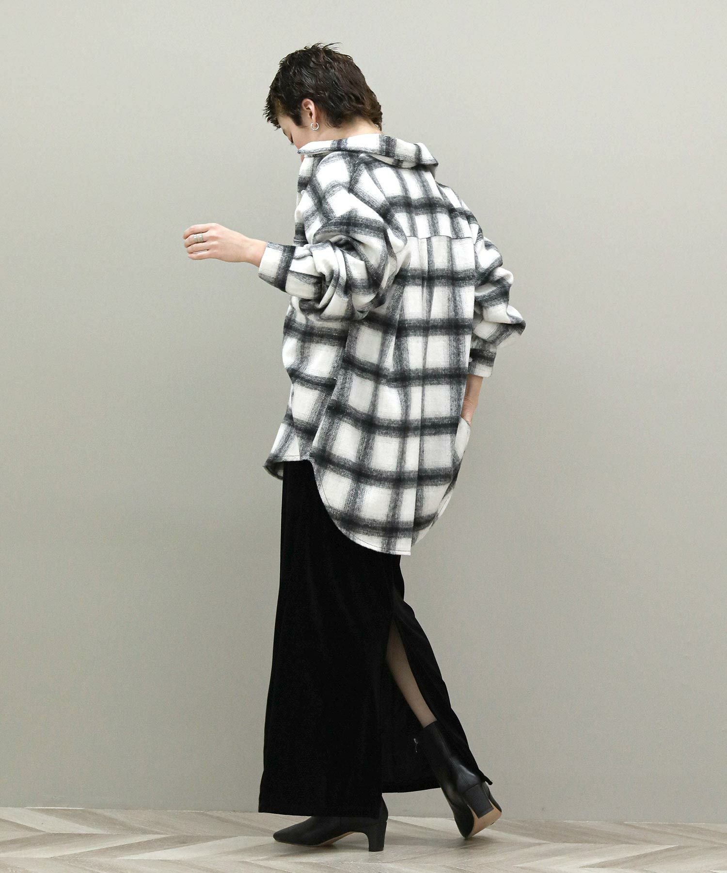 生地はしっかりと厚みがありながらもソフトな風合いが魅力。こなれ感のあるオーバーサイズでインナーにニットやスウェットを着て羽織ることもできます。腰回りをカバーしてくれる着丈でタイトスカートとも好相性。