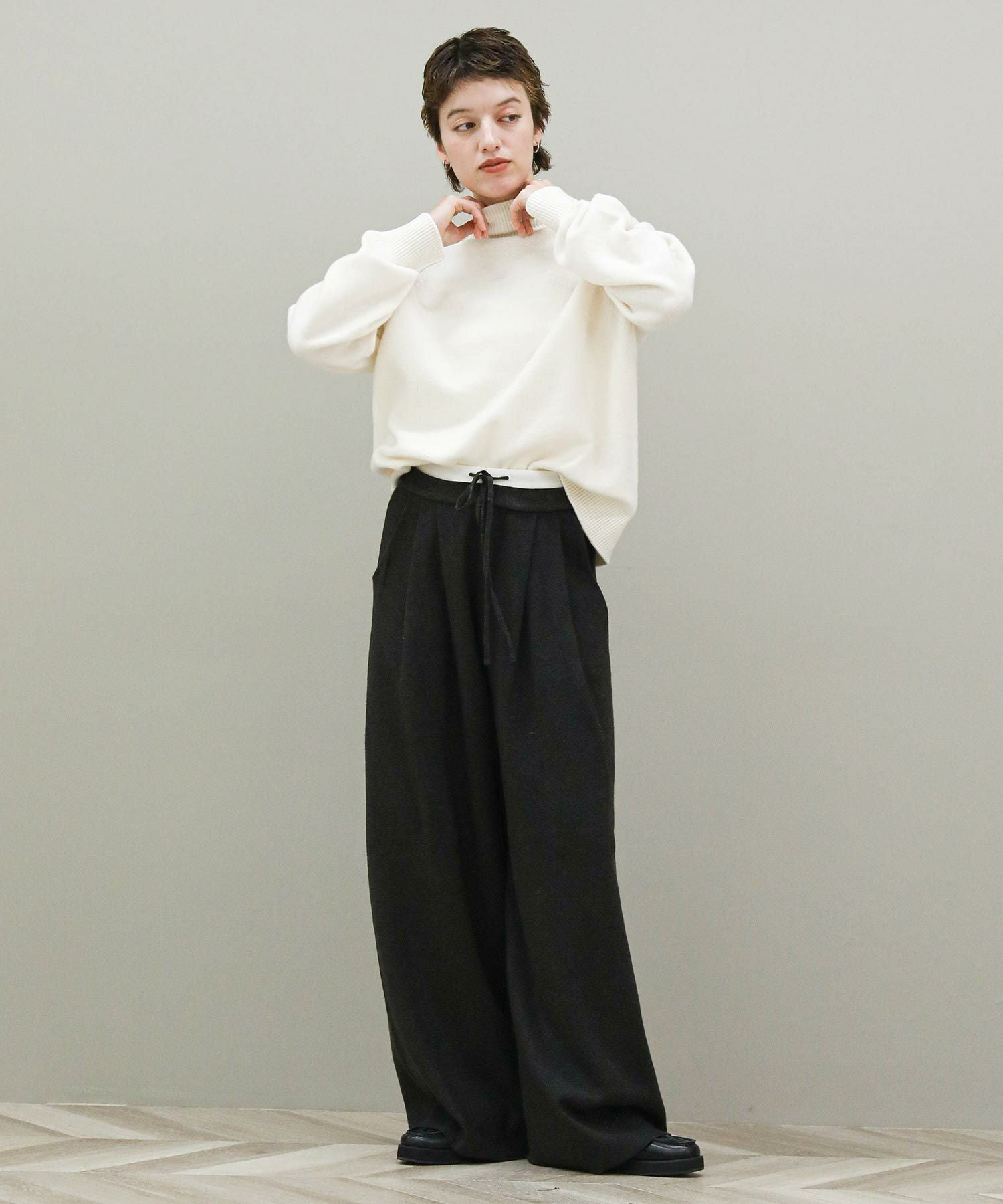 イージーな穿き心地も魅力です。ニットパンツですが、足のラインを拾わないゆったりとしたワイドシルエットなのでスタイルアップ効果も◎深みのあるチャコールグレーがカジュアルさを抑えます。トップスにニットを合わせても野暮ったくならないので幅広いスタイルをお楽しみいただけます。