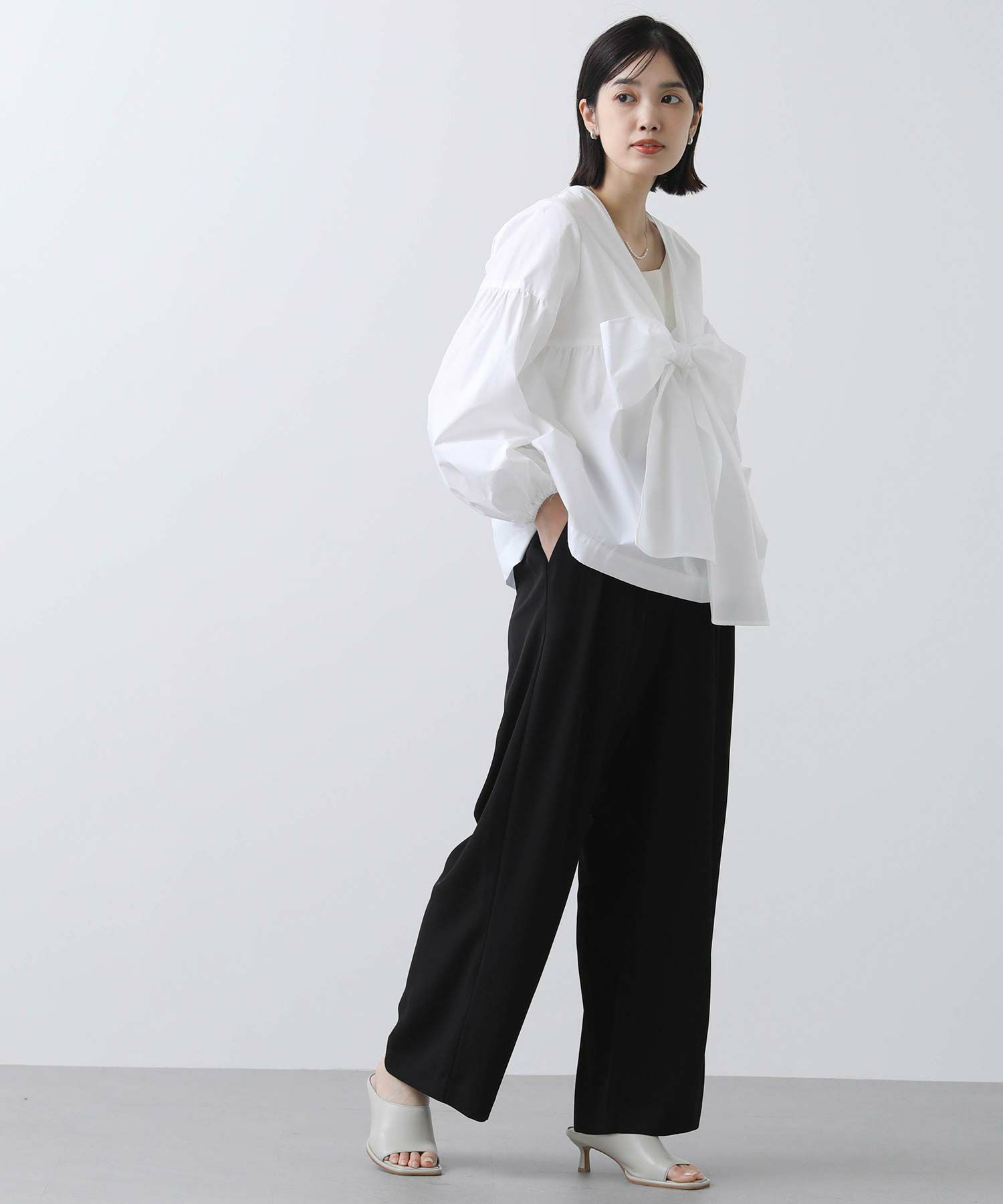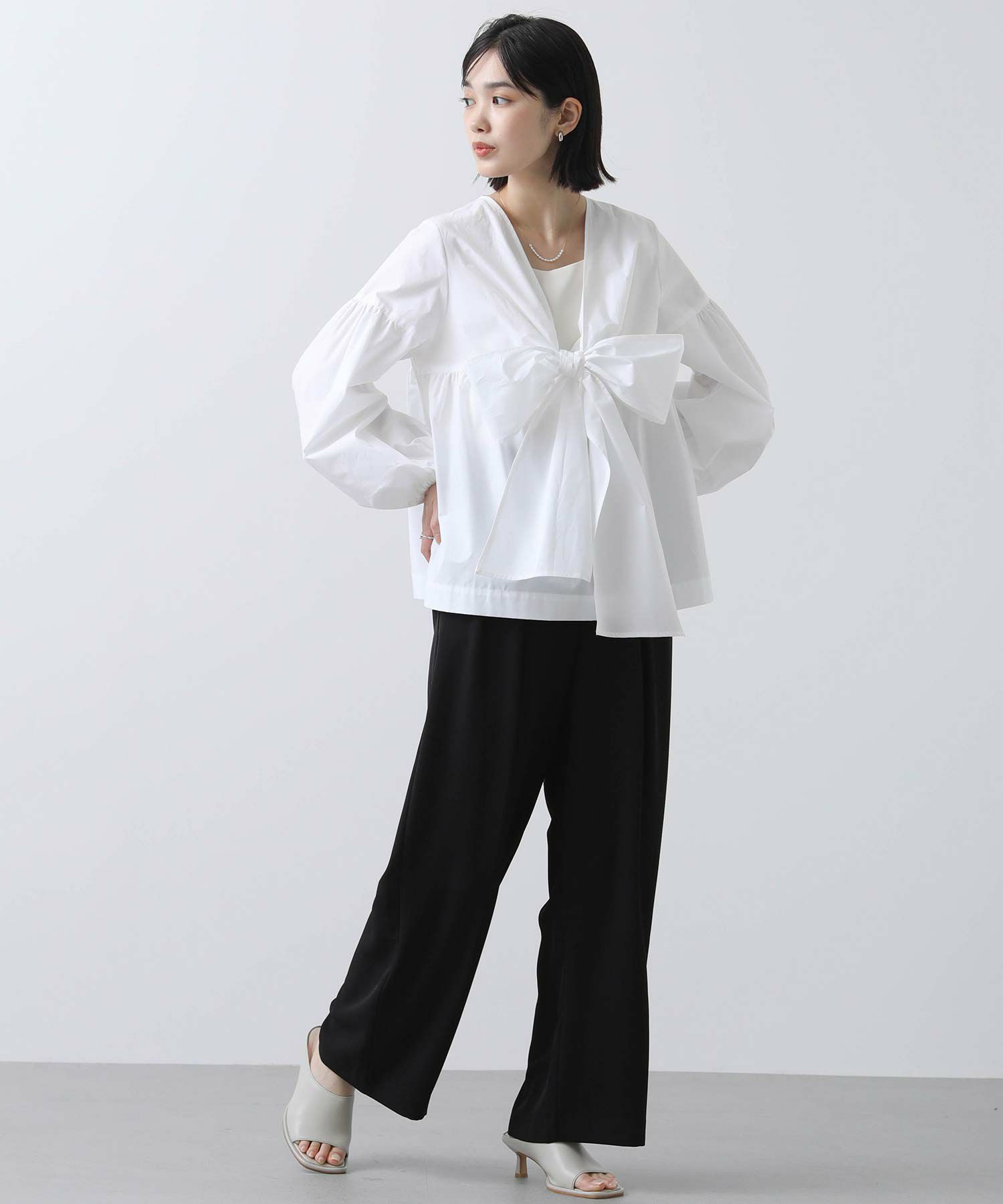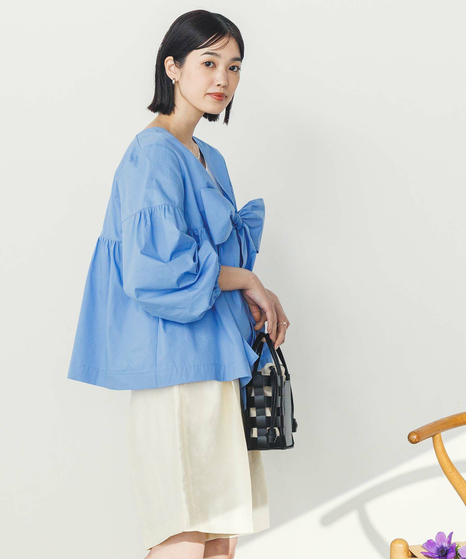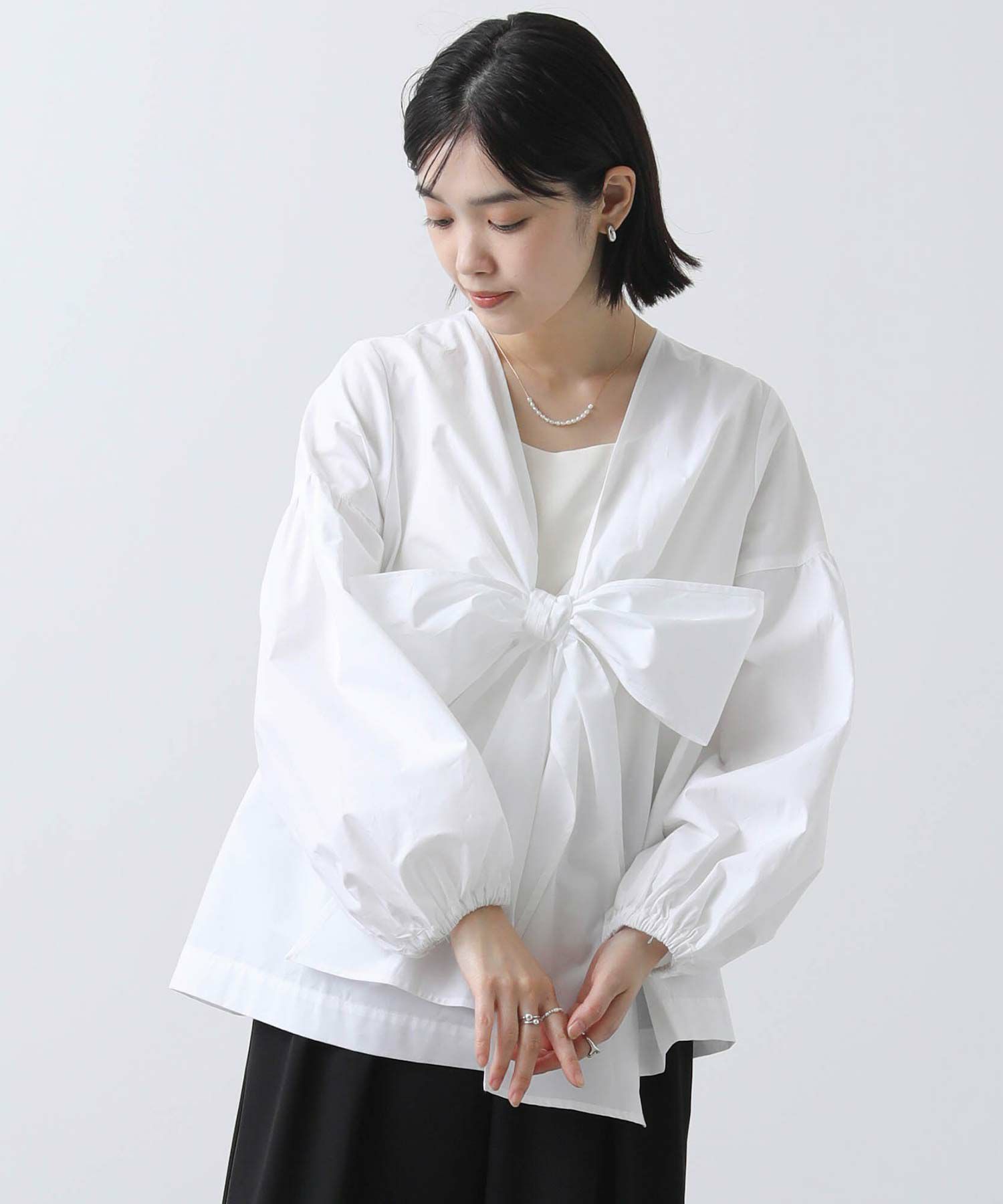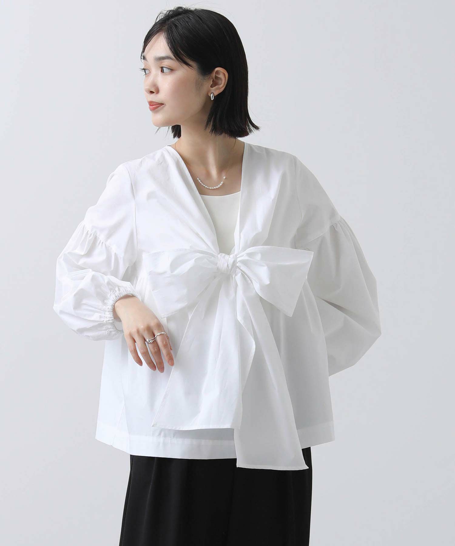 胸元の大きなリボンが旬なブラウス。