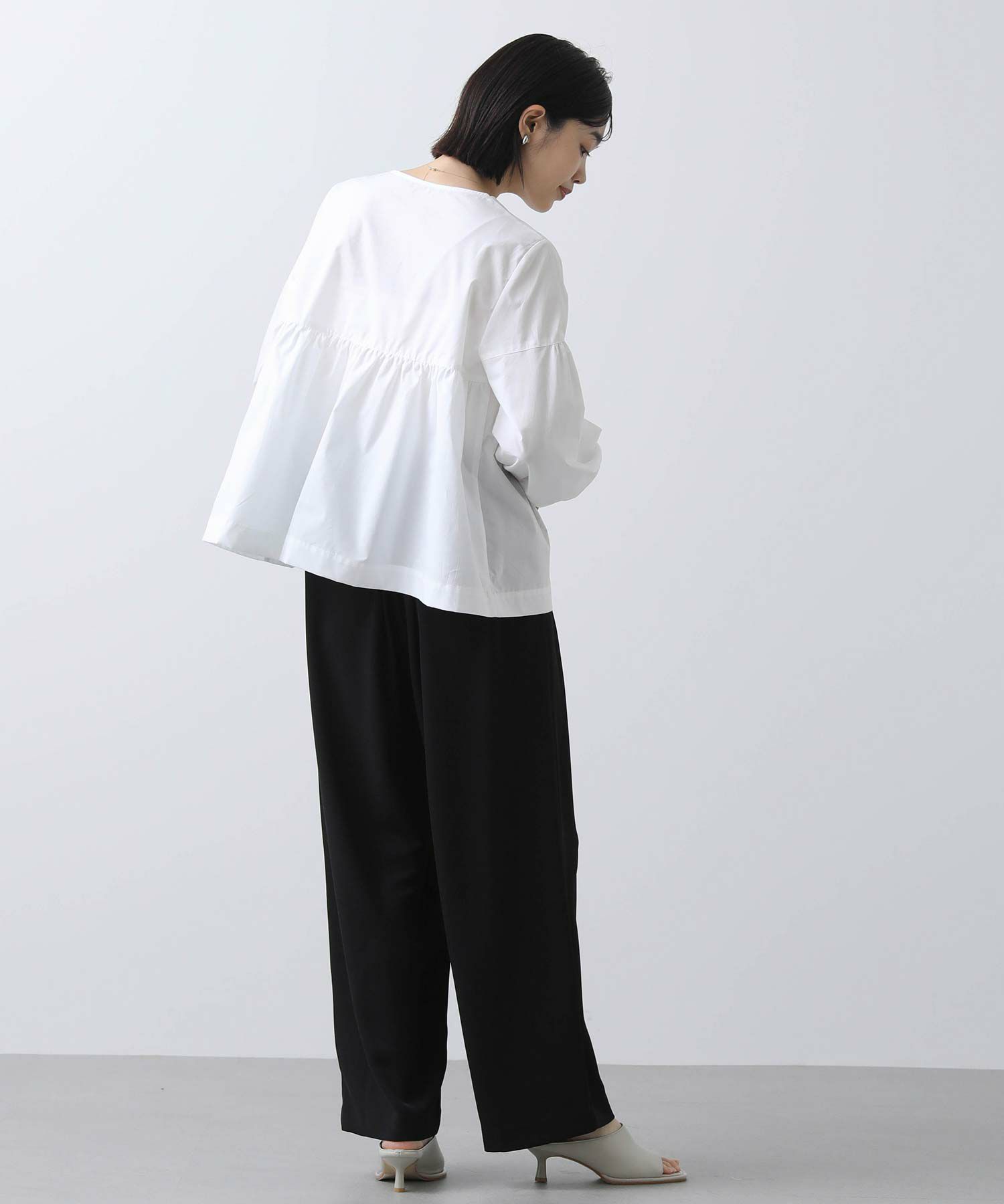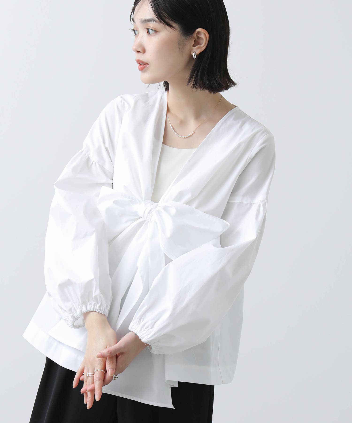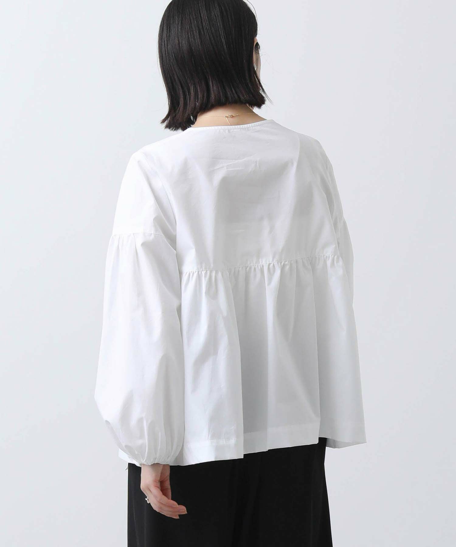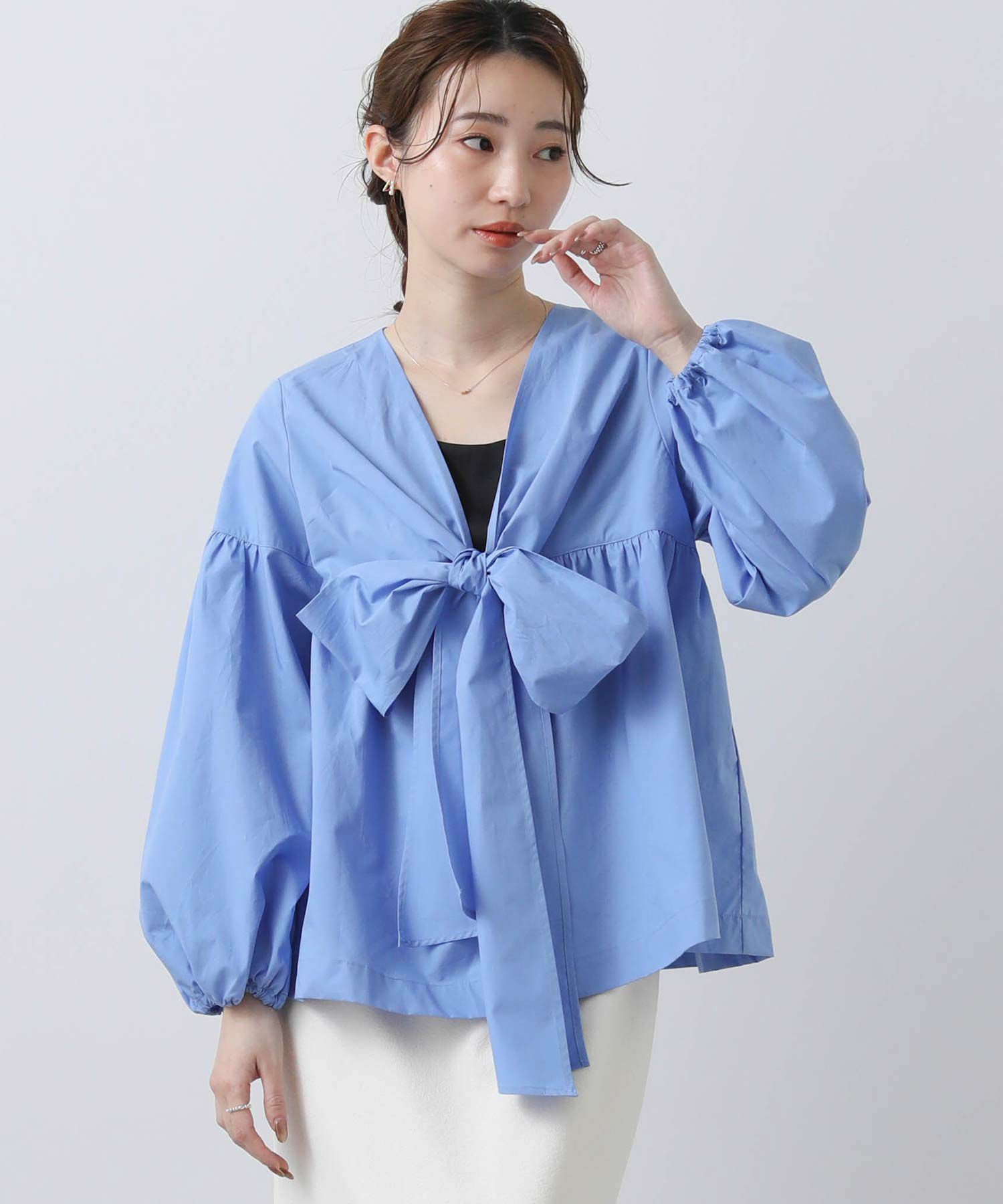 ボリュームスリーブと胸元の切替ギャザーが女性らしさをプラス。