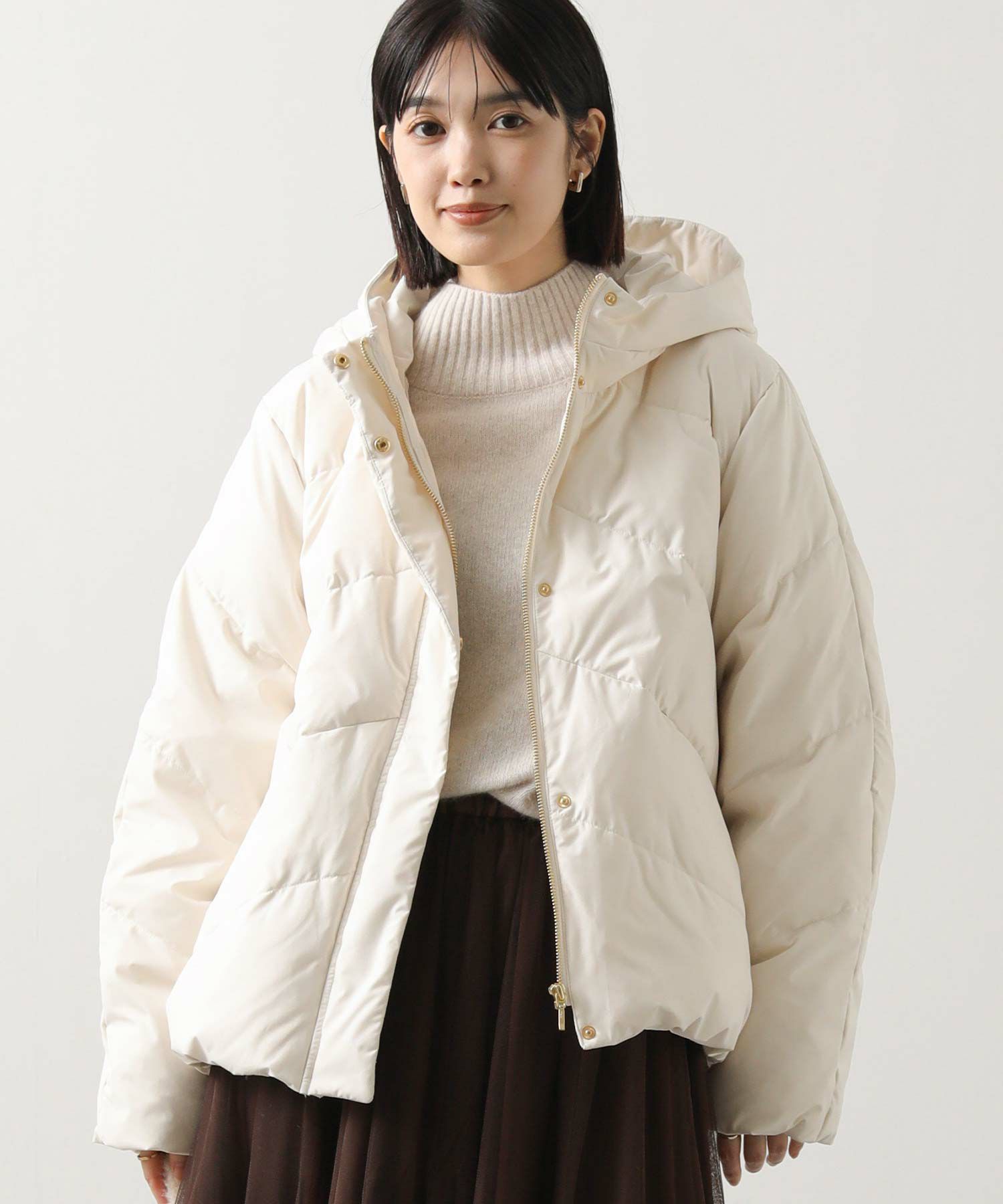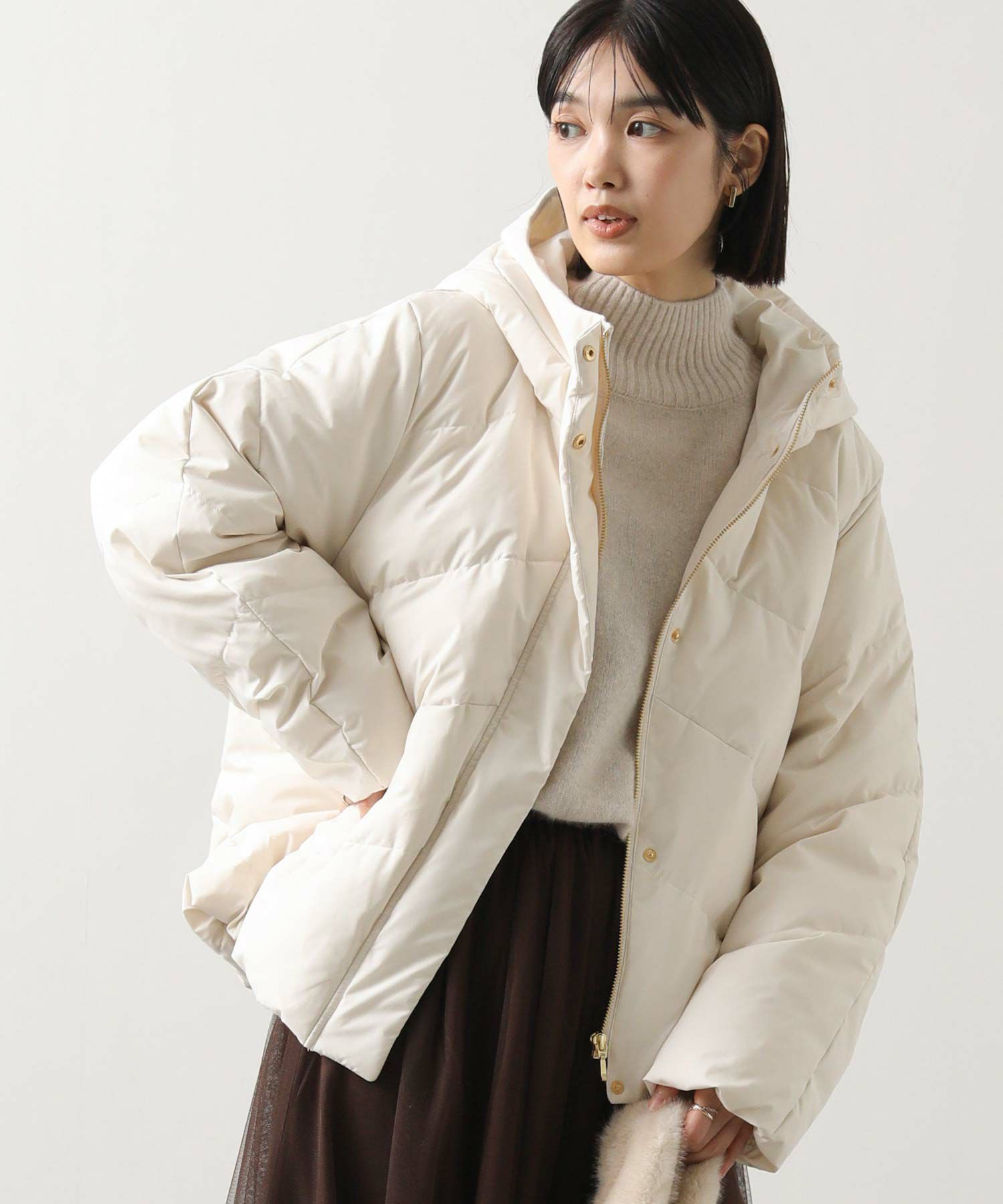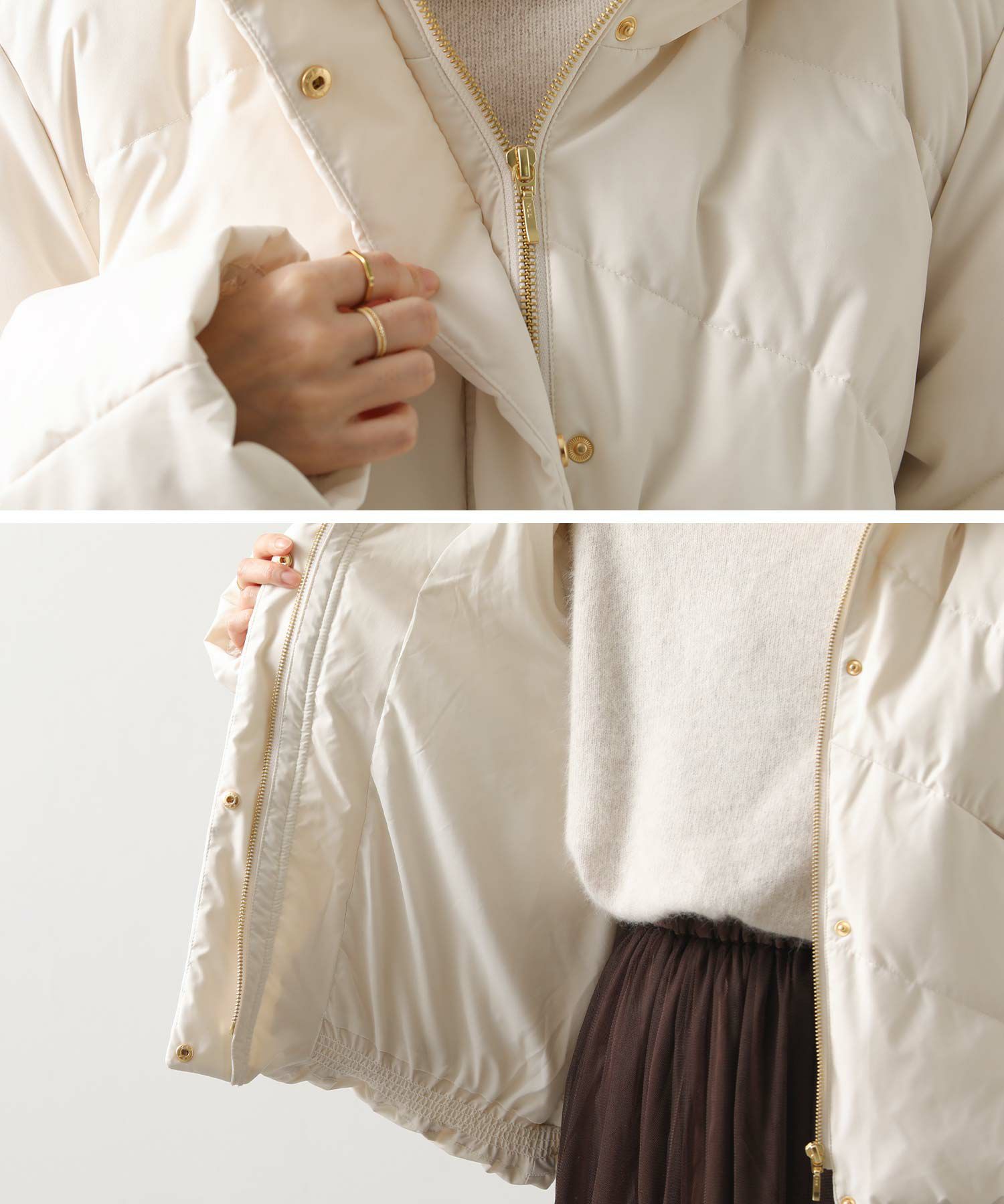 ふっくらと首元を包み込むボリュームのあるスタンドネックダウン。
