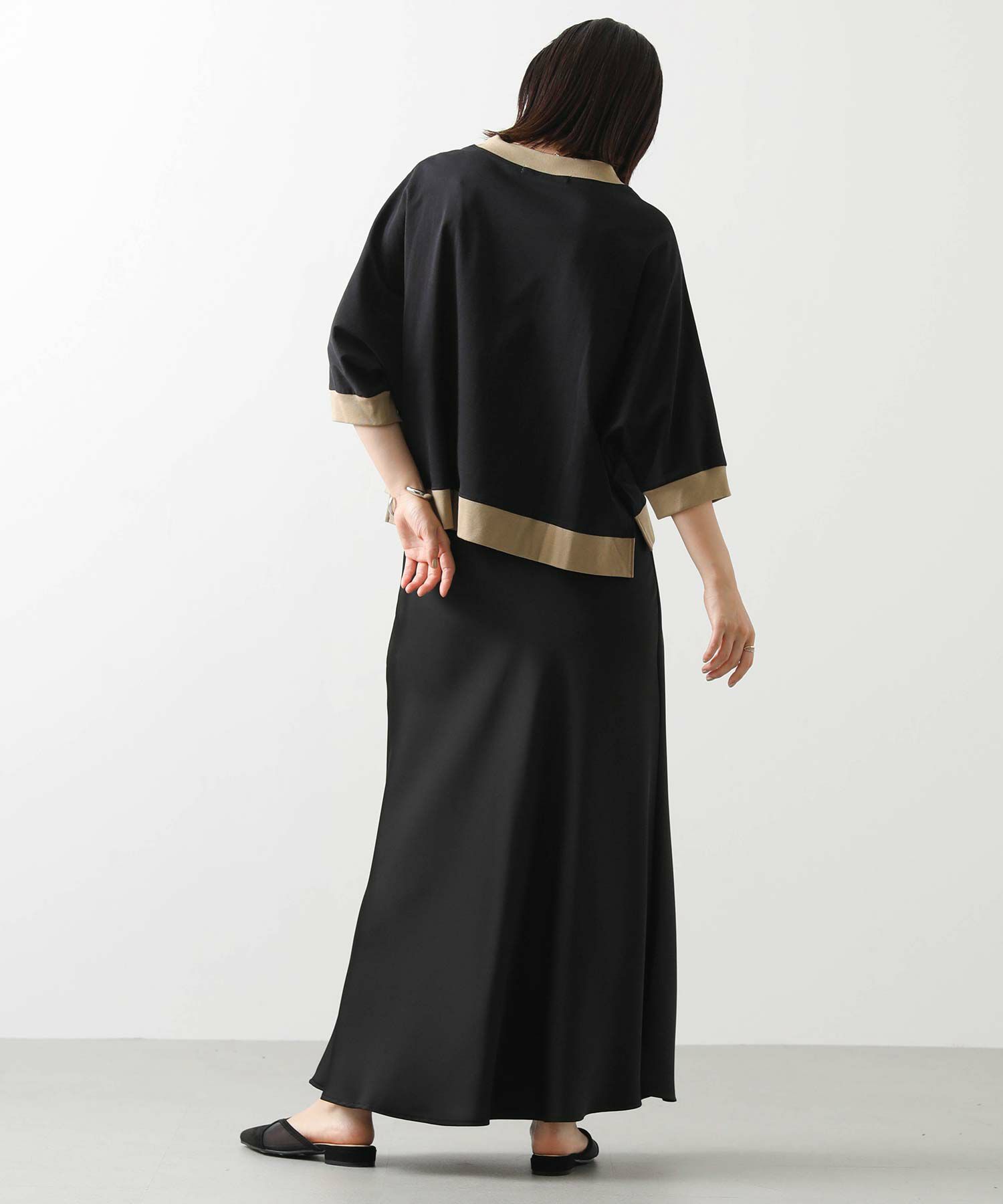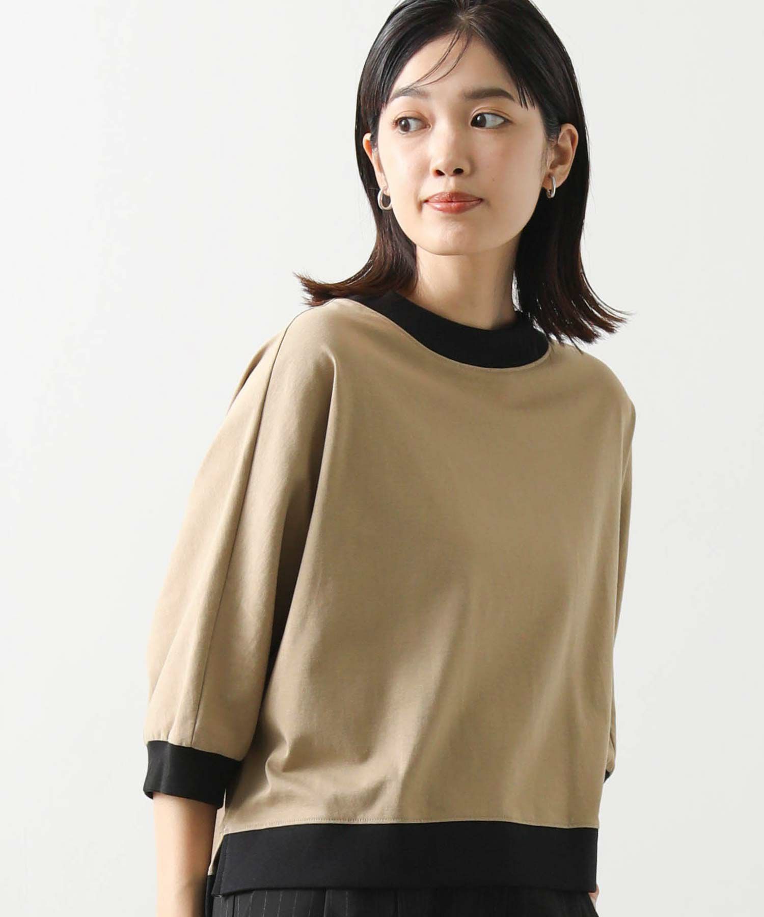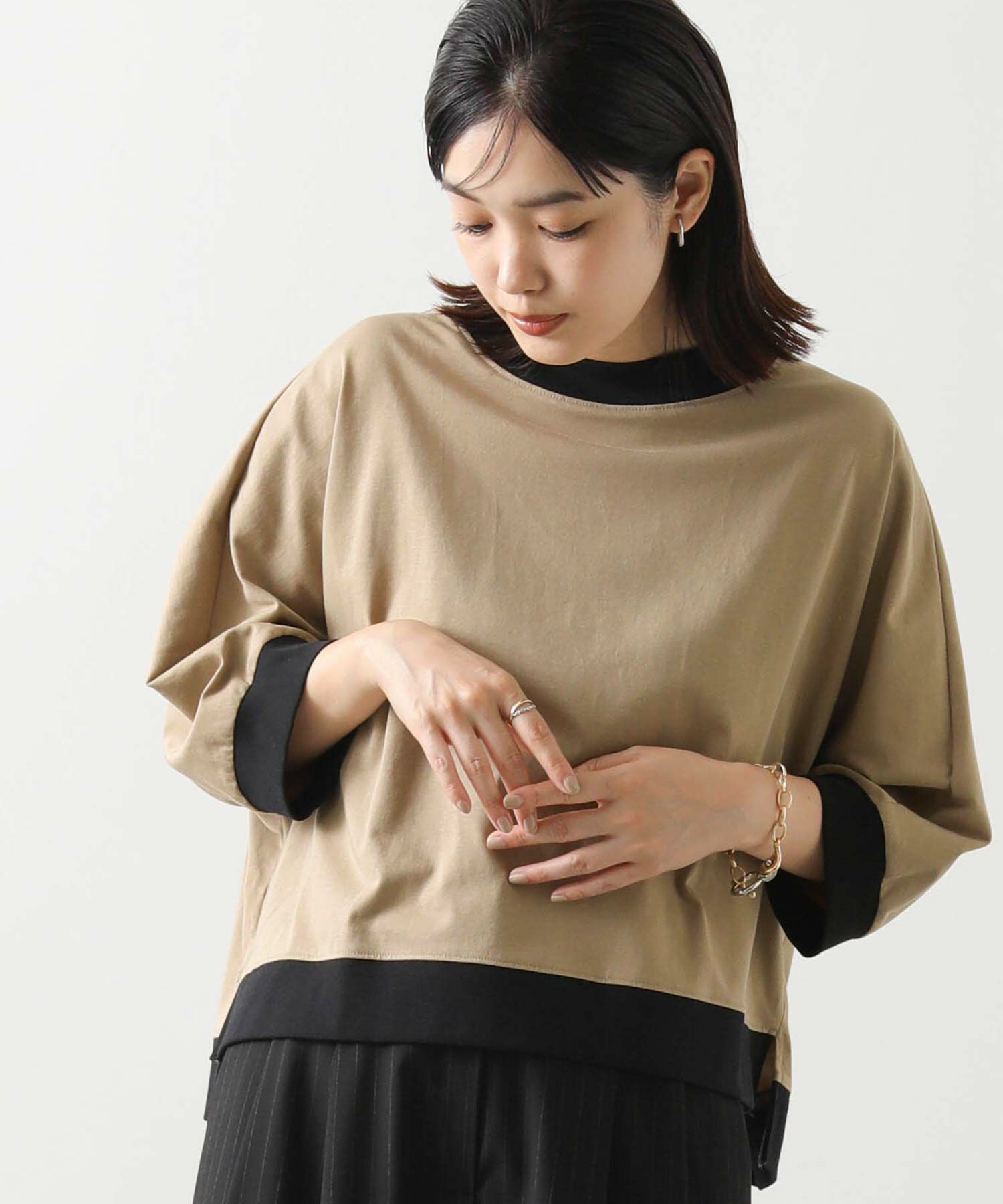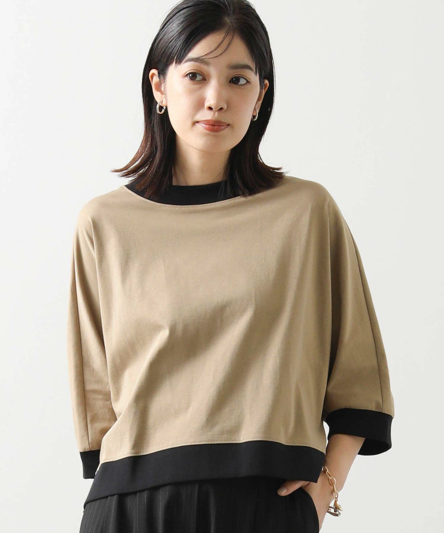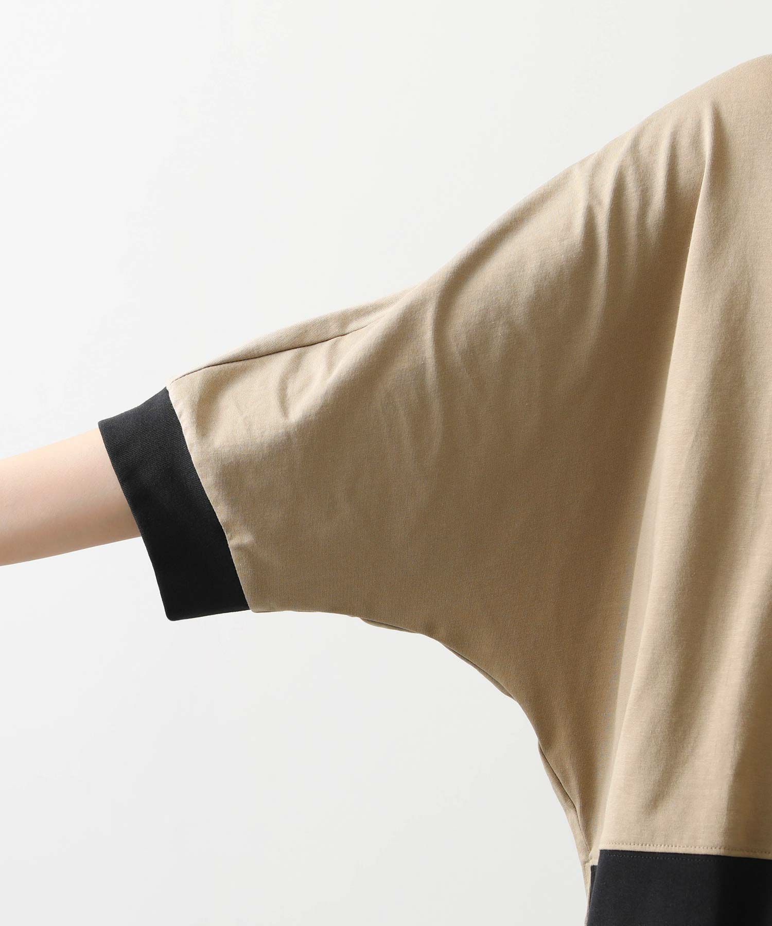身体から離れるゆとりのあるドルマンシルエットで、気になる二の腕から肘をカバーしてくれる袖丈。