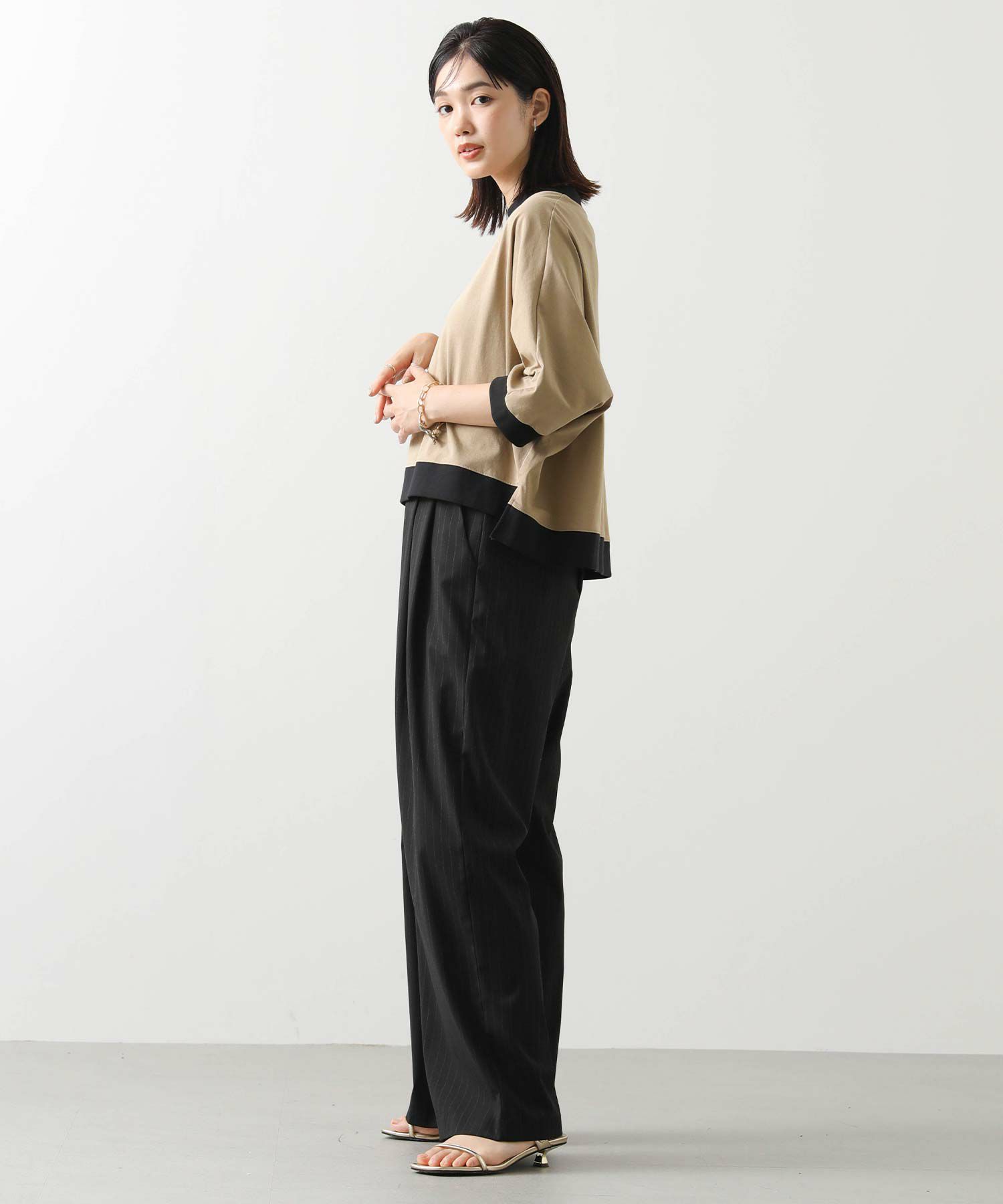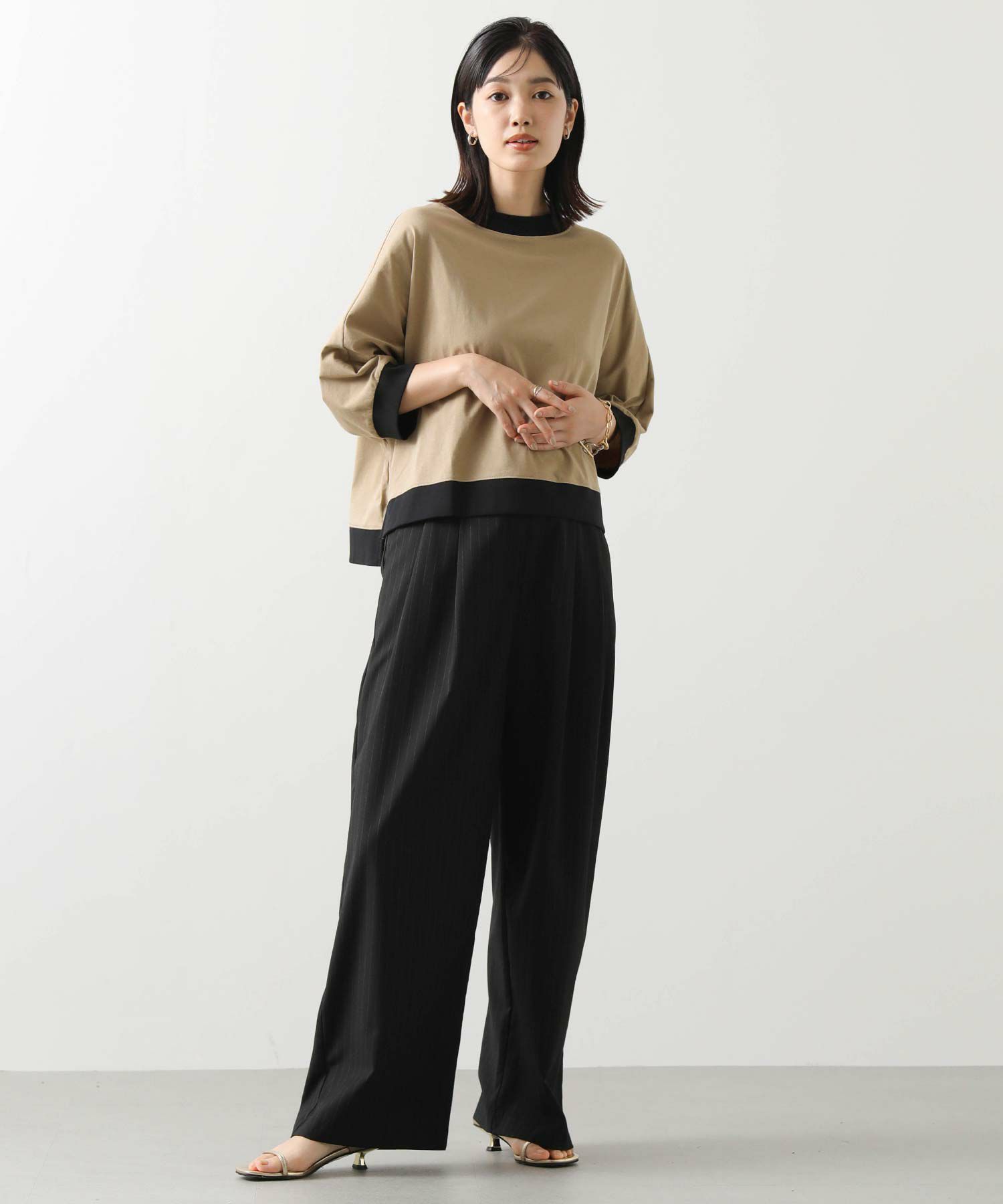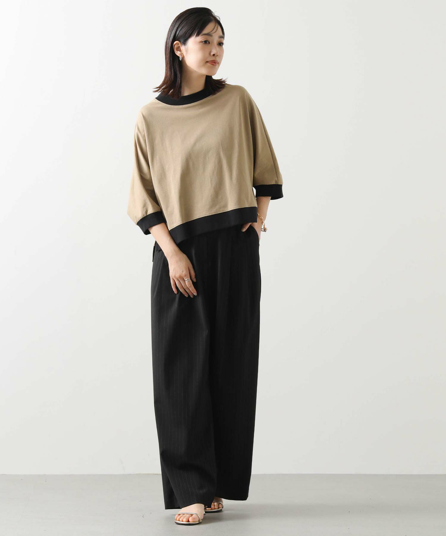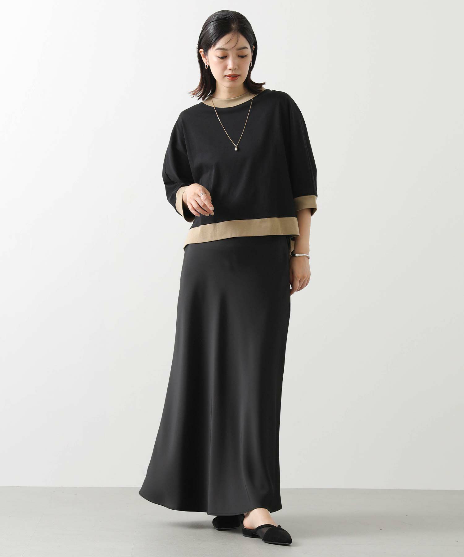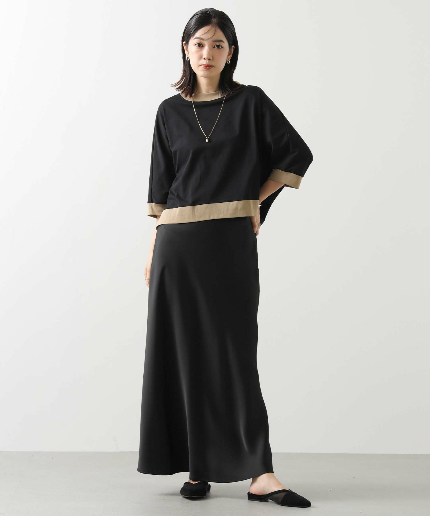身体から離れるゆとりのあるドルマンシルエットで、気になる二の腕から肘をカバーしてくれる袖丈。