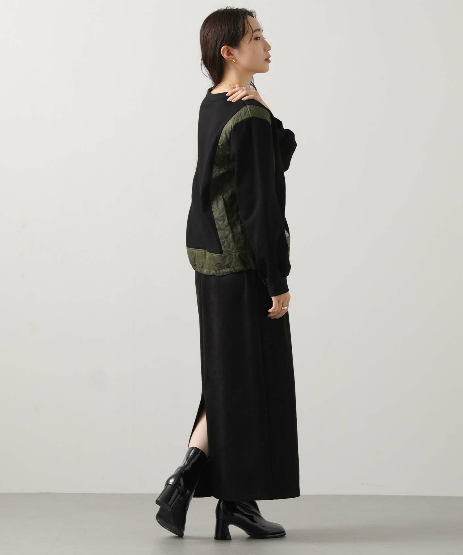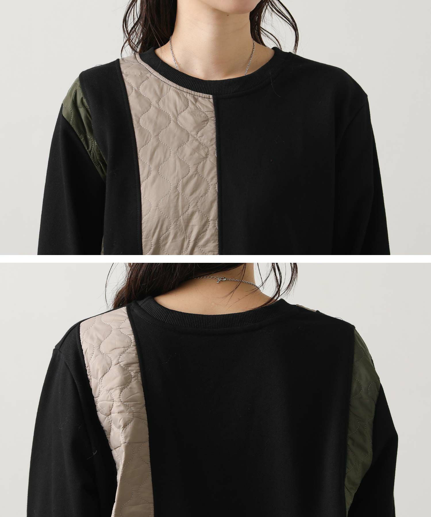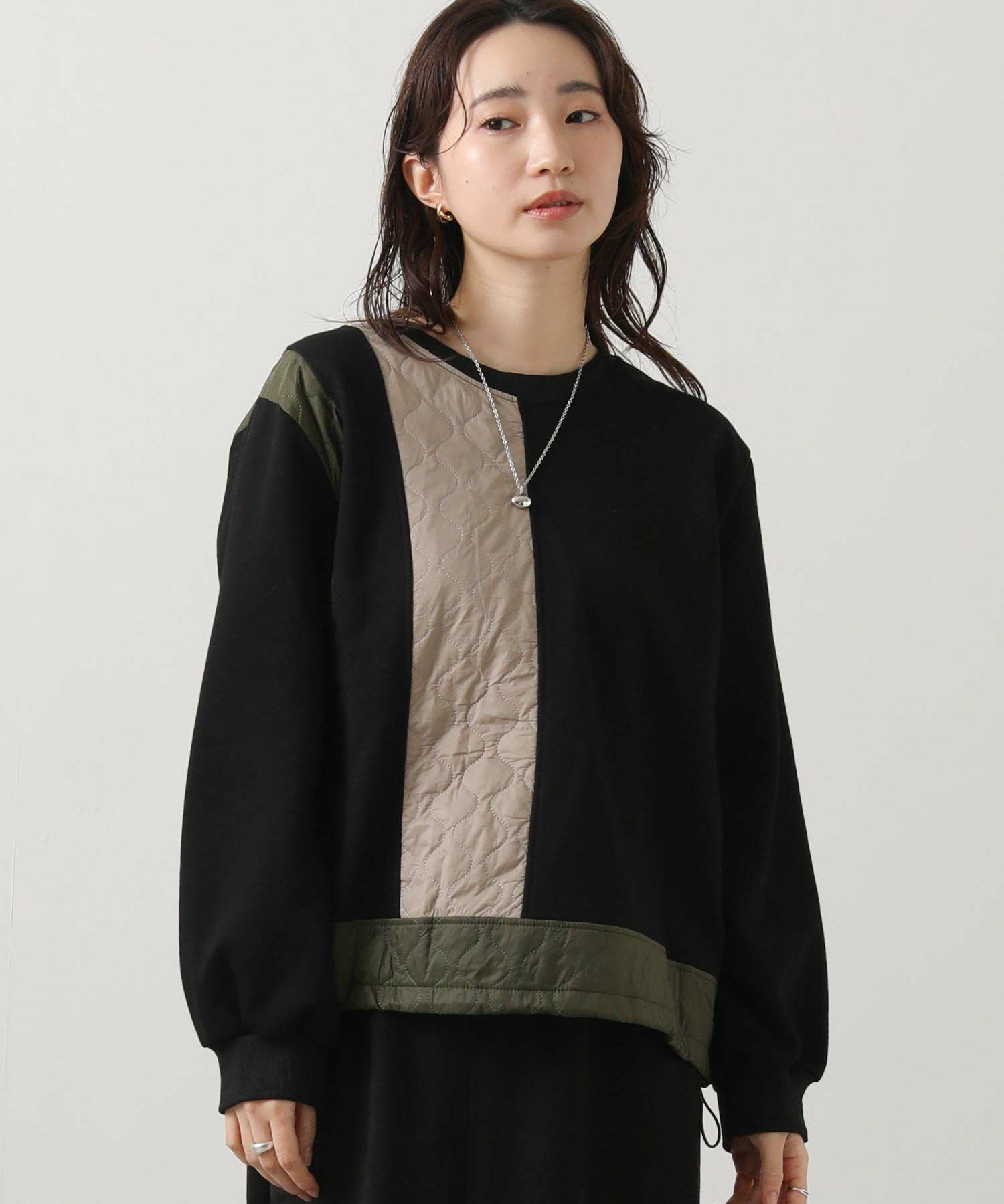 異素材を組み合わせたデザインが目を引く、切り替えプルオーバー。