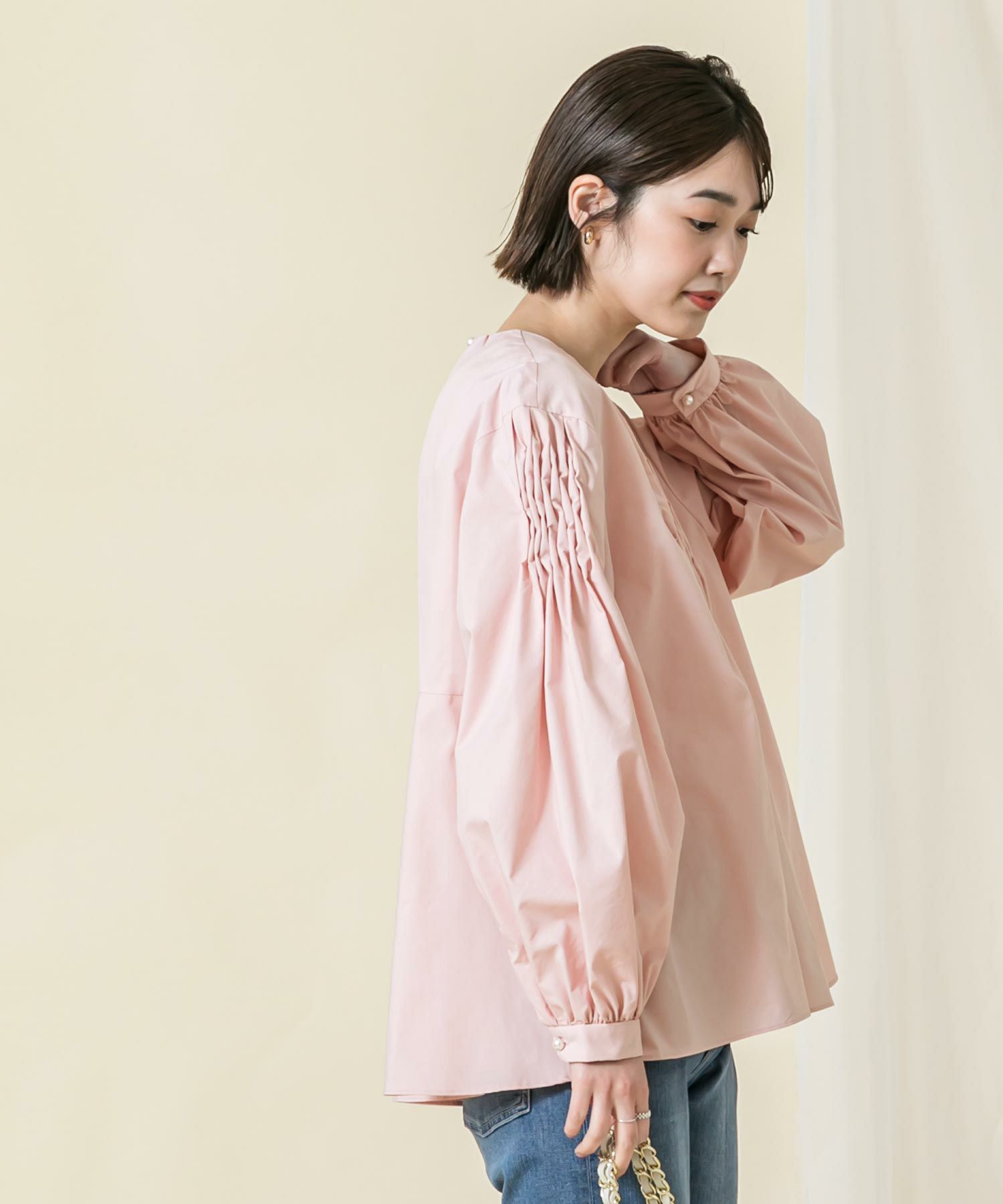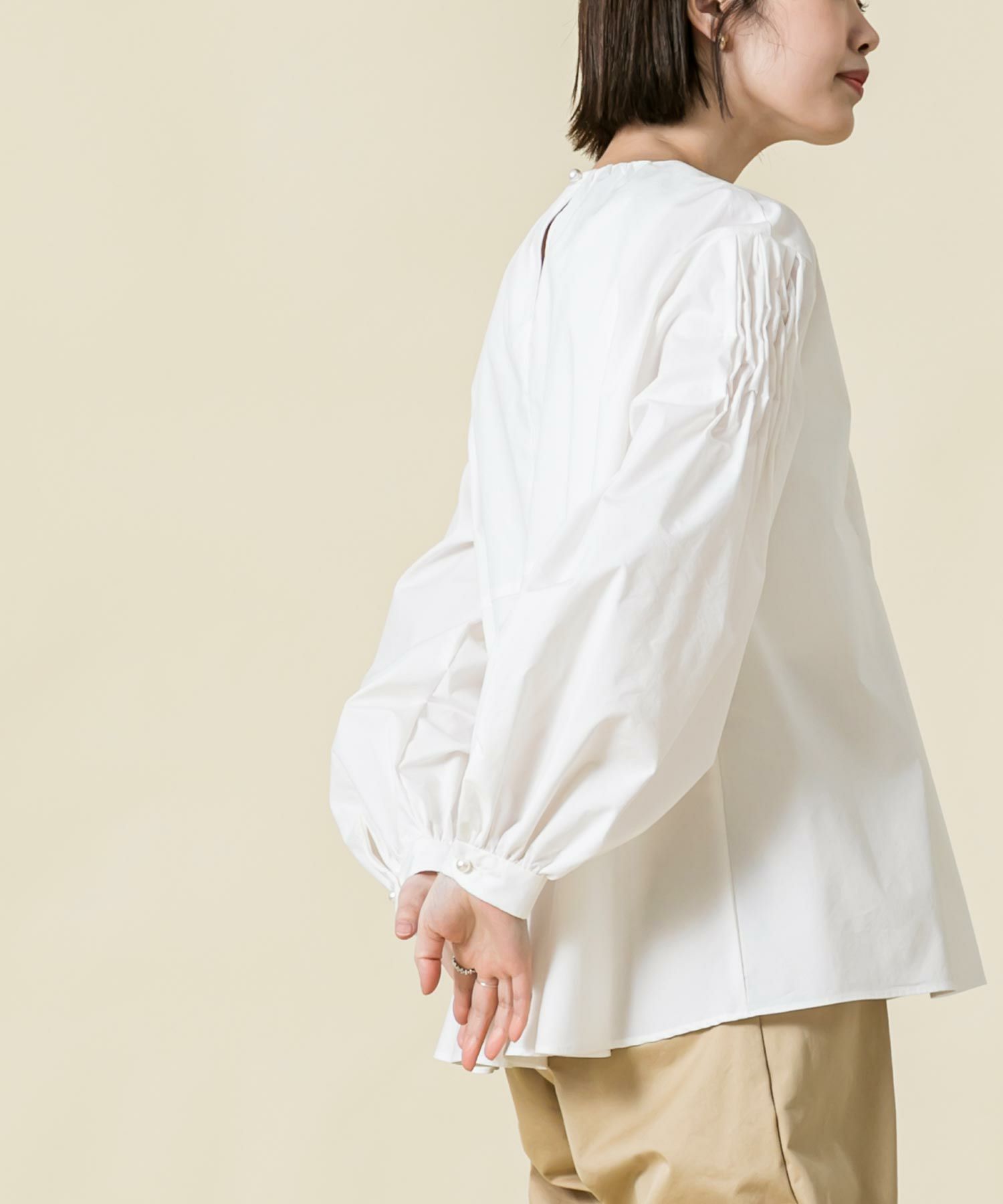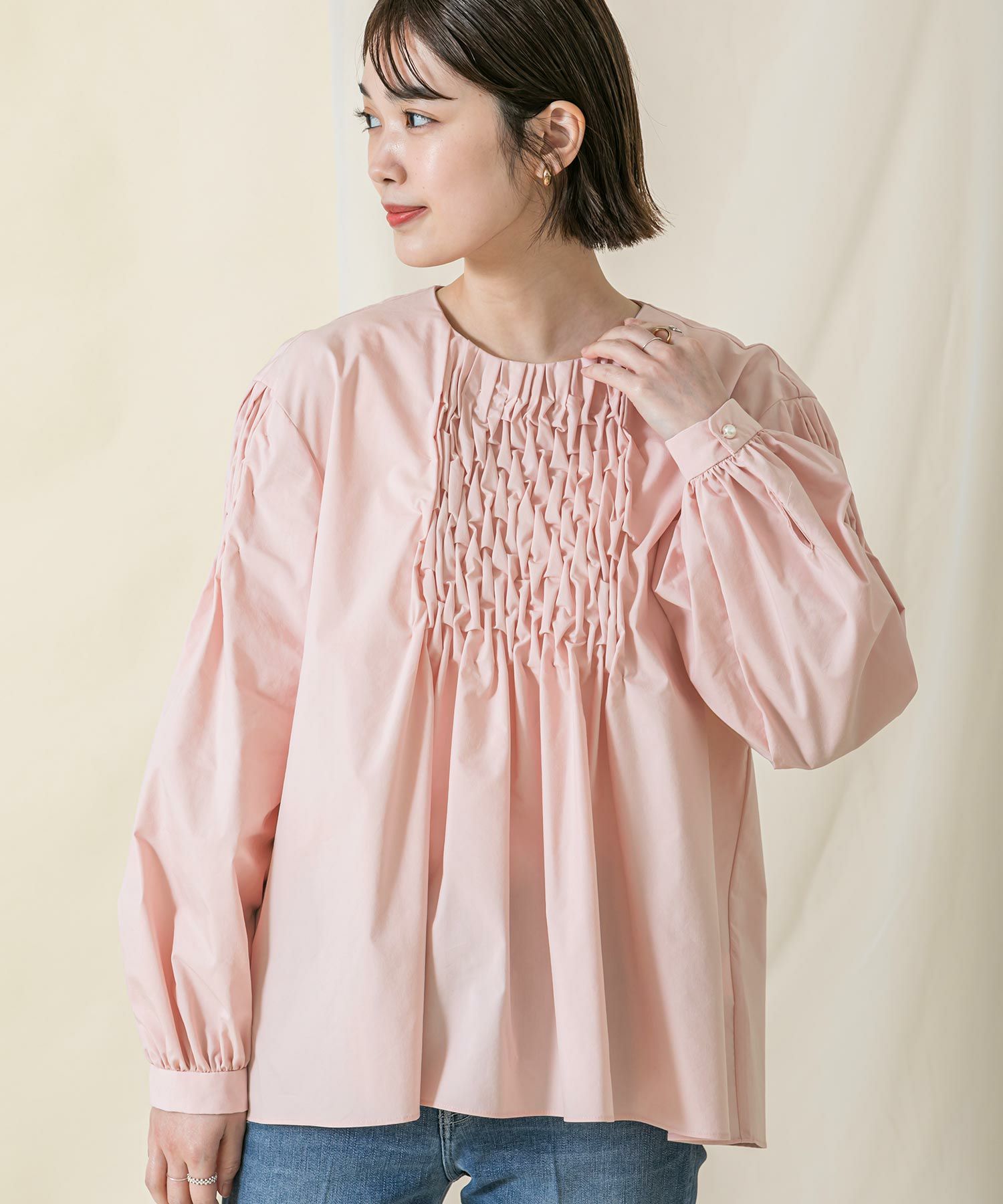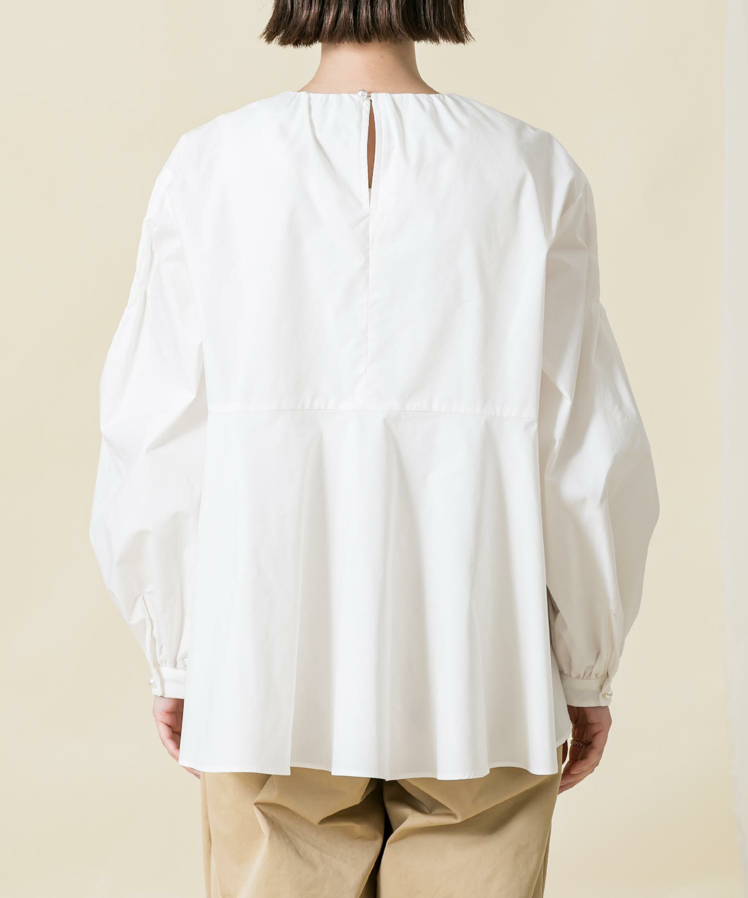 身頃のスモック刺繡を活かし裾に向かいAラインに広がるシルエットに、袖は刺繡を入れることで程よいボリュームがポイントに。袖口と後中心のパール釦がアクセントになっています。