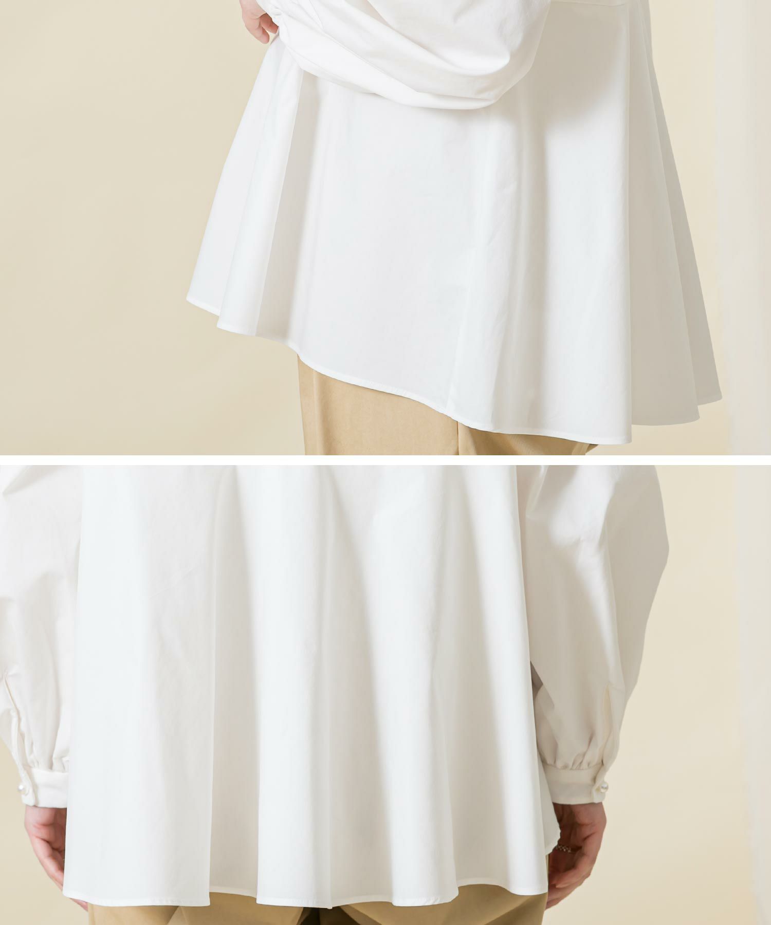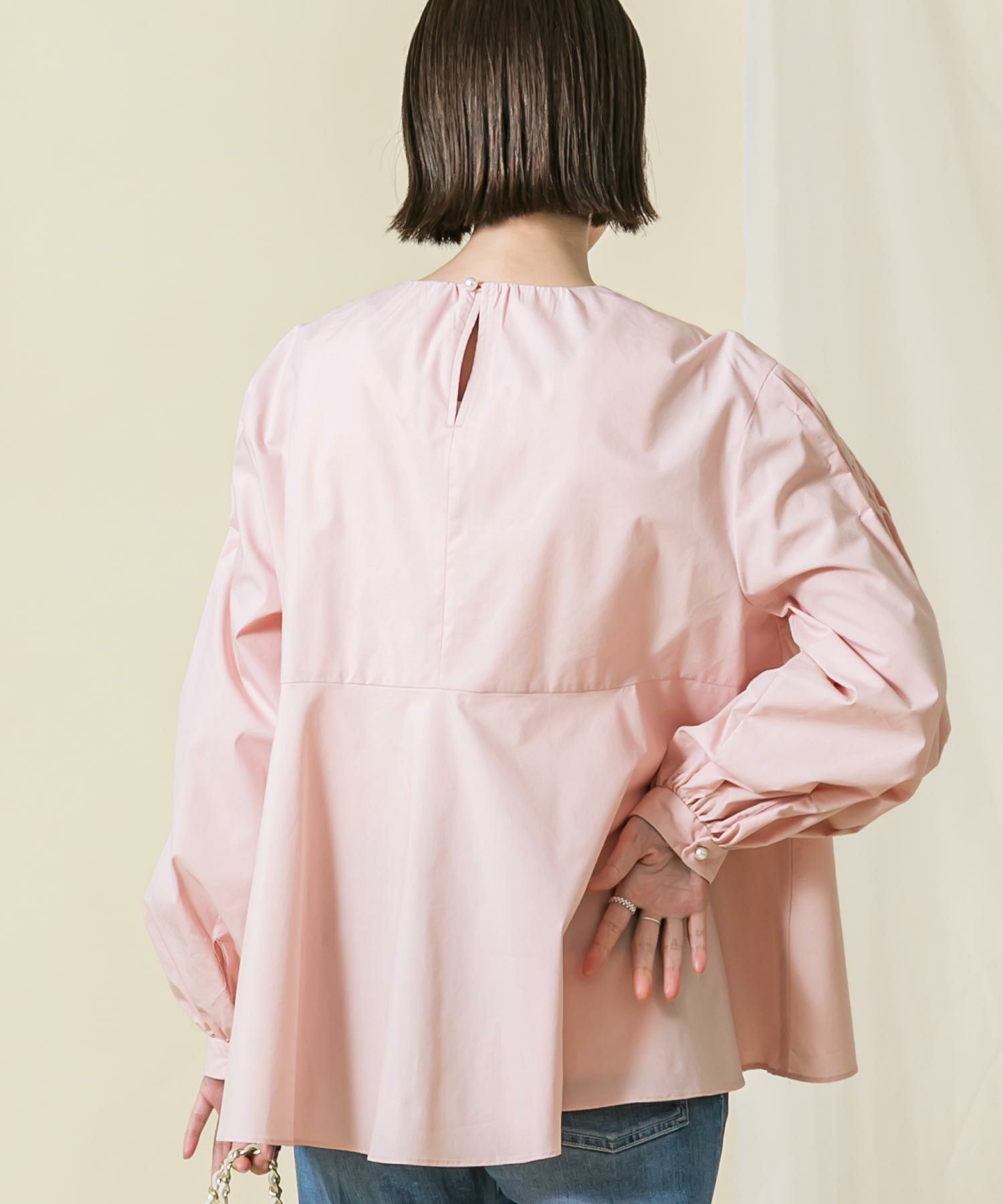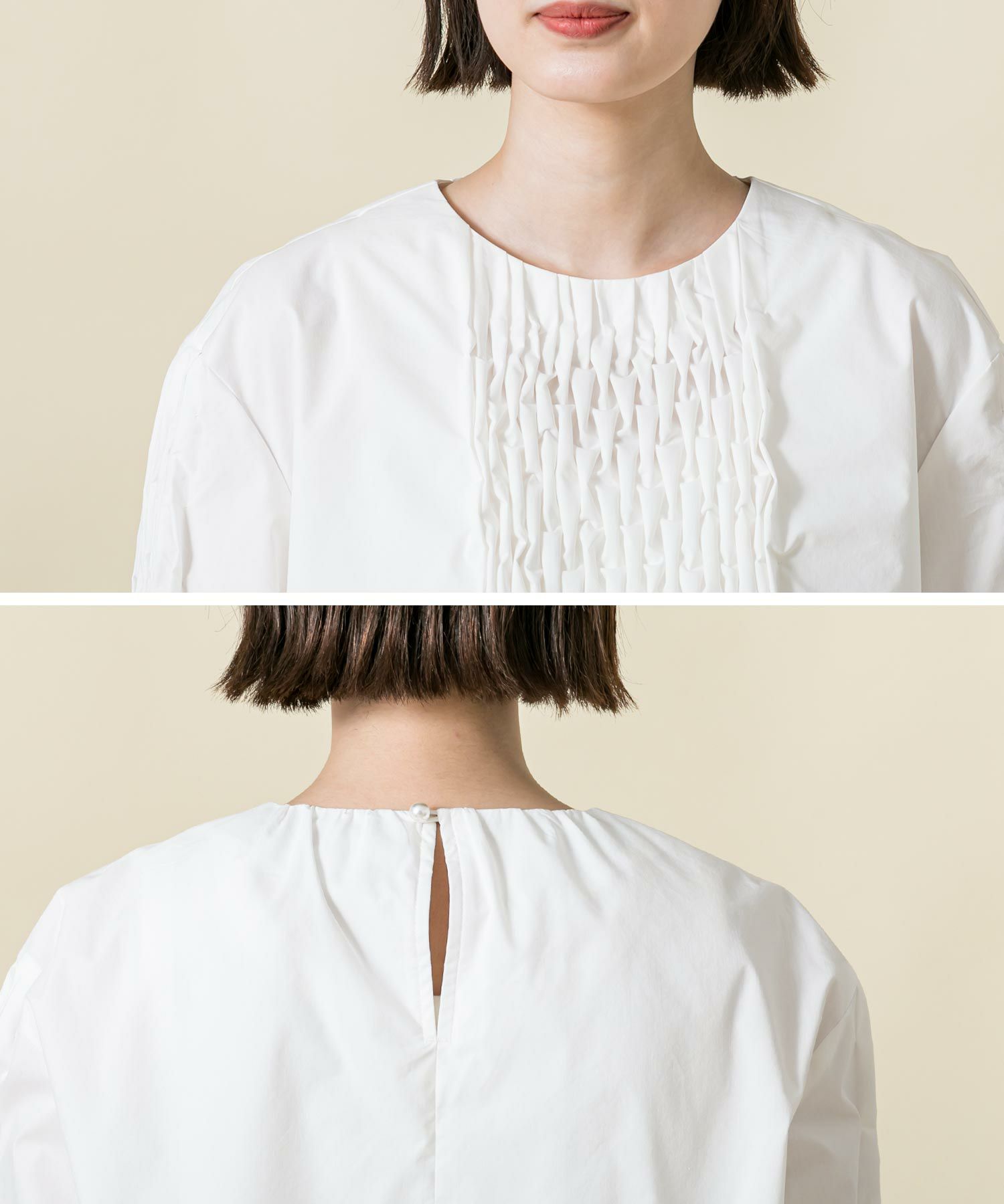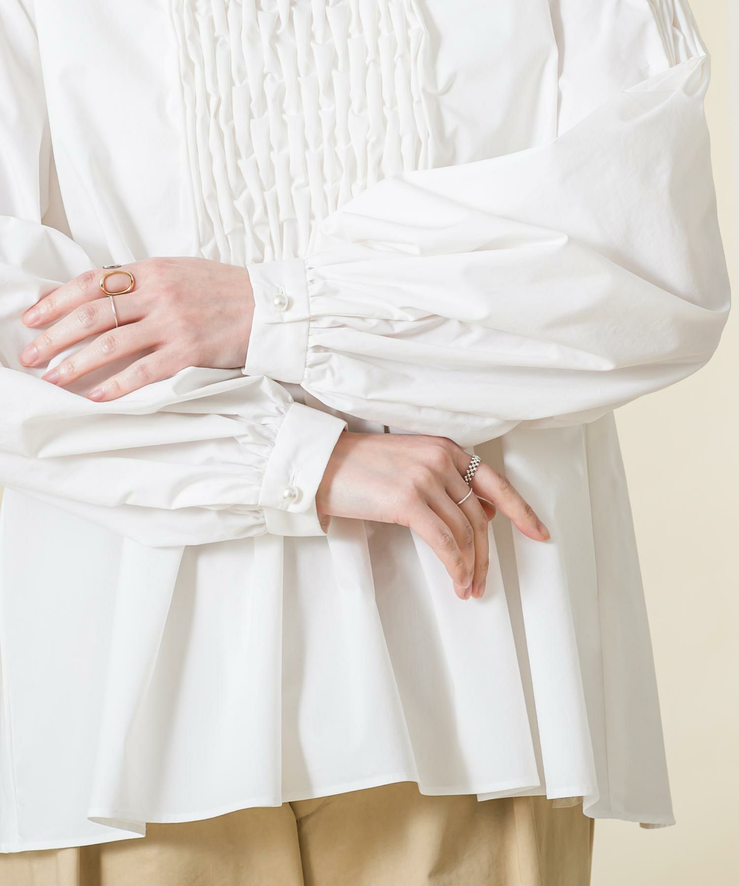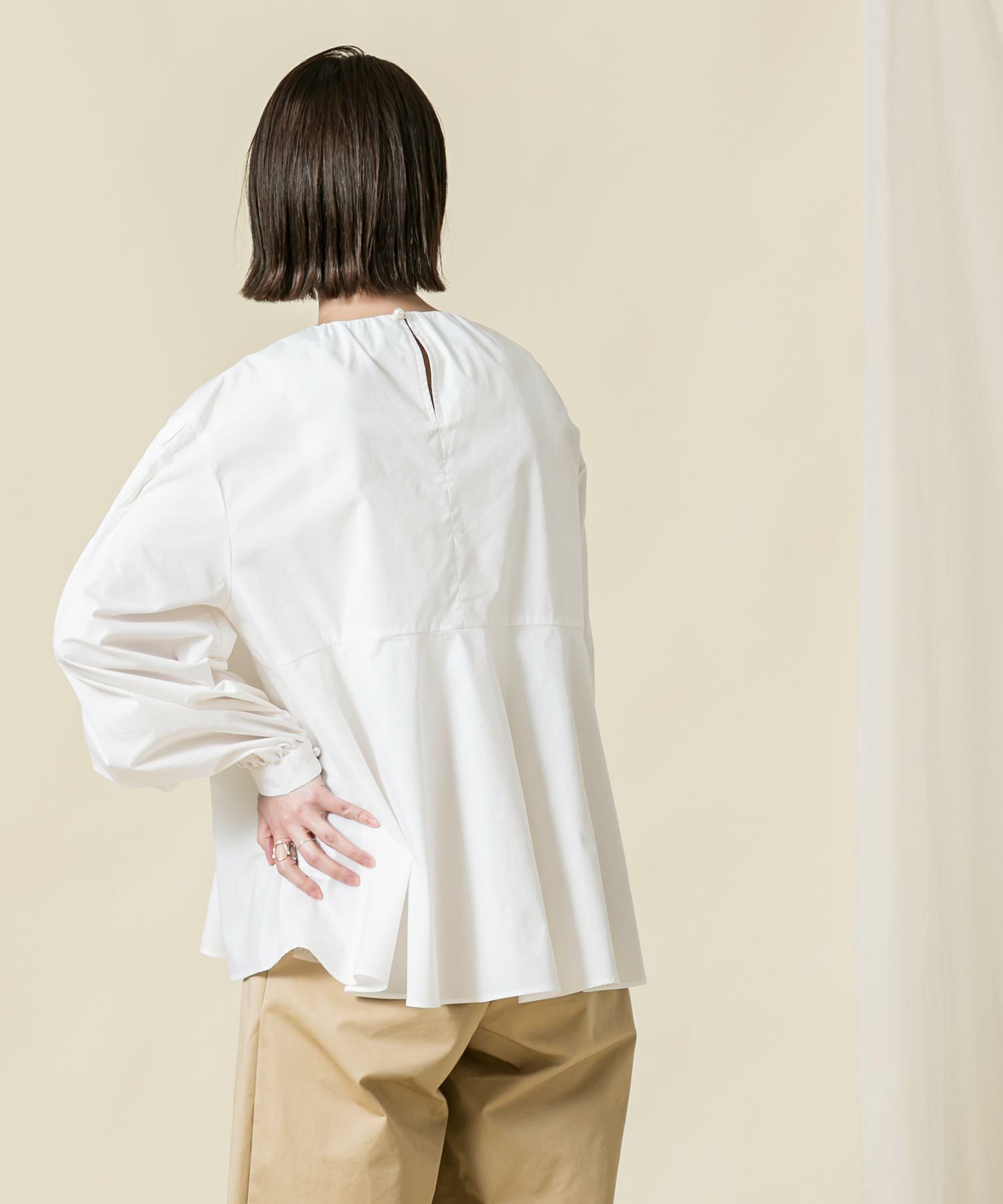 身頃のスモック刺繡を活かし裾に向かいAラインに広がるシルエットに、袖は刺繡を入れることで程よいボリュームがポイントに。袖口と後中心のパール釦がアクセントになっています。