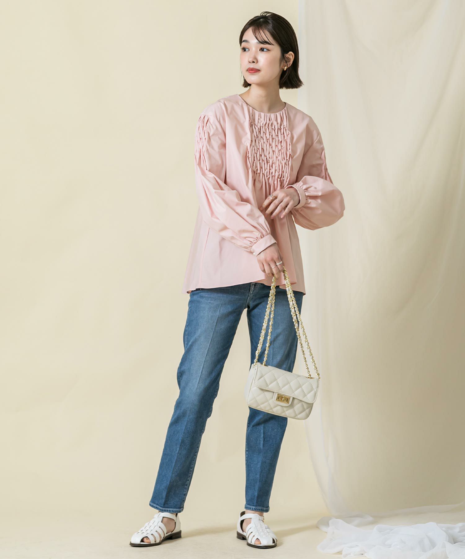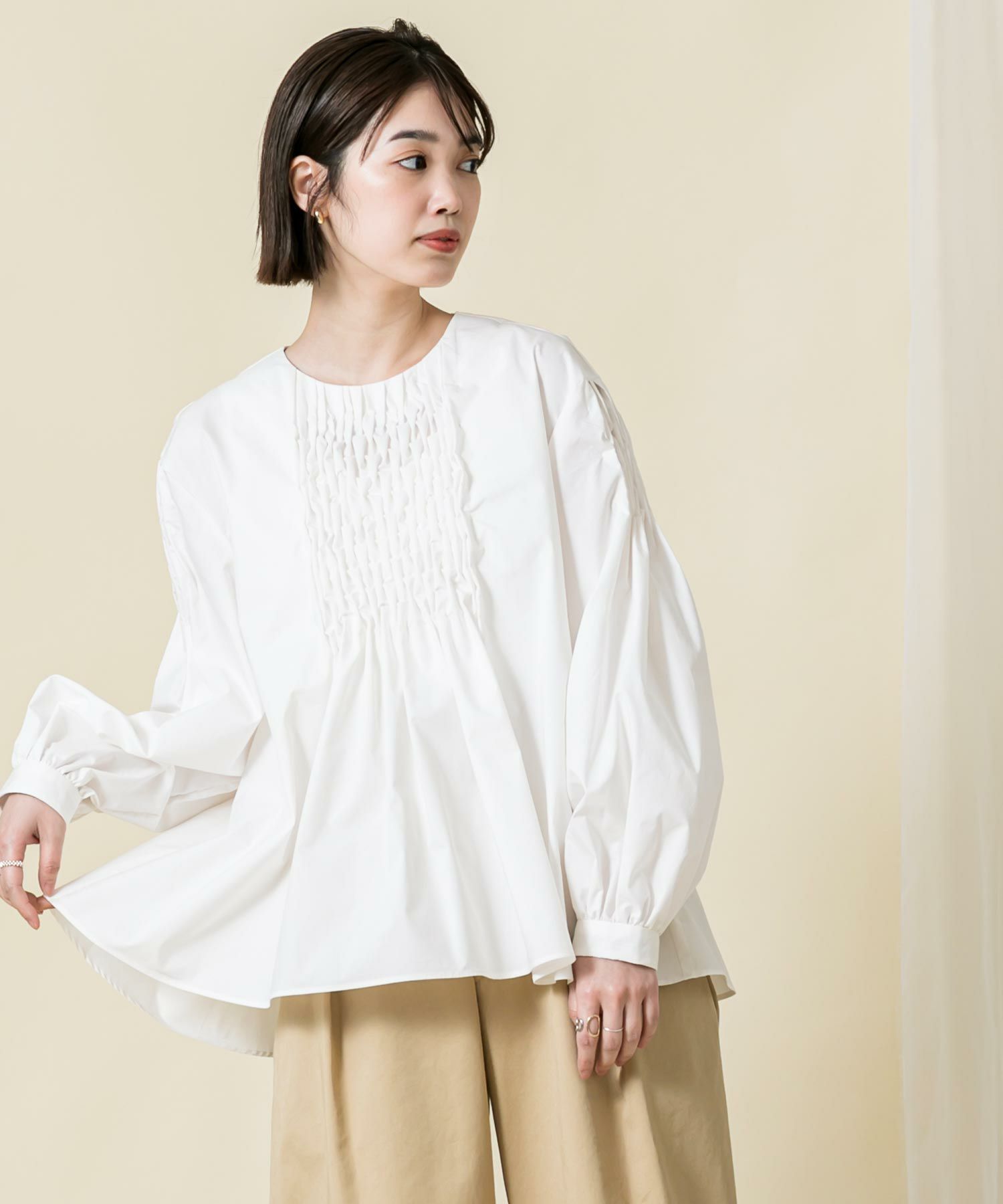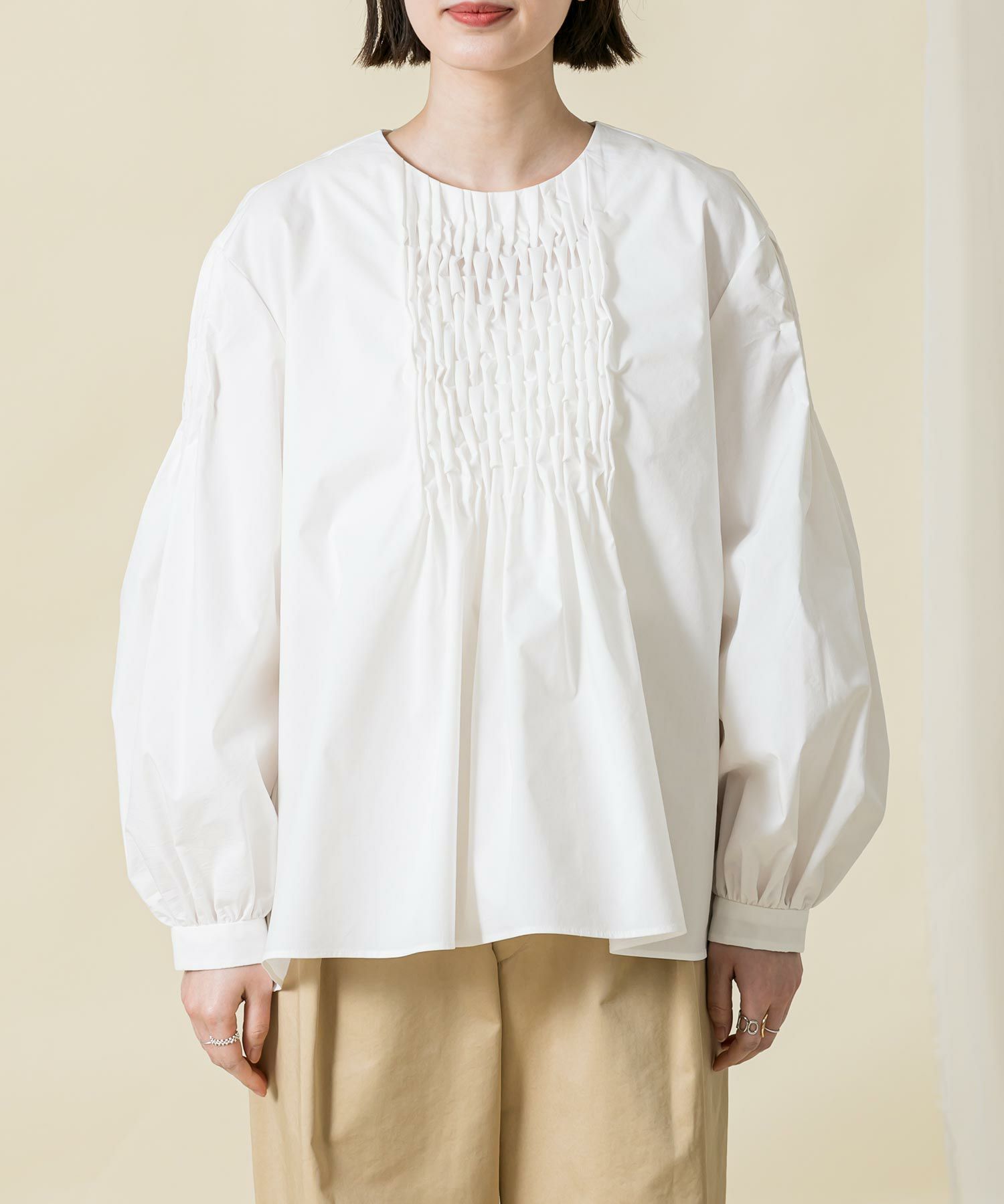 【SONO (ソーノ)】から、アイコニックな“手仕事”ブラウスをセレクト。職人が“一針一針”丁寧に身頃と袖中心にスモック刺繍を施し、シンプルなボディに華やかさを添えた1枚。