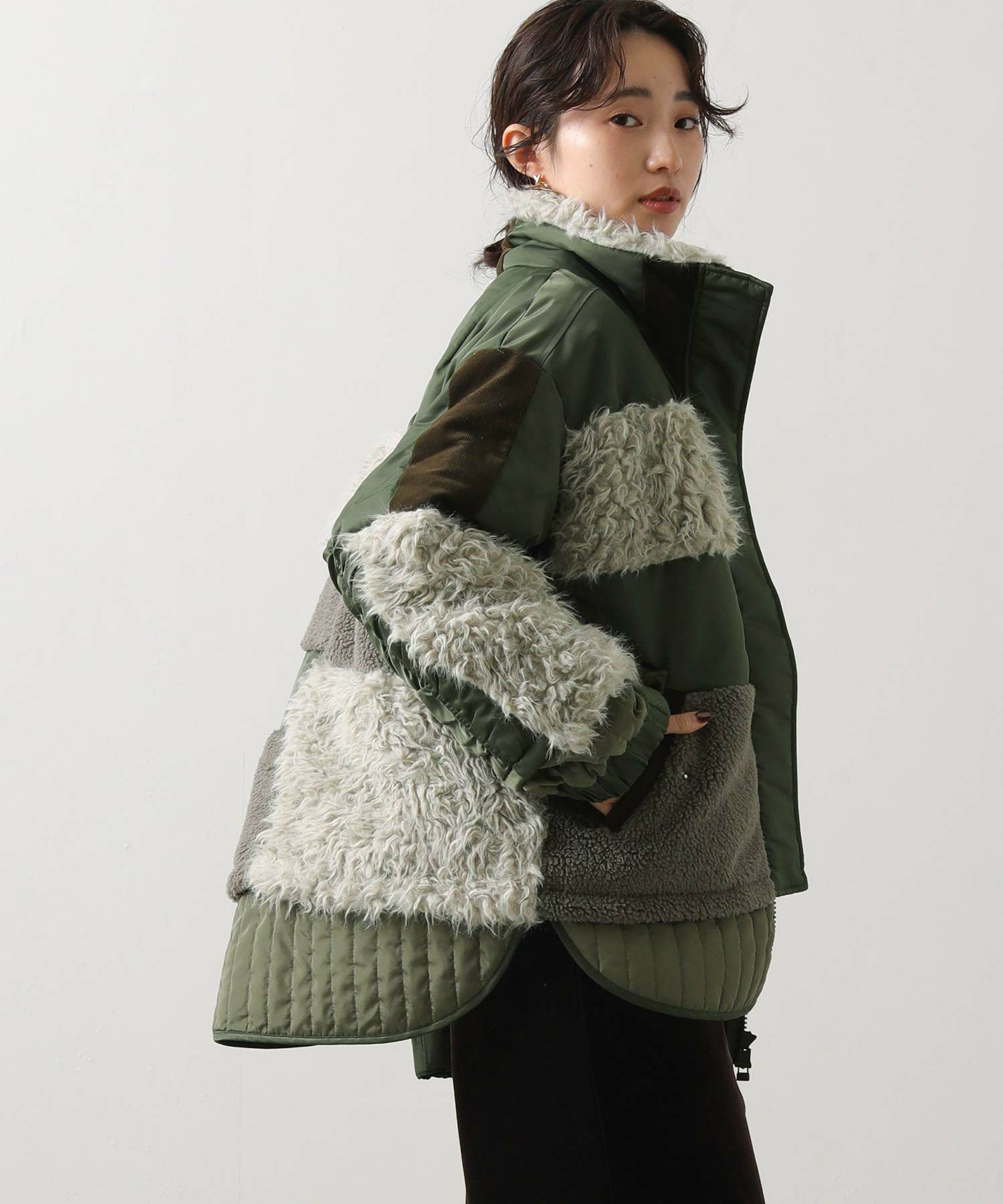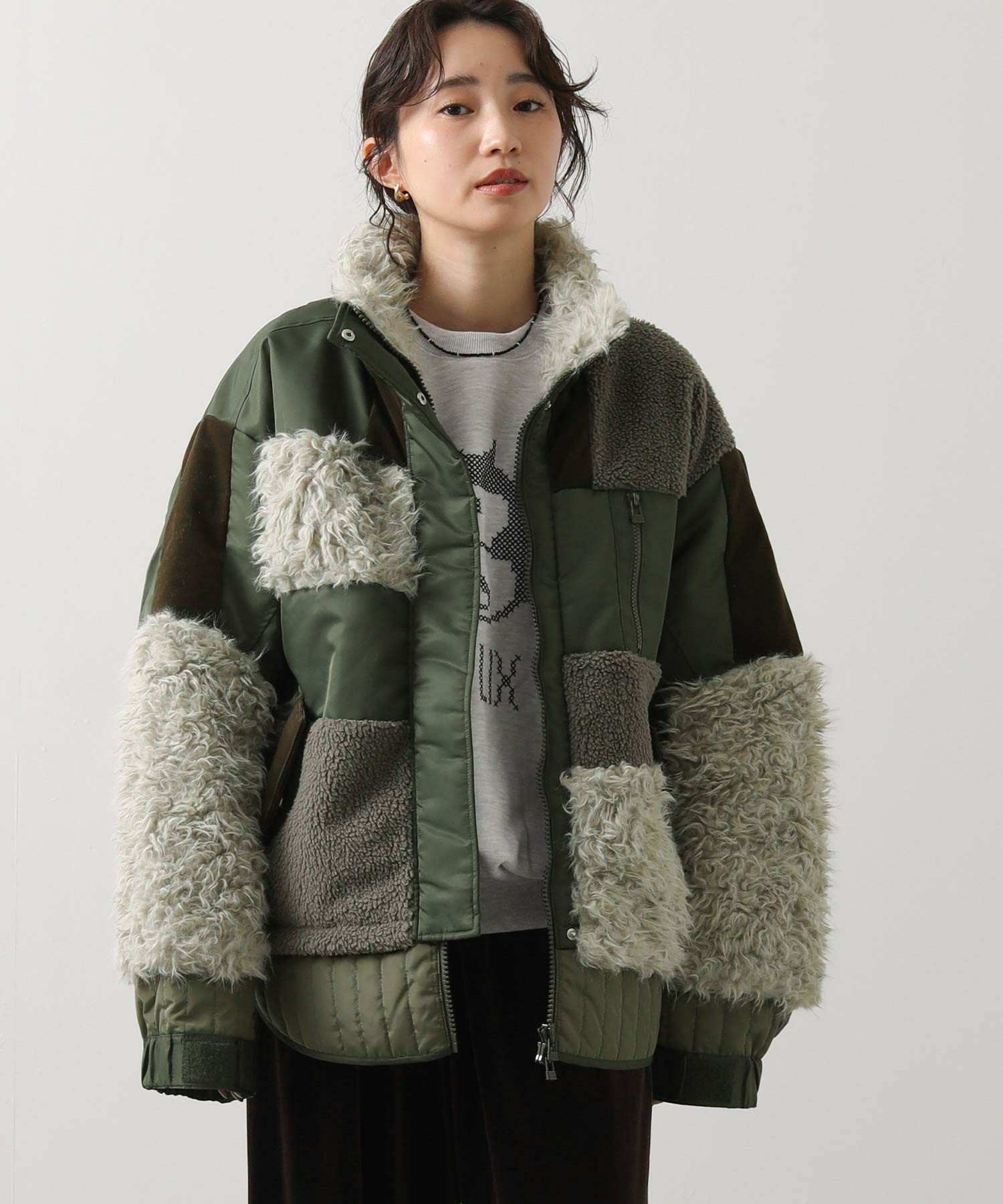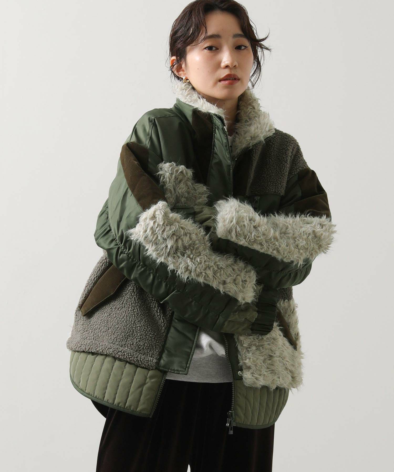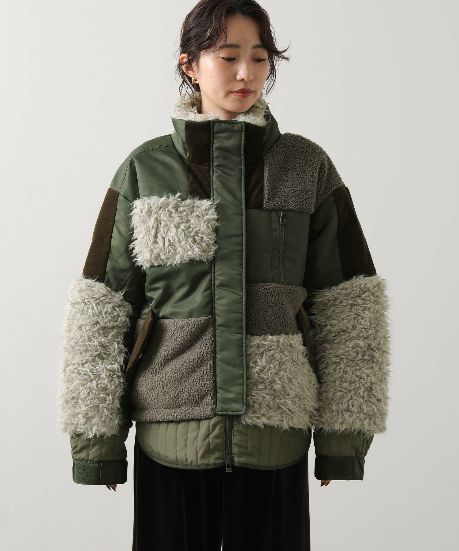 【AULAAILA(アウラアイラ】から、ナイロンタフタをベースに、エコファー、ボア、キルティング、コーデュロイなど、様々な素材を組み合わせたブルゾンをセレクト。
