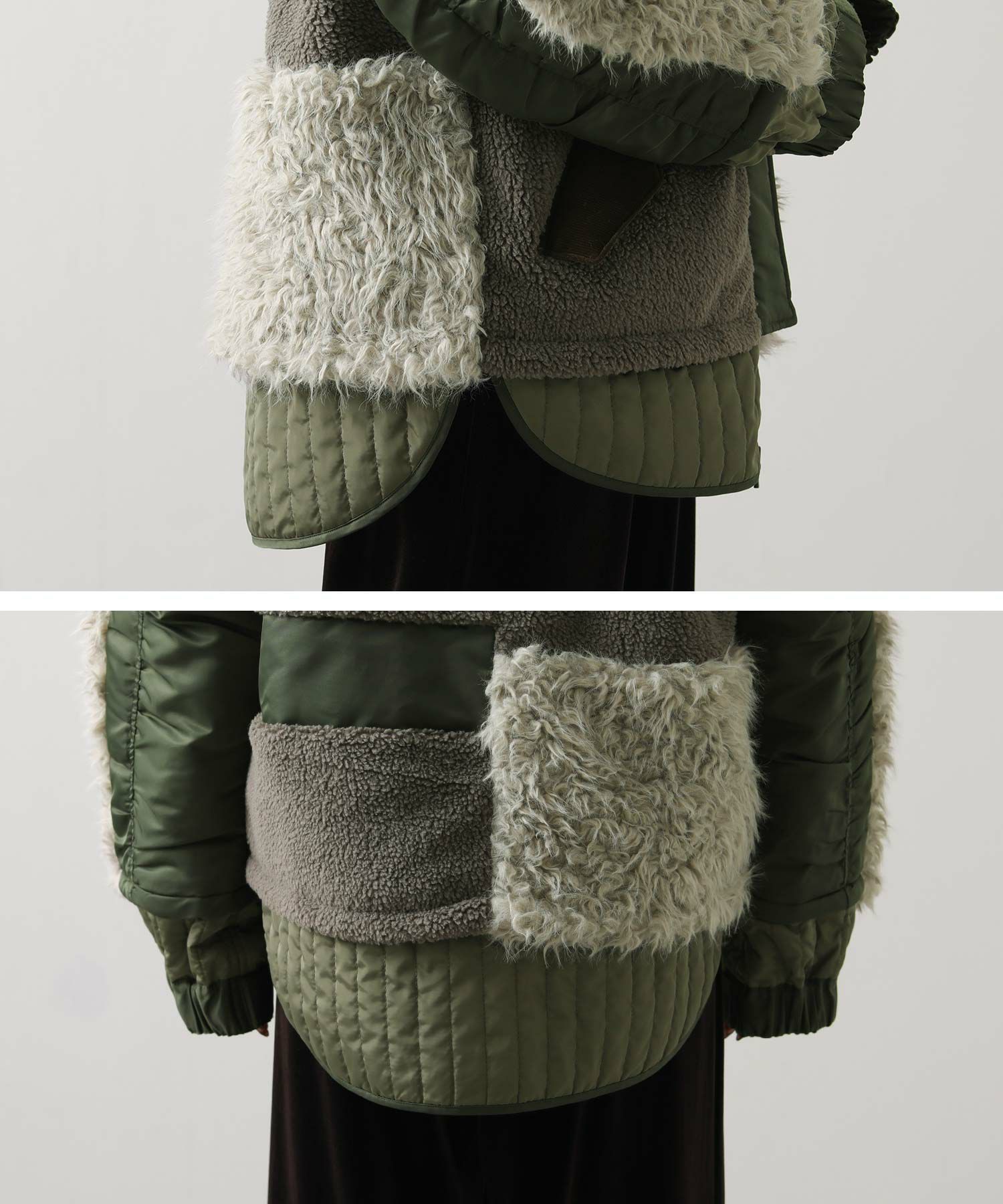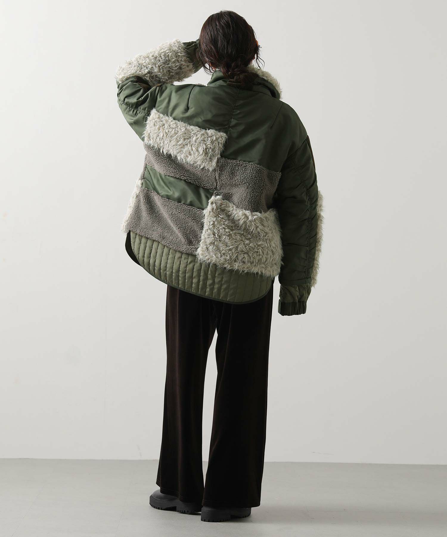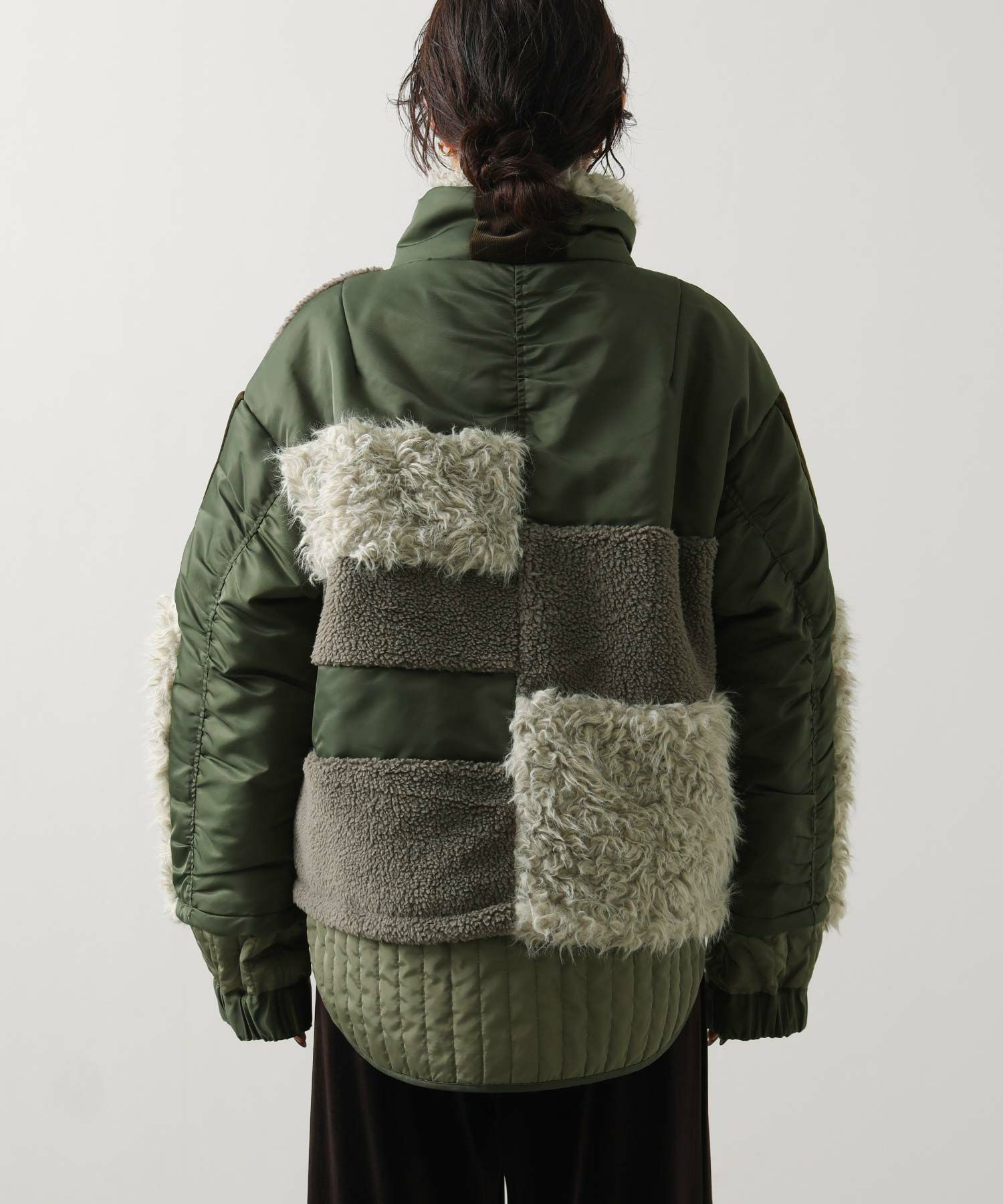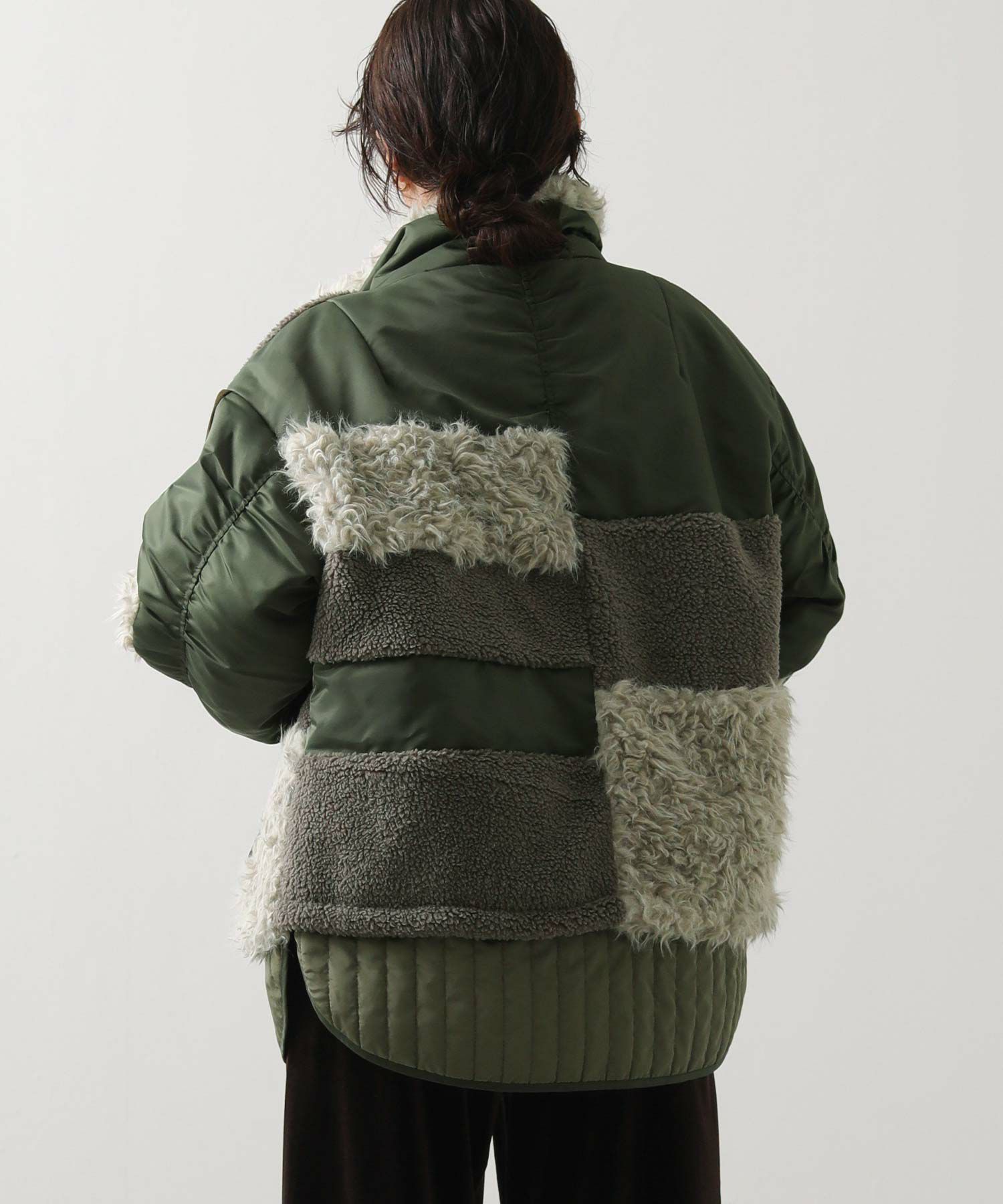【AULAAILA(アウラアイラ】から、ナイロンタフタをベースに、エコファー、ボア、キルティング、コーデュロイなど、様々な素材を組み合わせたブルゾンをセレクト。
