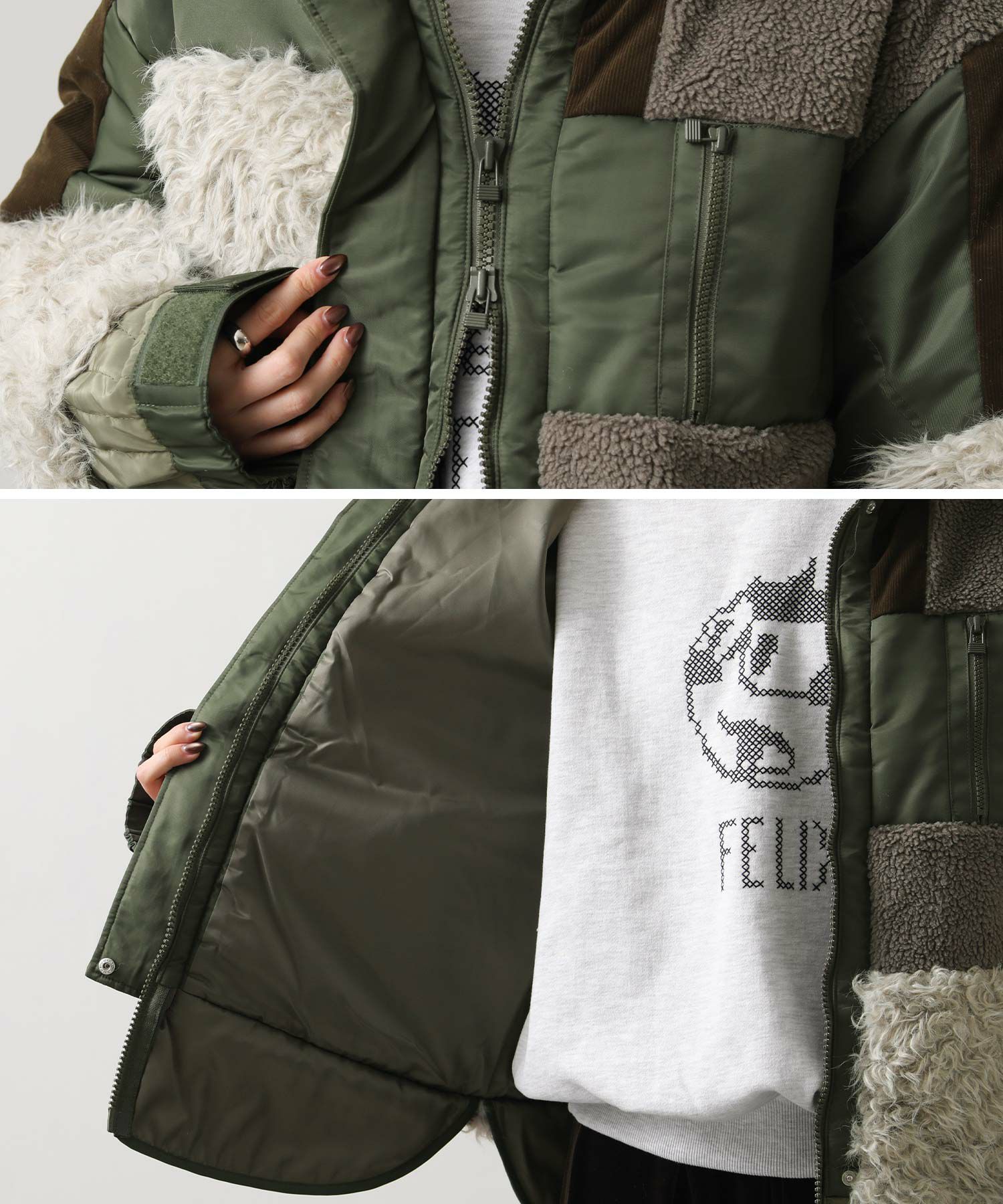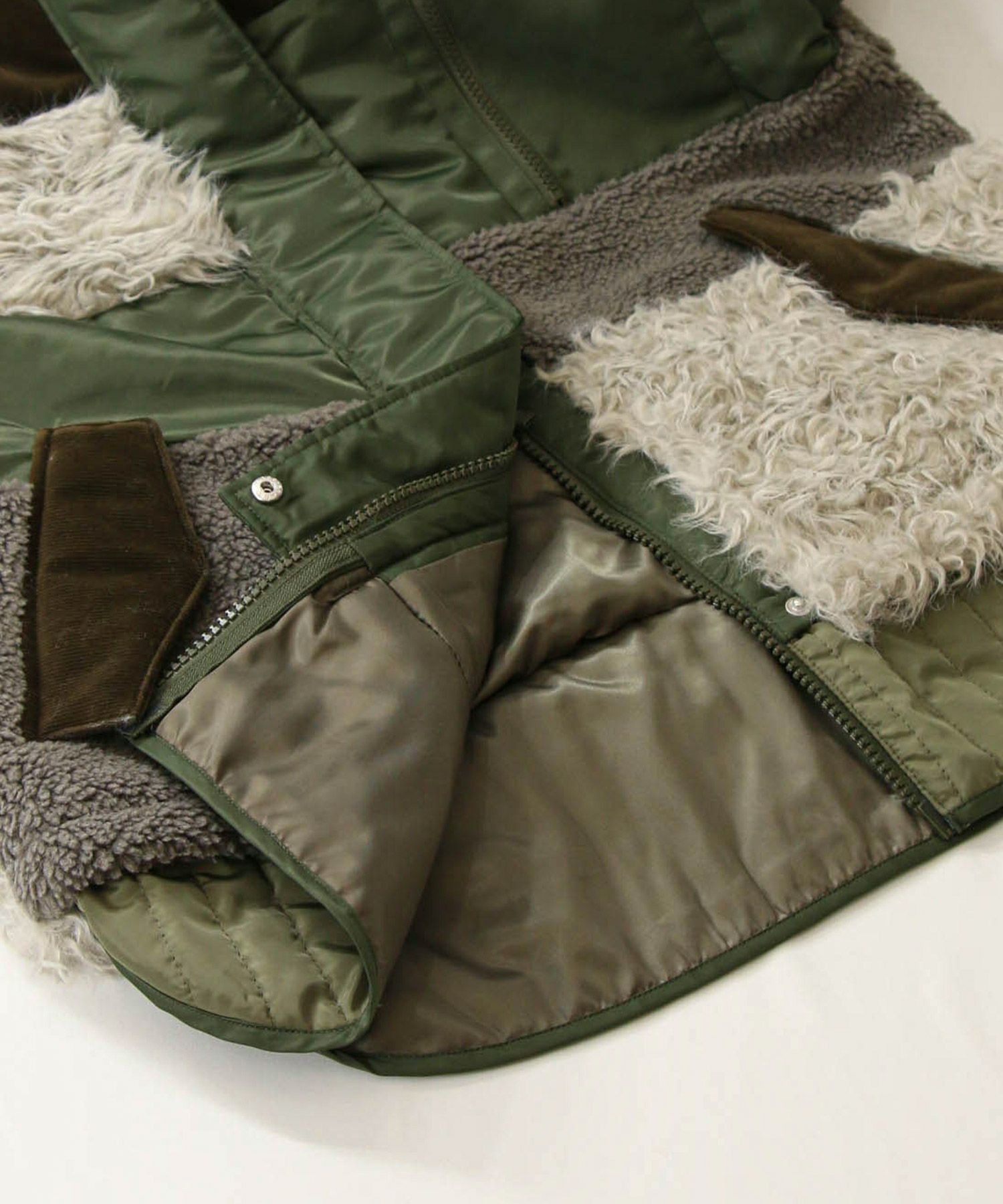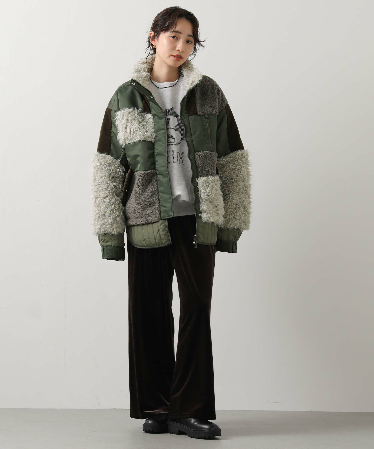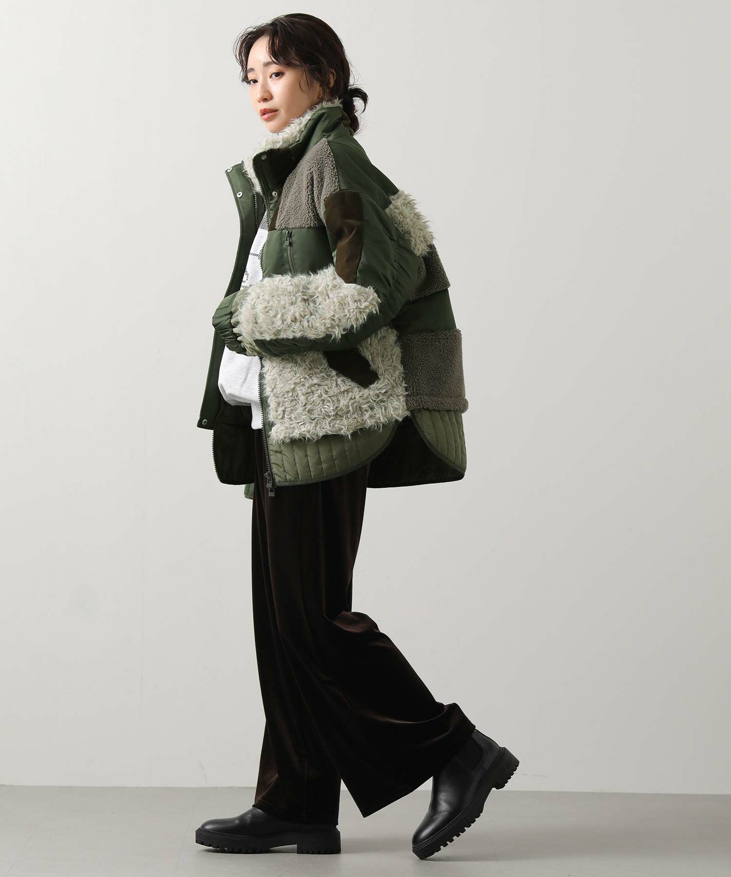 【AULAAILA(アウラアイラ】から、ナイロンタフタをベースに、エコファー、ボア、キルティング、コーデュロイなど、様々な素材を組み合わせたブルゾンをセレクト。