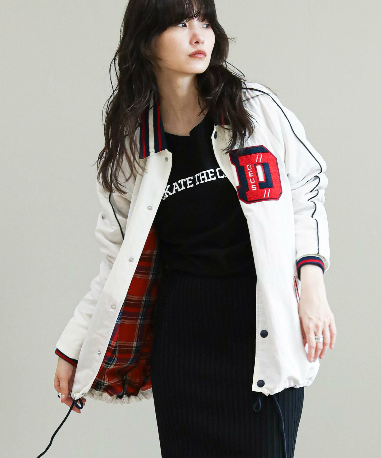 チェーンステッチや背中のワッペンがデザインポイント。 華やかな「D」のシュニール織のフロントパッチが目を引きます。ベーシックなタイトスカートやスラックスなど大人アイテムと合わせるとバランス◎