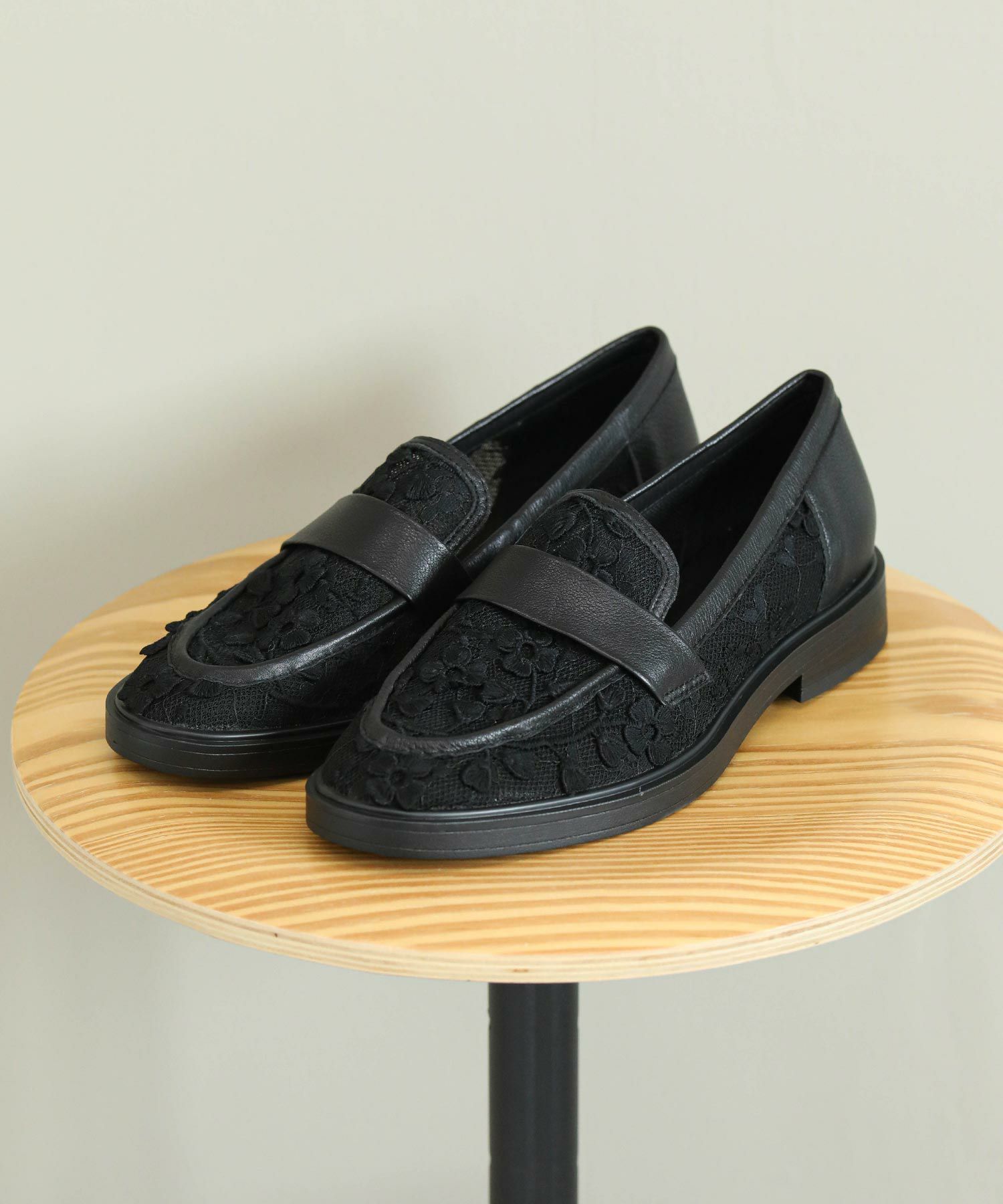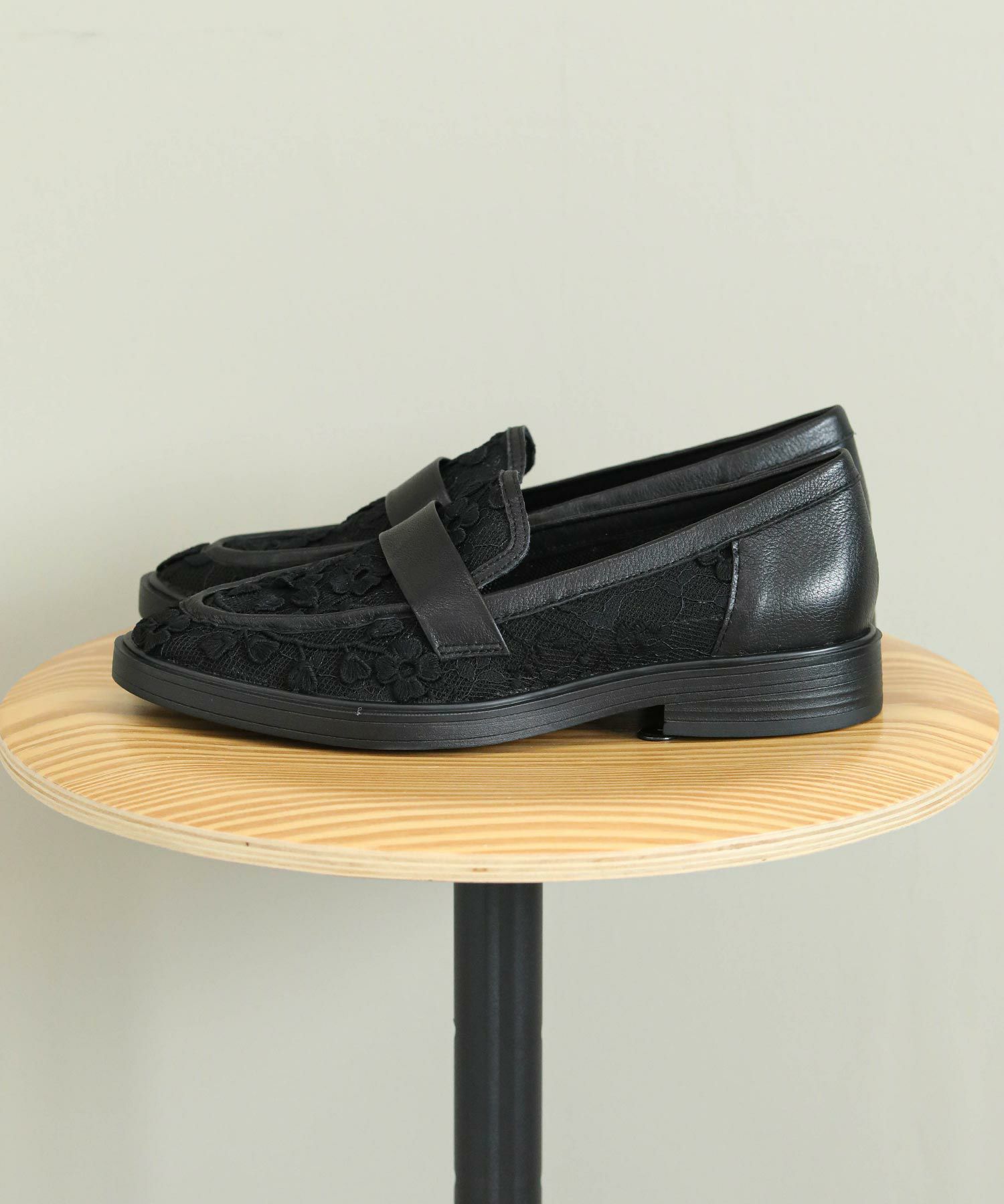 黒を基調としたメッシュ素材の透け感がレースの甘さを抑えモードな印象。甲部分にあしらわれたレザーディテールがアクセントを添えます。靴下を合わせて色の変化を楽しむのがおすすめ。いつものデイリースタイルに合わせるだけで、洗練された雰囲気に。