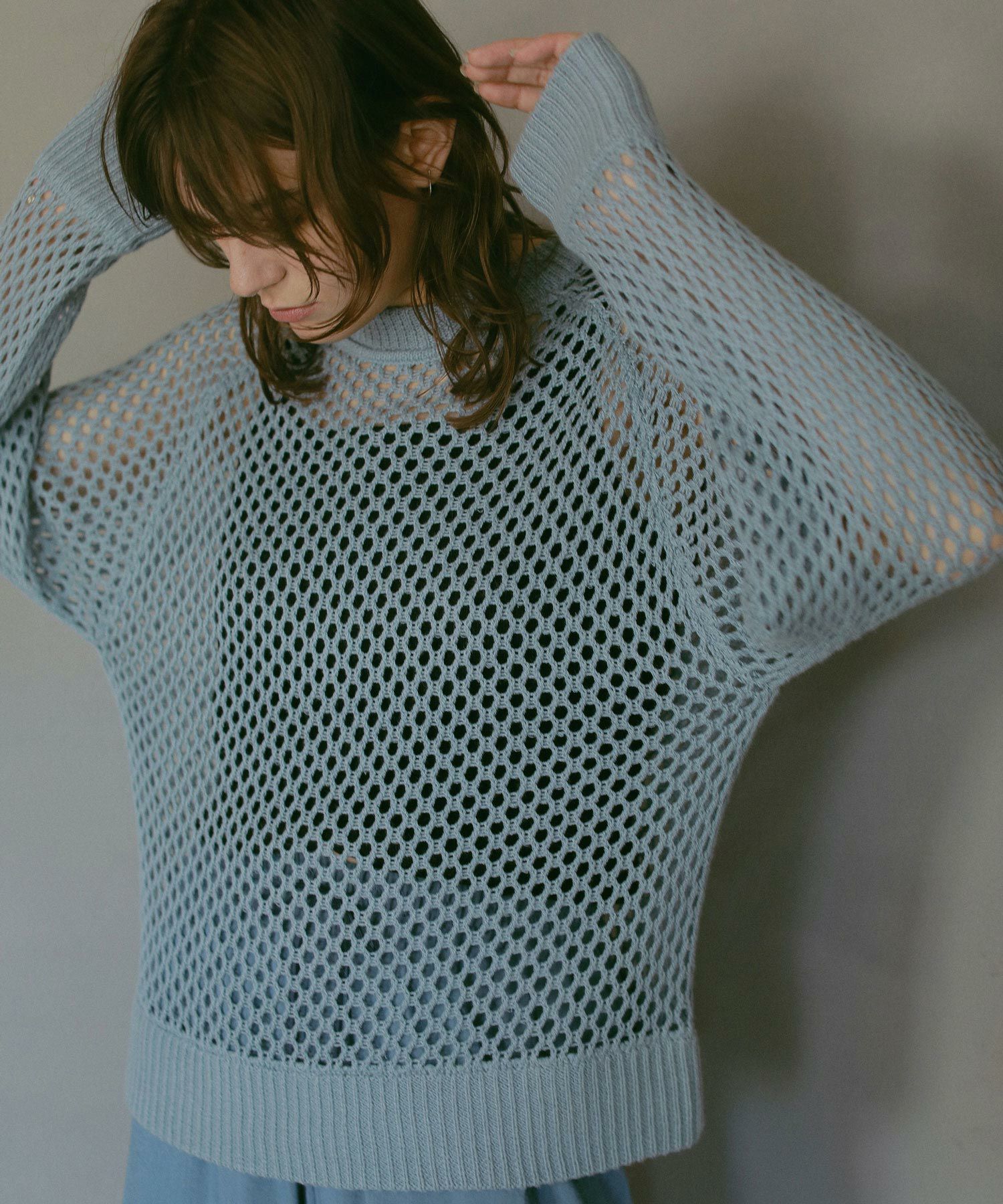 メッシュの編み地と丸みのある袖がポイントのニットトップス。