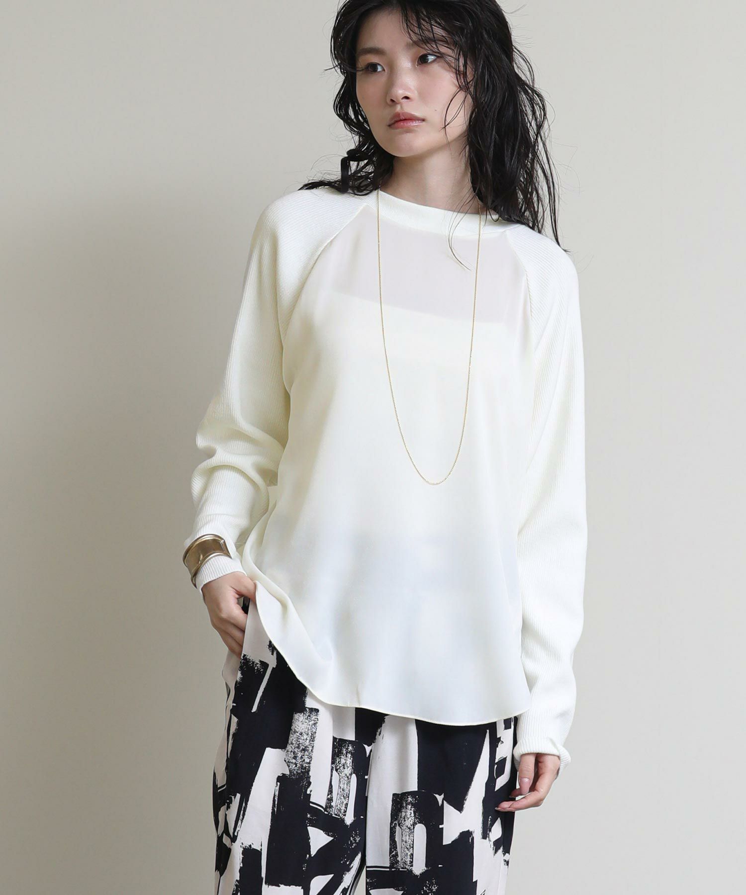 フロントはシンプルなラグランの切替えで、カジュアルな印象に。バックスタイルは、ブラウスにニットをレイヤードさせたようなデザインに仕上げました。一枚でこなれ感のある大人スタイルが完成します。