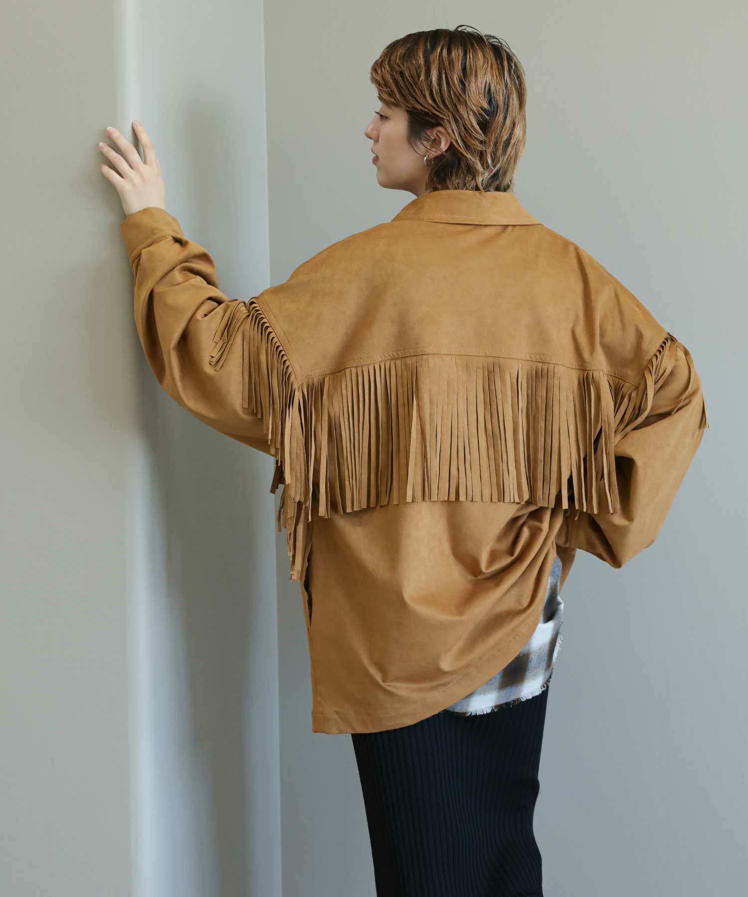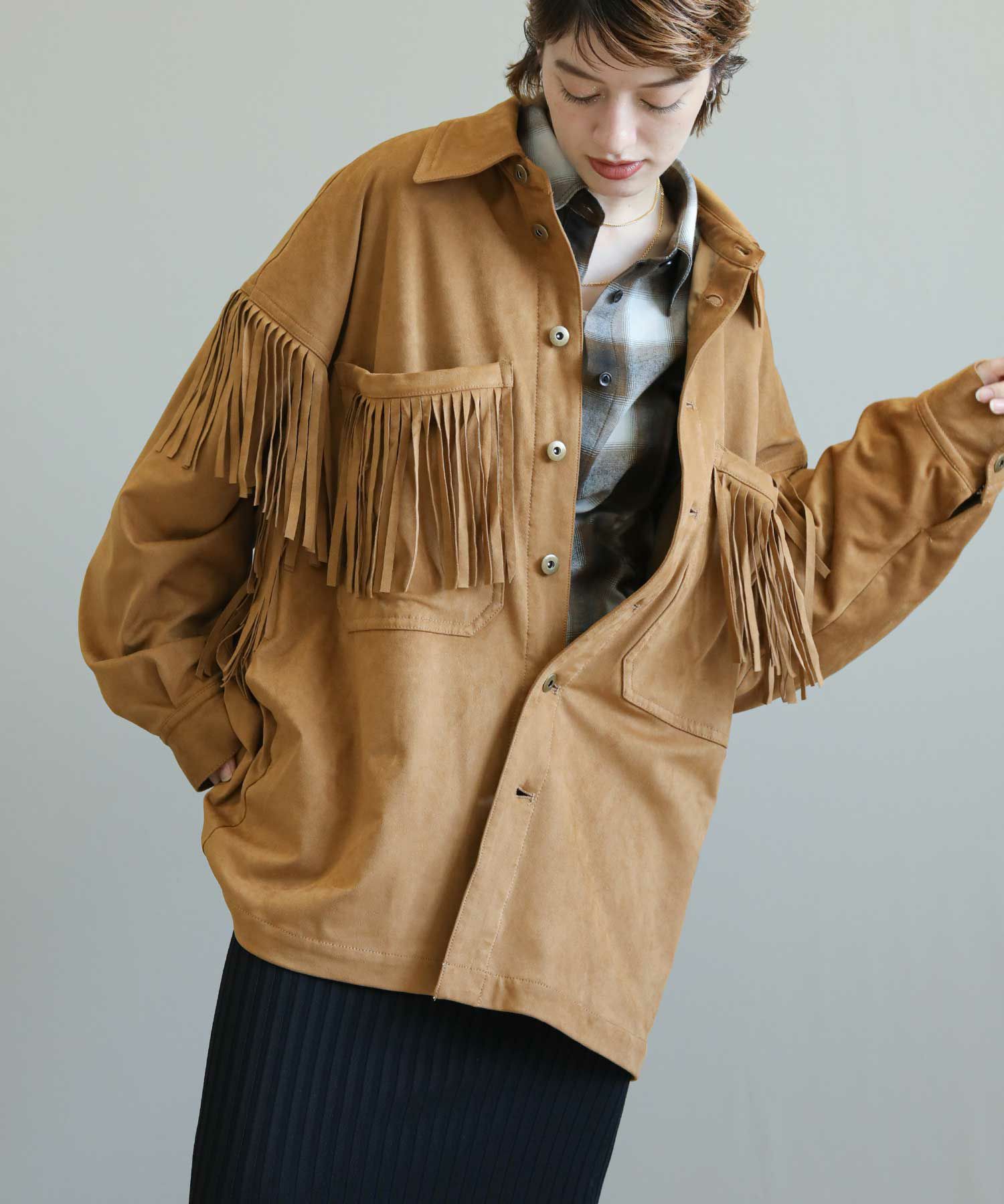 フリンジがアクセントになったスエードライクなシャツジャケット。