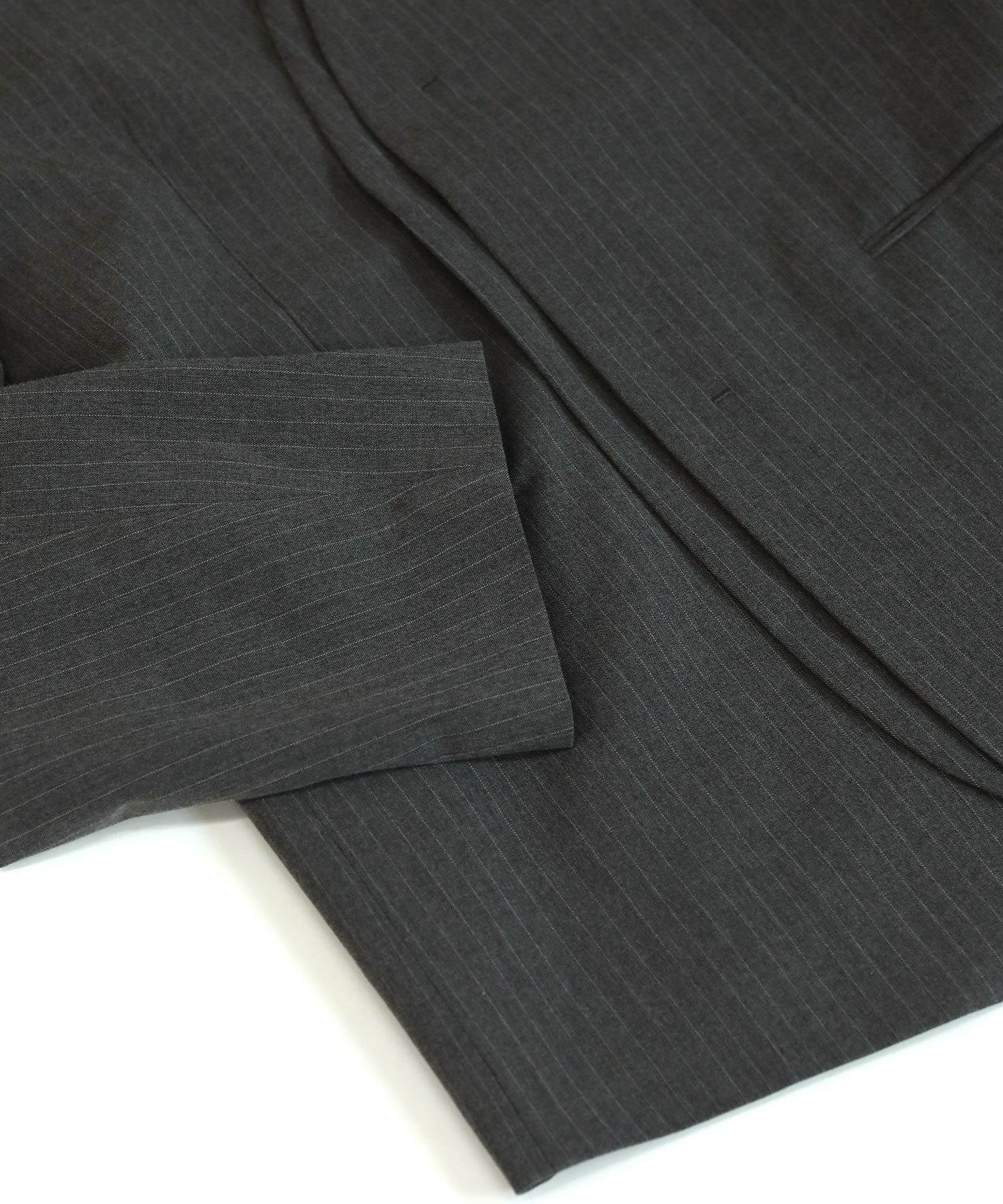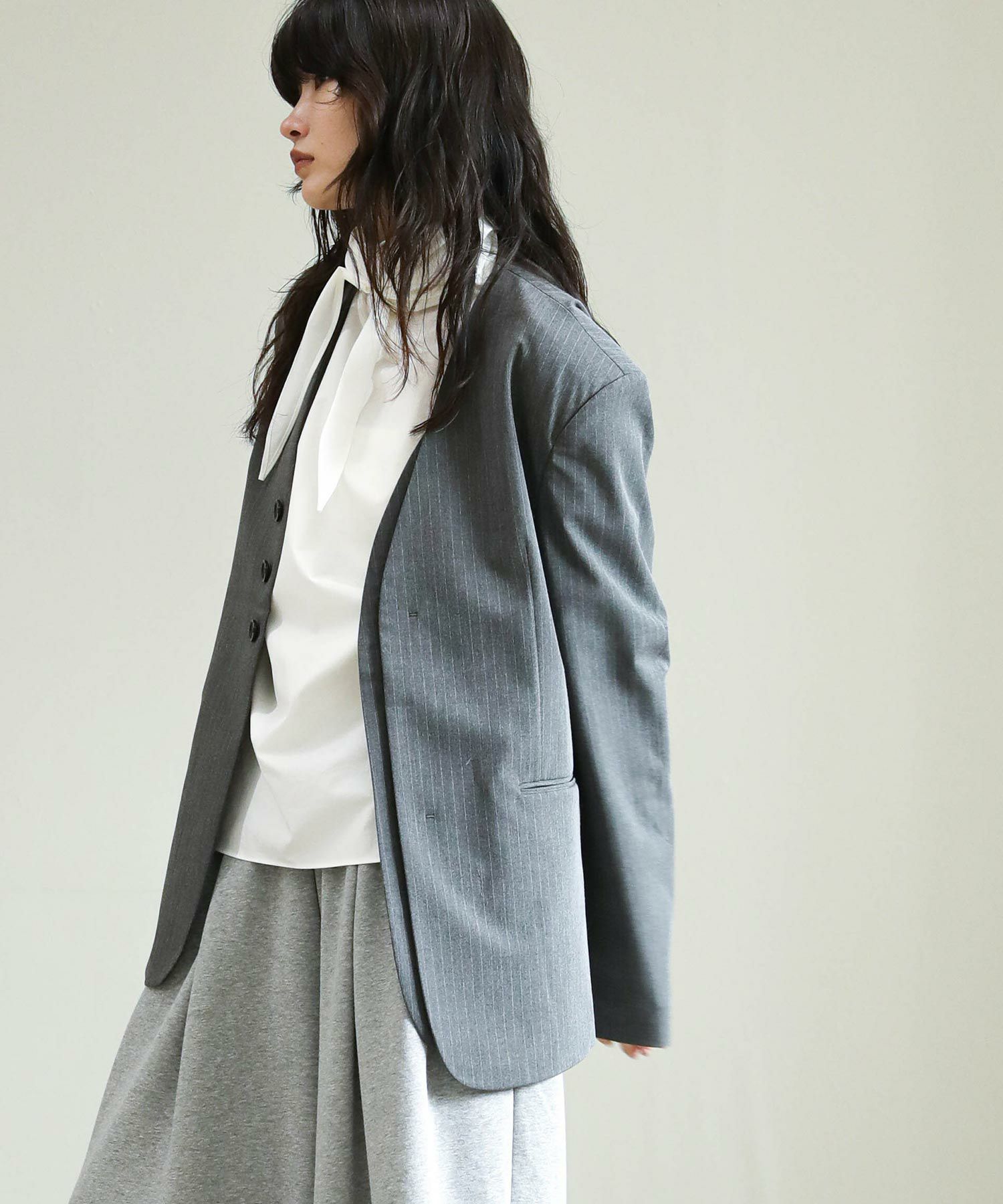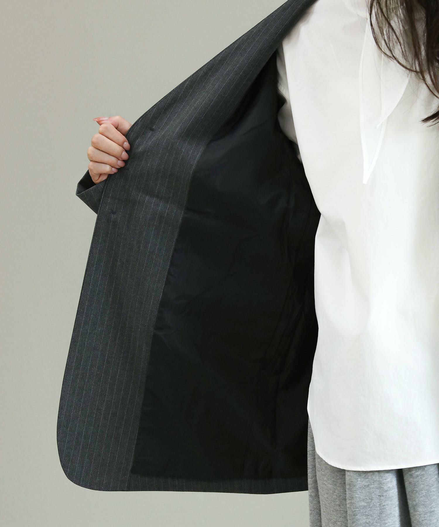 しわになりにくい、肌触りの良い素材です。左身のフロントを2枚重ねたディテールがポイント。前を閉じるとボタンが見えず、ポケット口は細めの両玉縁ポケットでスッキリと仕上げています。ミニマルなデザインながら、重なったフロントデザインがスタイリングのアクセントに。薄手の肩パット入りのかちっとしたシルエットがスマートな印象。トレンドスタイルを楽しめるオーバーシルエットです。