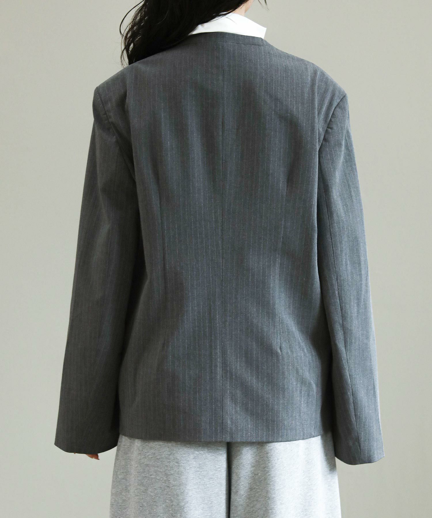 ストレッチ性のある平織りの杢調素材で仕上げたノーカラージャケット。