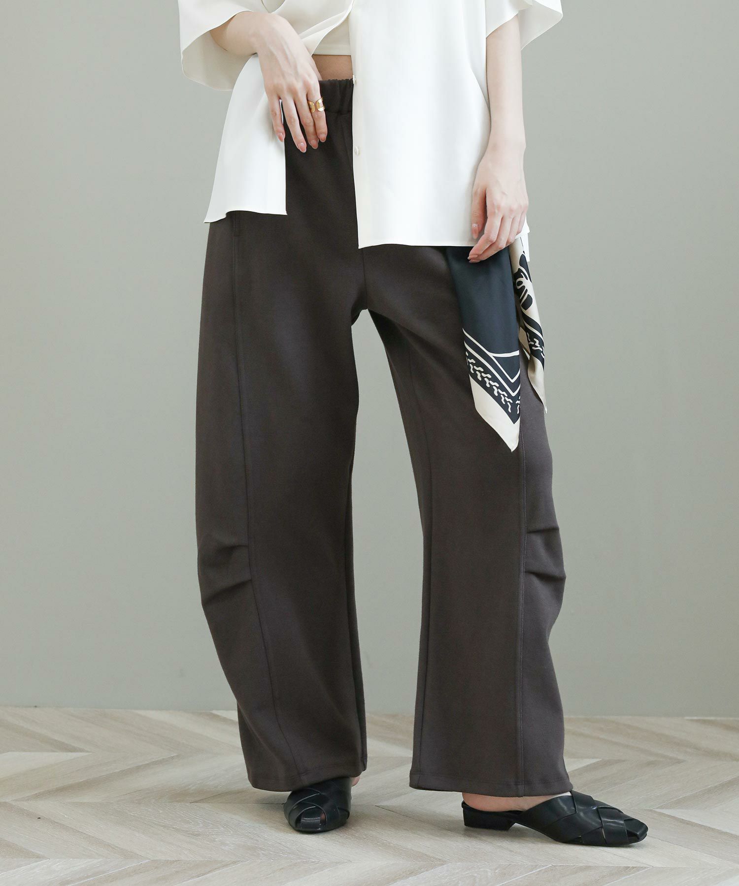 綿ポリエステルのほどよいカジュアル感のあるダブルジャージー素材は、裏毛ほどカジュアルすぎない、裏側もスムースな肌あたりでパジャマっぽくならない大人におすすめのスウェットパンツです。膝に入れたタックで作るカーブシルエットがモードな雰囲気をプラス。ざっくりニットや、少しきれいめなシャツと合わせてもこなれた印象を与えてくれます。秋を感じる落ち着いたカラーも魅力。