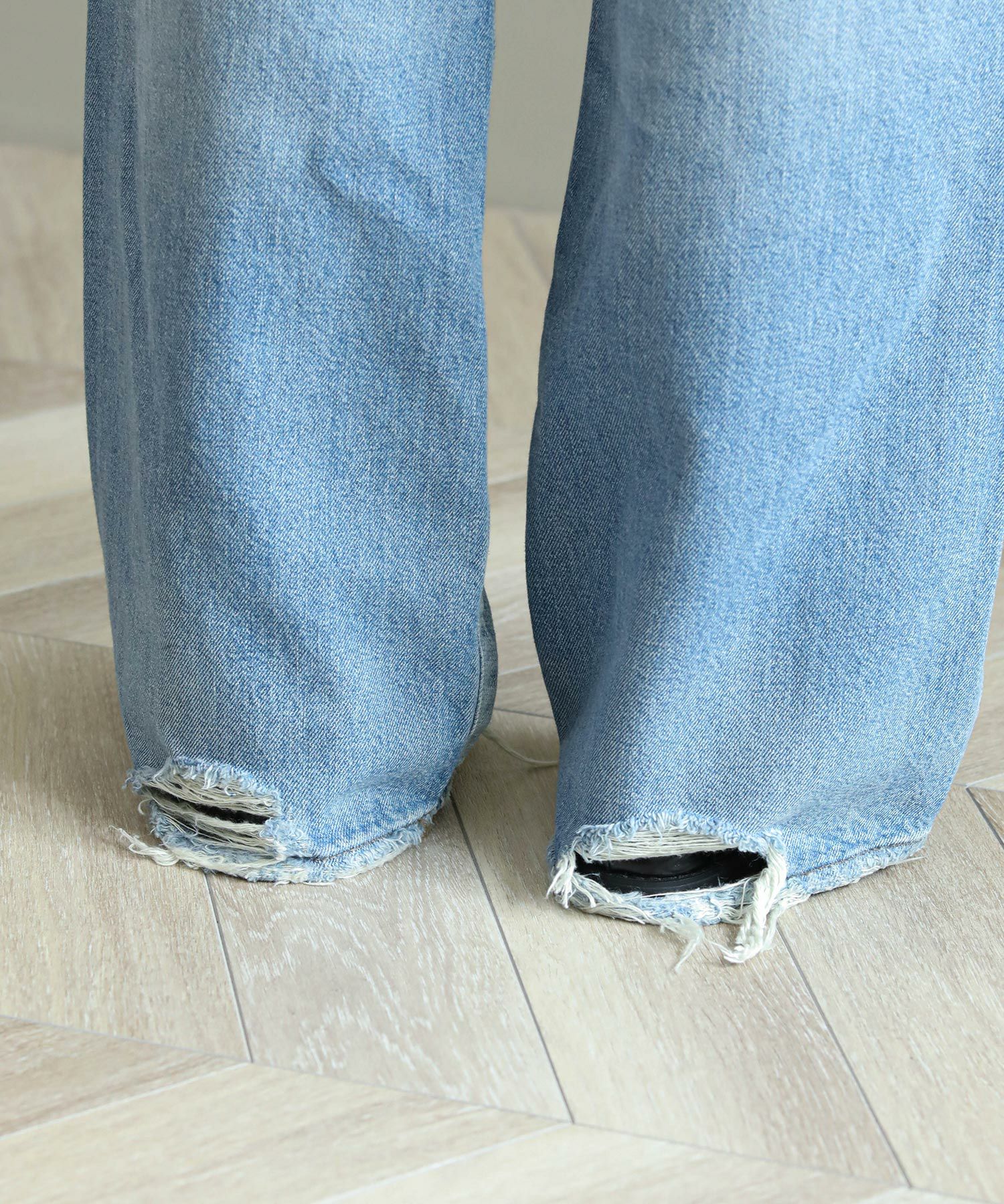 一般的なブーツカットと比べ膝の絞りが少なく、裾への広がりも緩やかな為、ストレートとワイドの中間のような着用感が特徴。ウエストは少し大きめの設計にしており、腰上で留まってヒップからワタリにゆとりをもたせることでリラックスな印象に。またウエスト位置で絞って履いてもキレイなラインが出るので着こなしに幅があるアイテムです。大胆なダメージ加工がトレンド感もあり、スタイルの巾が広がります。