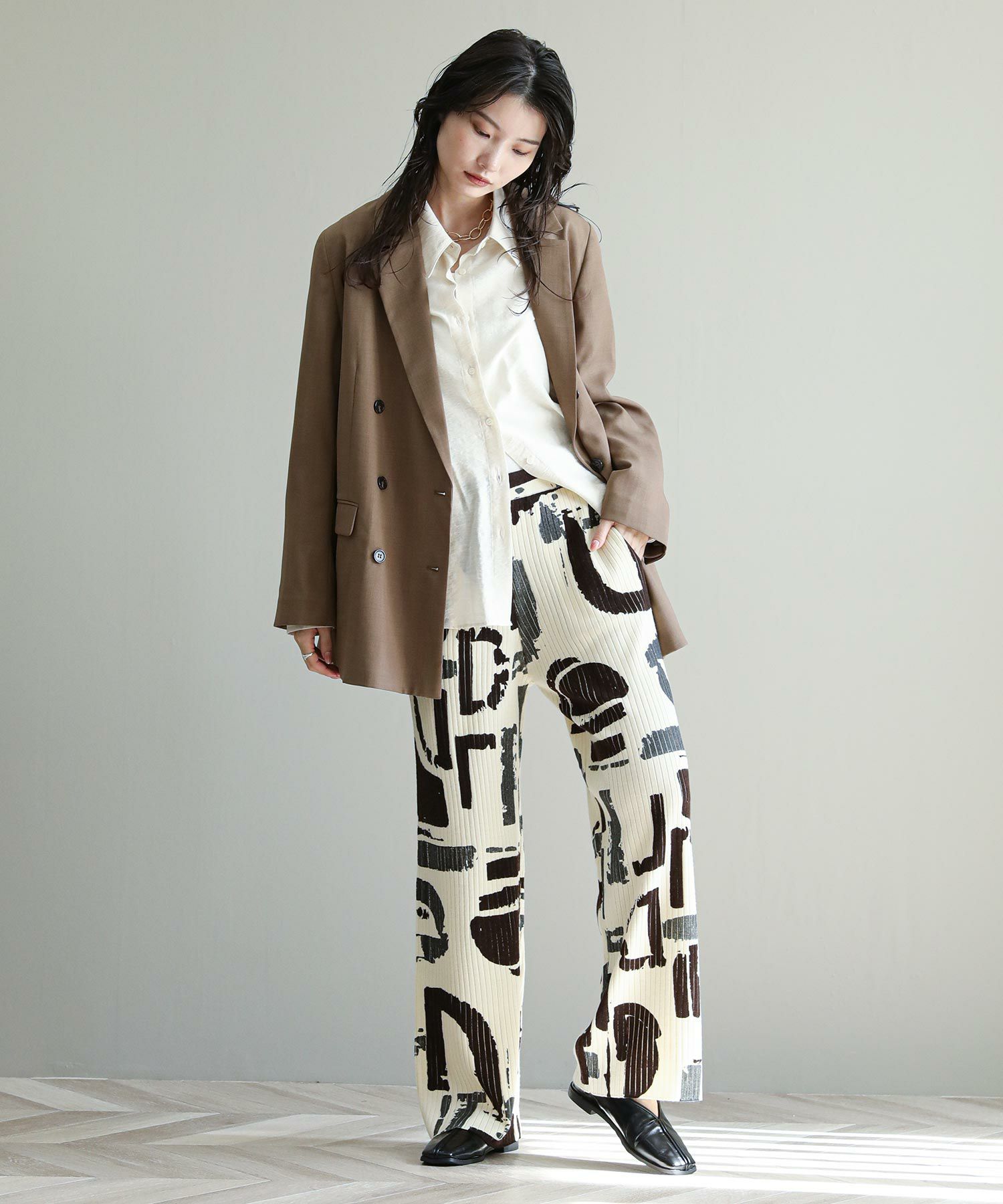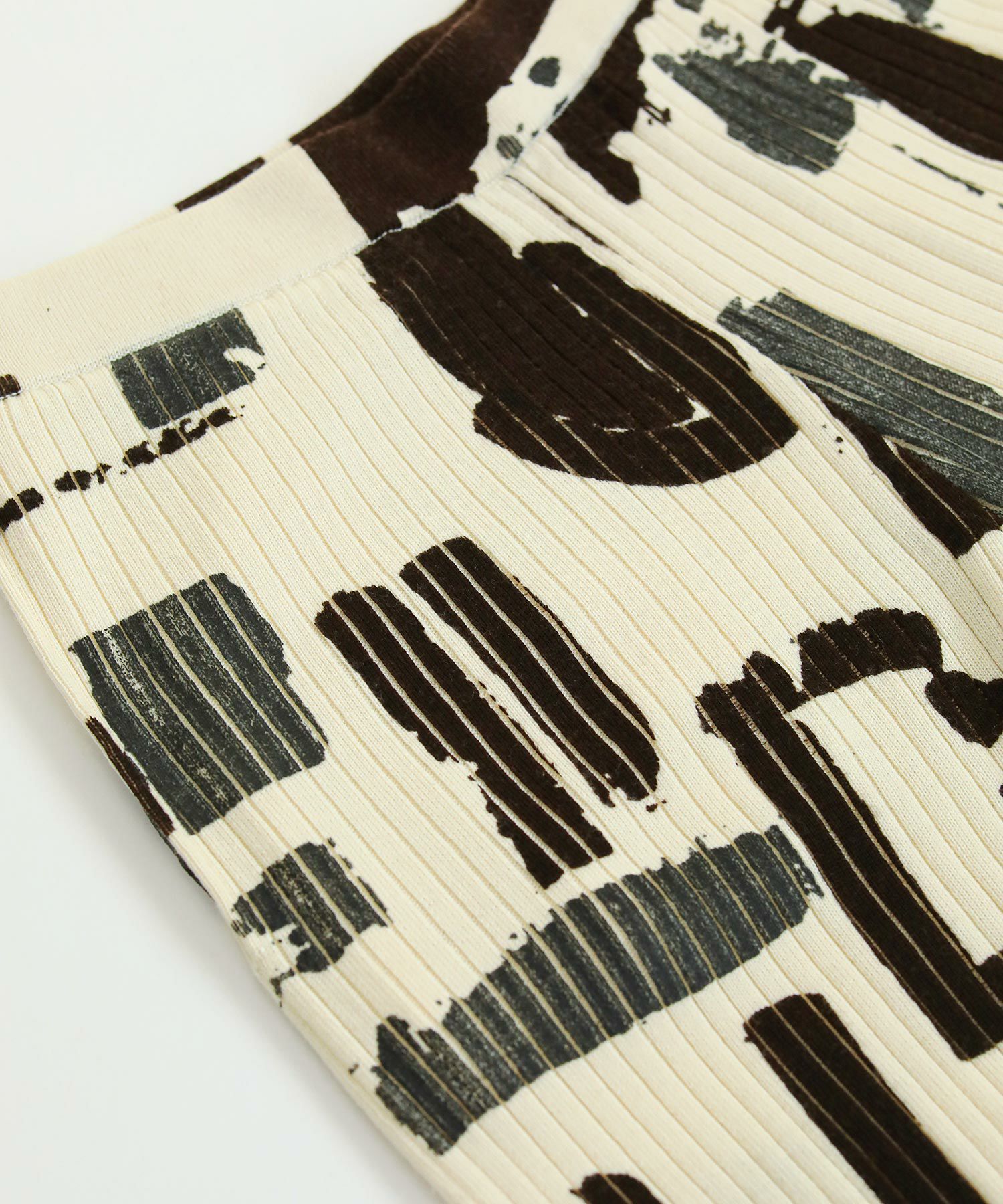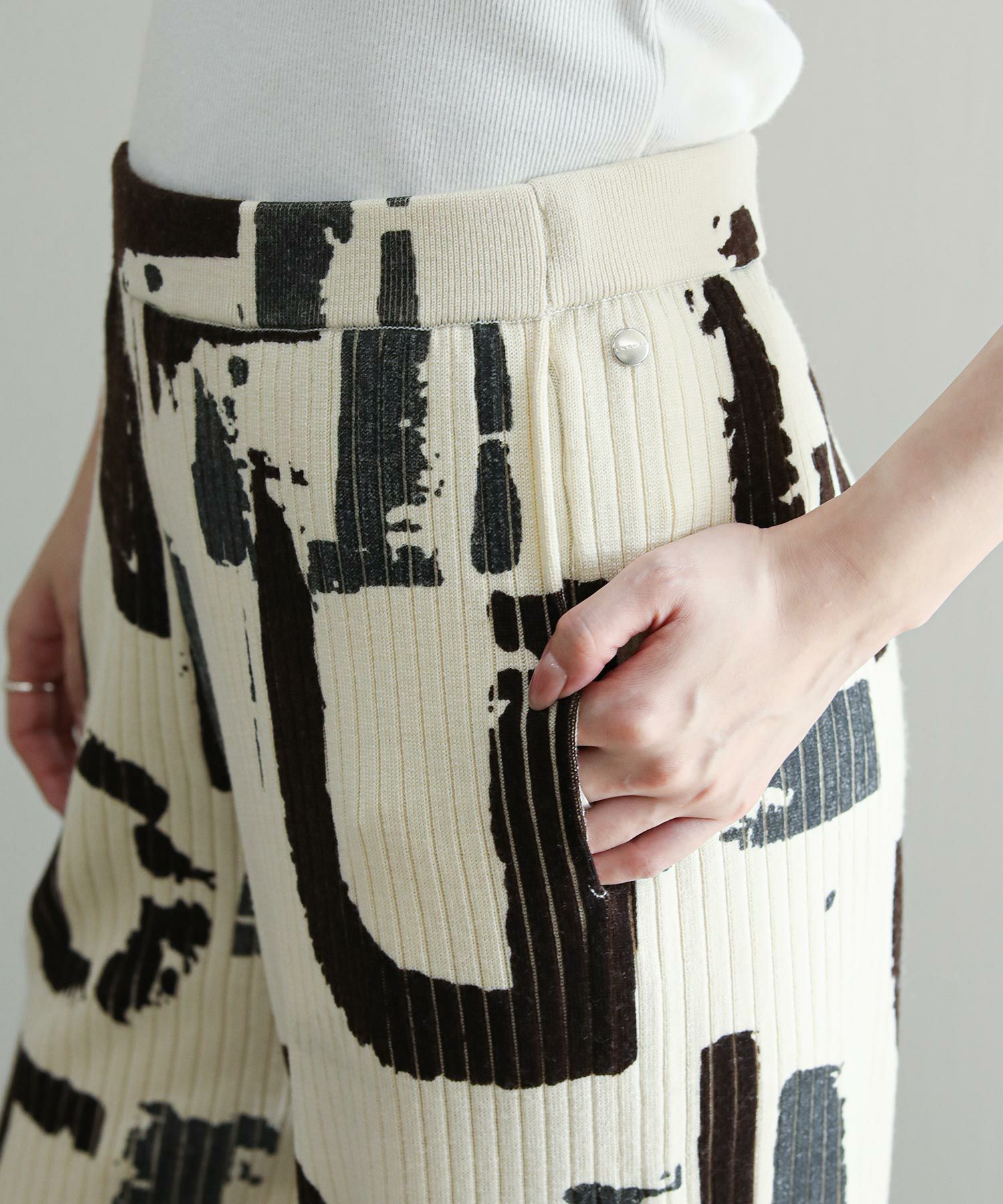 3色の内、1色は箔プリントが施されています。適度な落ち感を重視し、重みのない軽やかな履き心地が特徴です 。ニットパンツでは珍しいサイドポケットが付いており、ウエストはゴム仕様も嬉しい。編地と柄の配色が目を惹くリブニットパンツです。