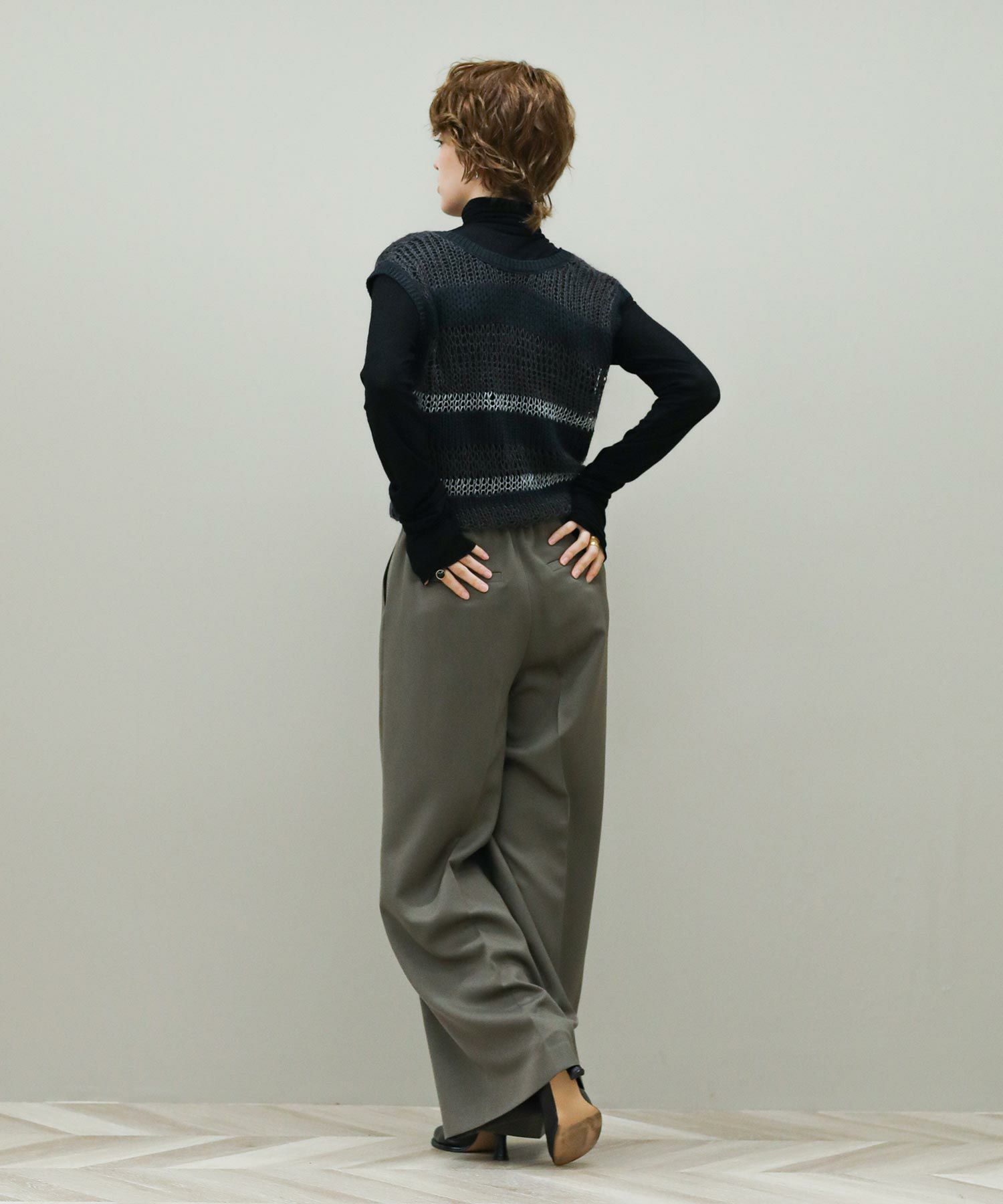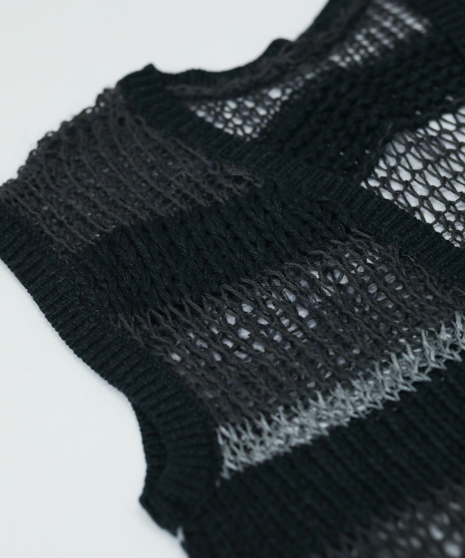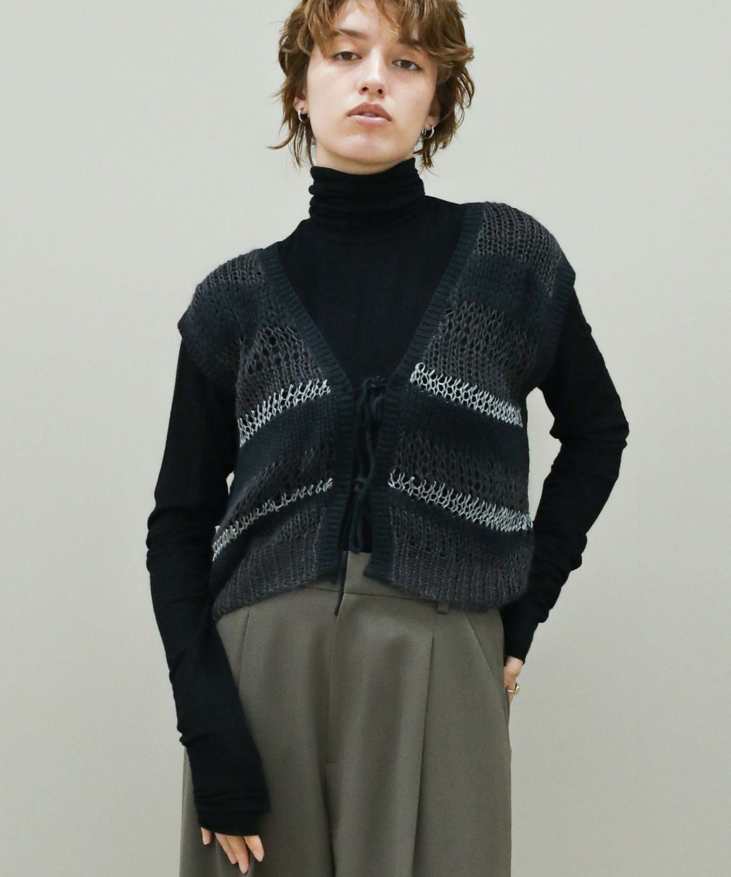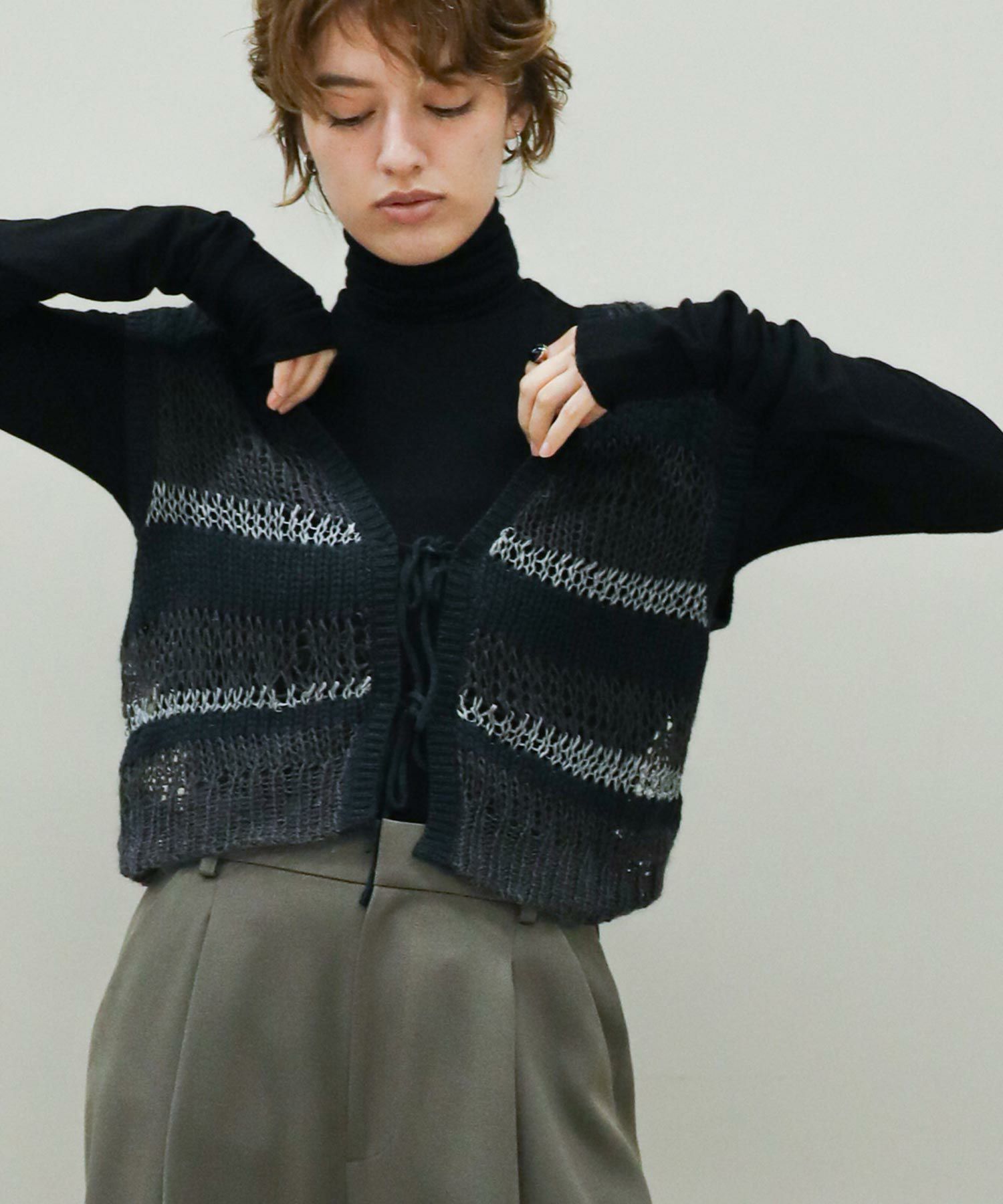 透けている部分とそうでない部分とで編み地に差をつけたボーダー柄。同じ糸を使用した部分も、絶妙に編み方を変化させています。一枚でノースリーブトップスとしてはもちろん、コンパクトな長袖トップスなどとレイヤードして、晩夏から秋冬まで長く着まわしていただけます。深めのVネックとリボン使いがコーディネートに映えるバックスタイルもポイント。Vネック側を前にして、前後2WAYで着用可能です。
