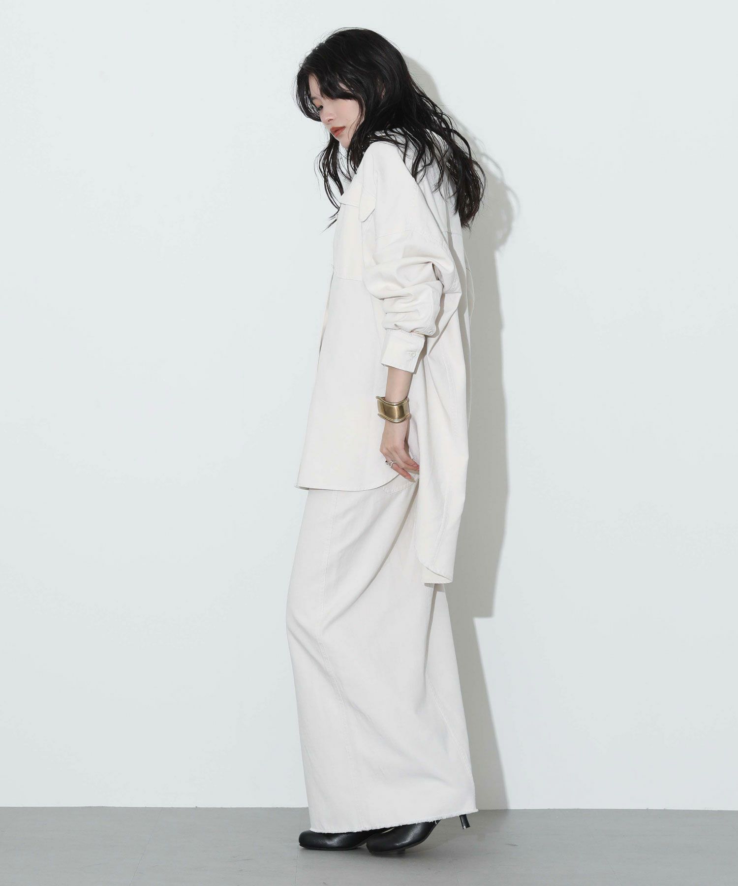 デニムのように経年変化を楽しめる加工感のある生地を使用。ハイウエストはスタイルアップを叶え、ラインを拾わないタイトなシルエットが女性らしい◎前のスリットで足捌きもよく、脚が綺麗に見えるスリットの深さで設定しています。これからのシーズンはブーツと合わせて着用するとバランスが◎