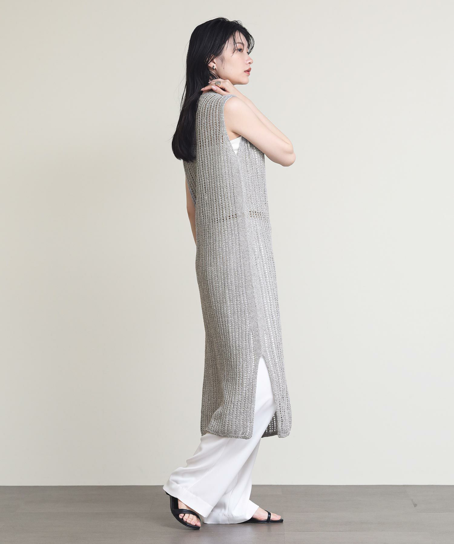 リネンはノルマンディー地方で収穫される一等亜麻の上質な部分だけを使用しています。シャリ感のある素材で盛夏まで快適に着られます。タンクトップやデニムなどシンプルなスタイルにレイヤードすると、上質なニットの風合いを活かした着こなしに。両サイドにスリットが入っているので足さばきも◎