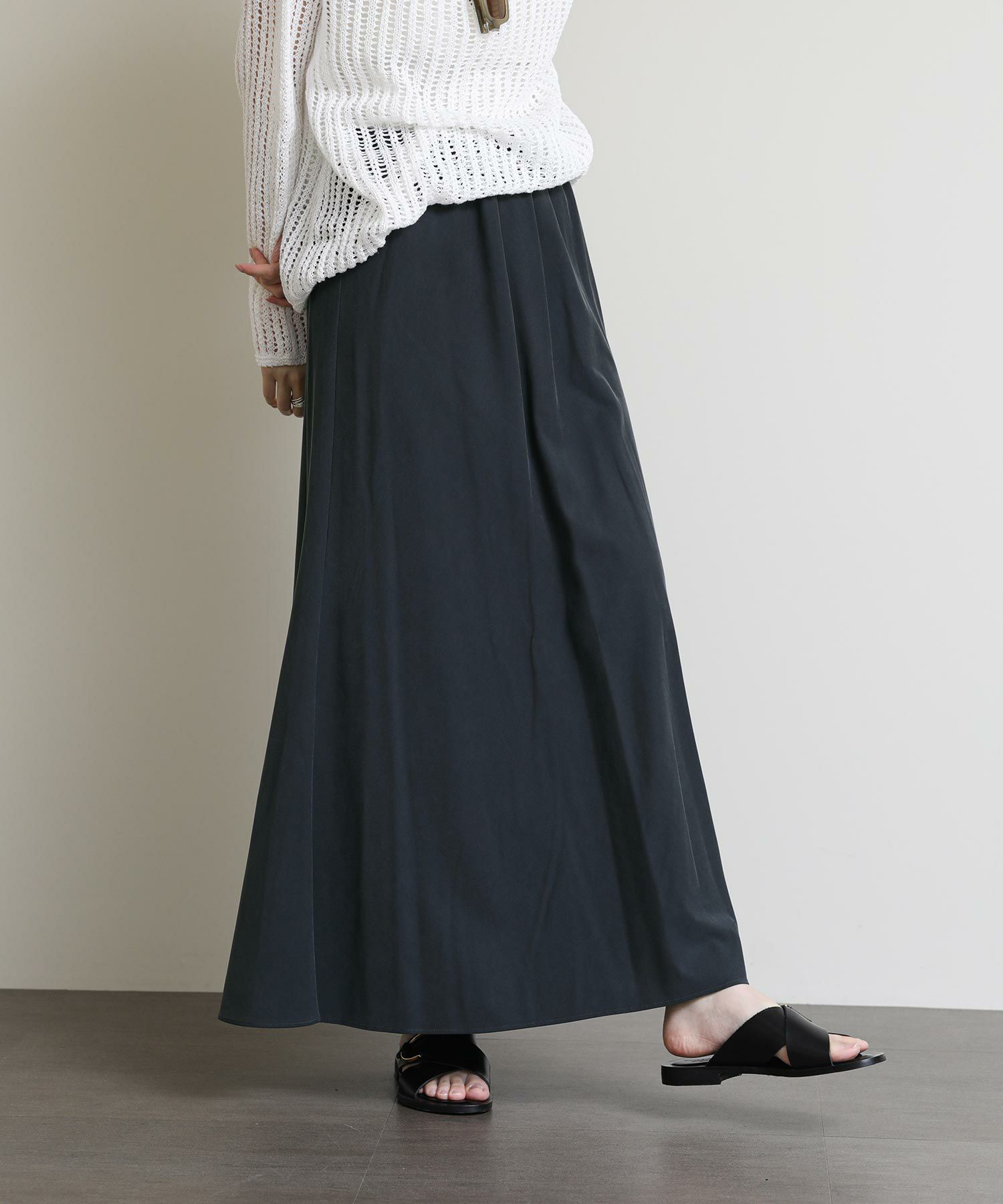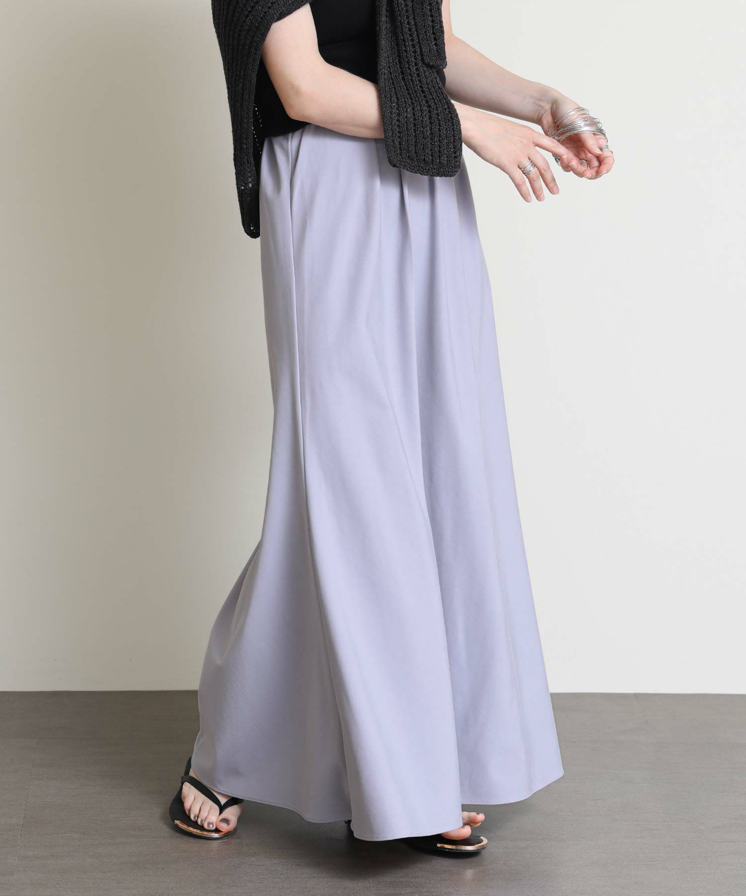 環境に配慮した再生繊維を使用したツイルは上品な光沢感が魅力。裾に広がるフレアのシルエットは足さばきしやすく、ウエストはゴム仕様でストレスフリーな履き心地。Tシャツなどカジュアルなアイテムとの相性も◎