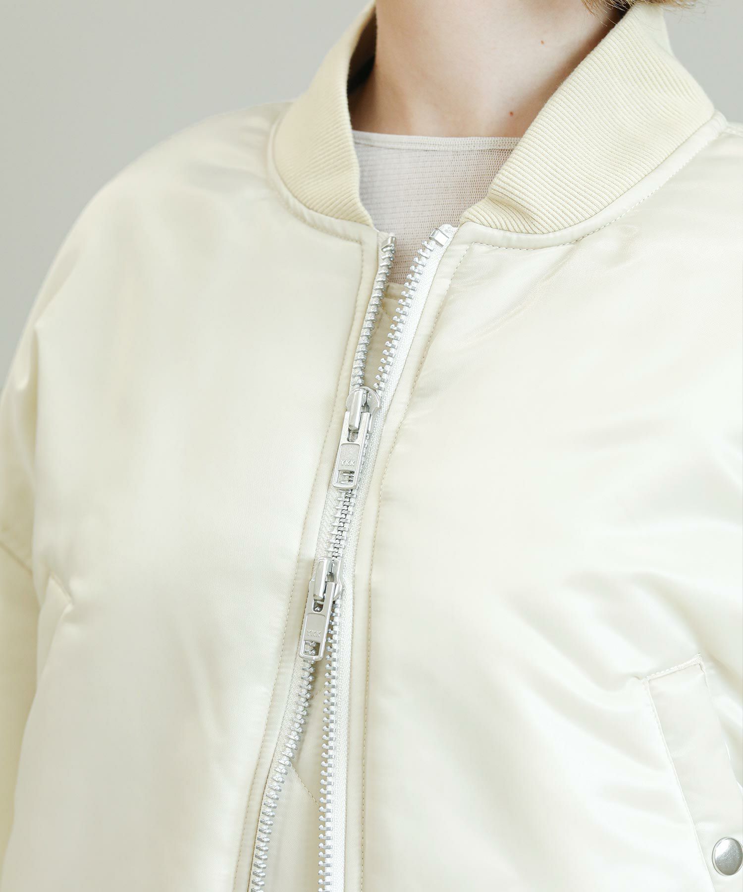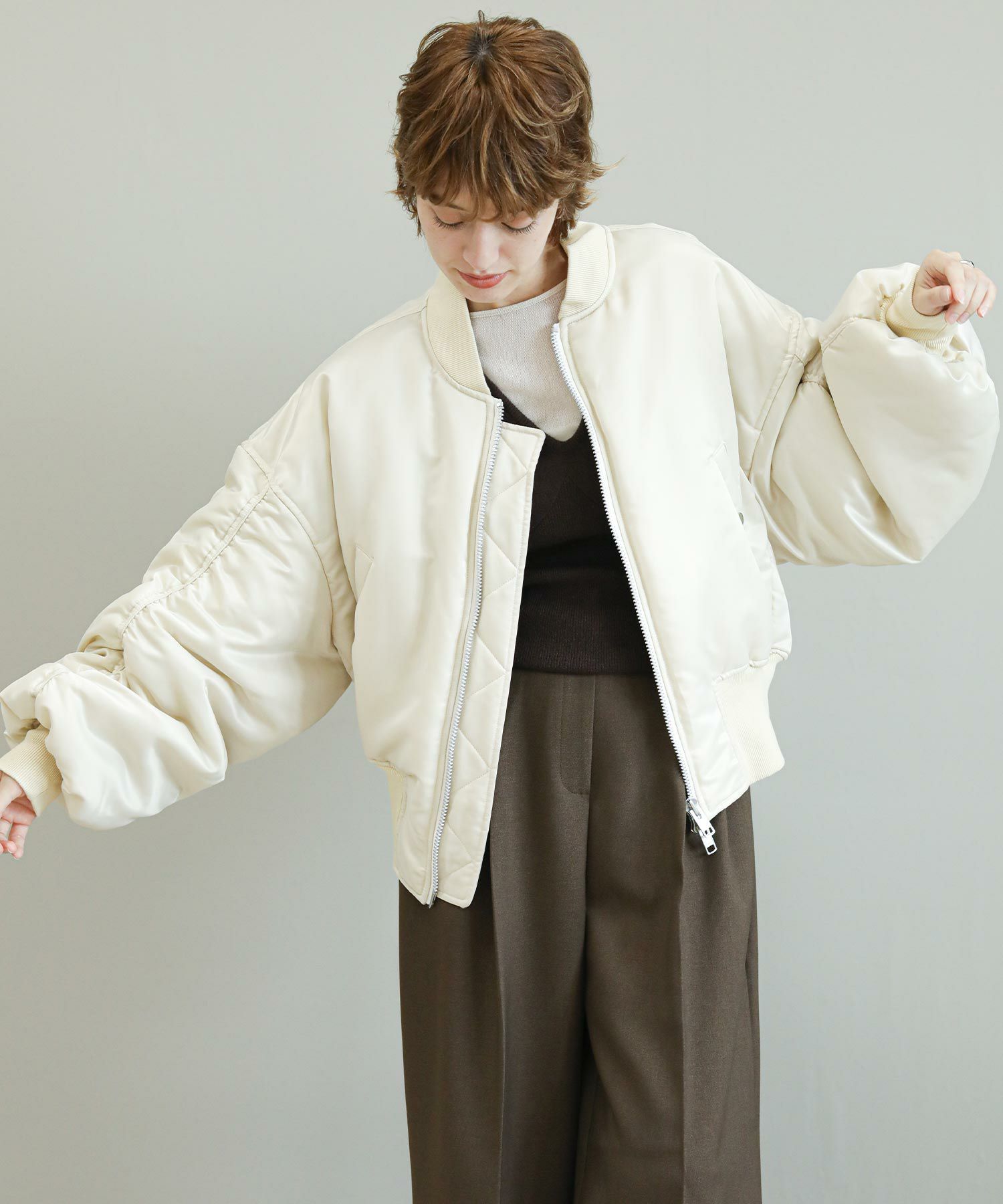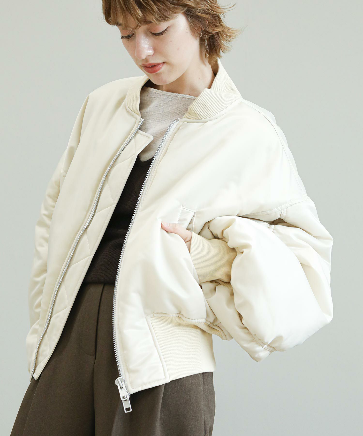 着丈と袖のバランスがポイント。さっと羽織るだけでスタイルが決まります。重厚感のあるファスナーやヘビーなリブなどMA-1らしさに拘りながらも女性らしいスタイルにマッチするシルエットです。今シーズンはライトベージュとカーキの2色。重くなりがちな秋冬スタイルを軽やかに仕上げてくれます。
