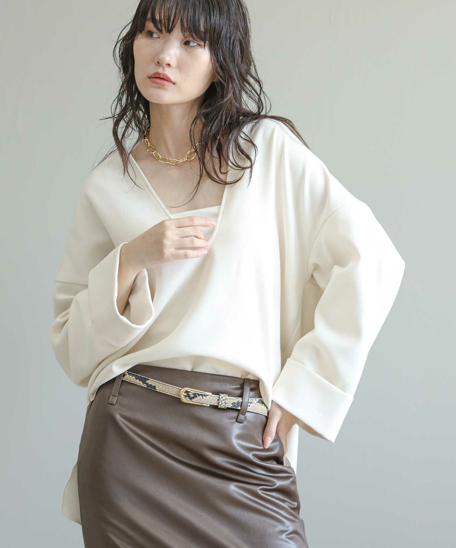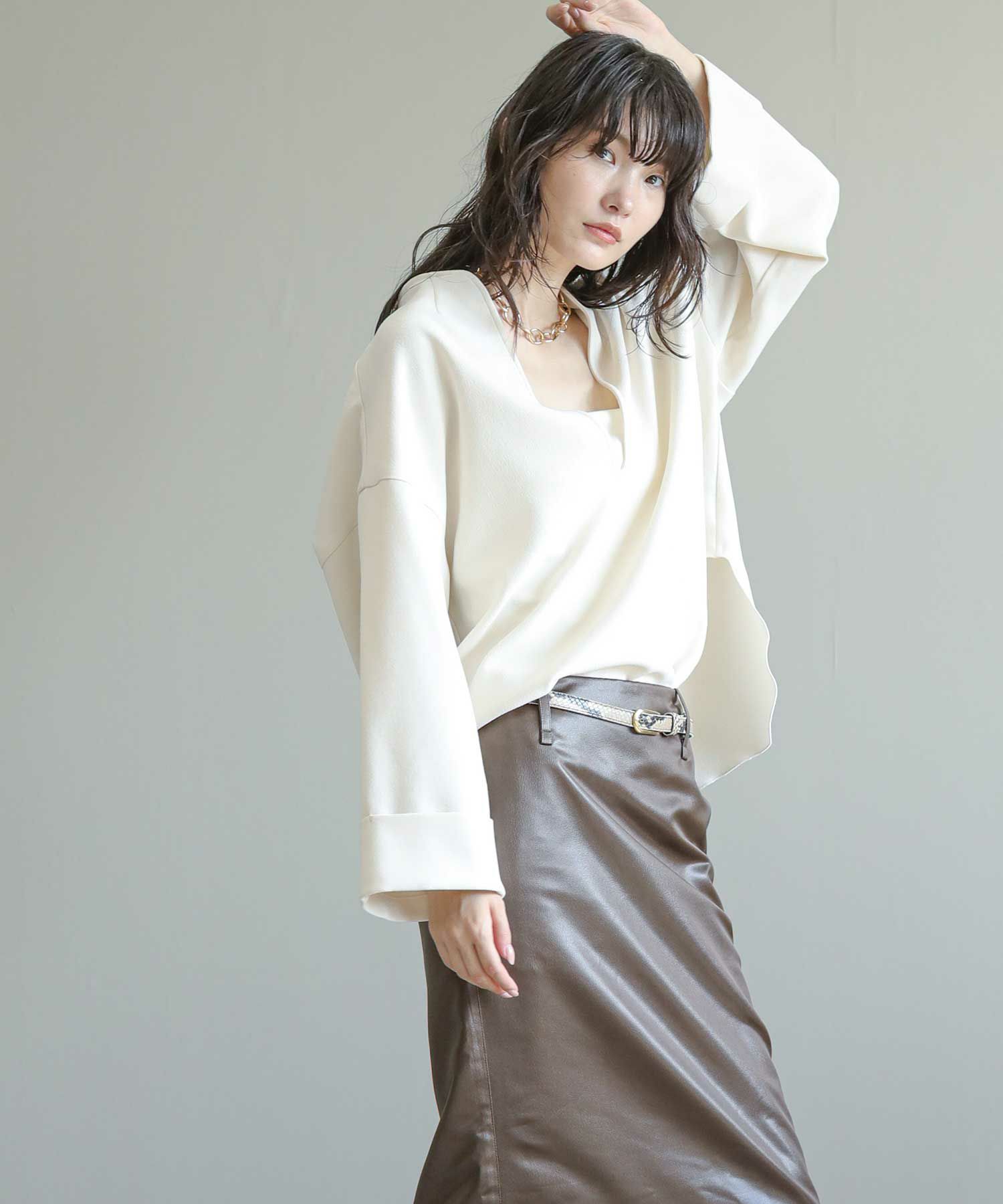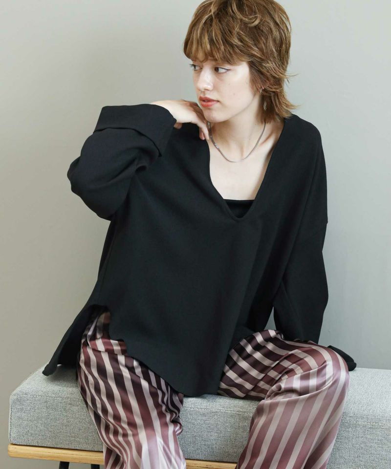 滑らかな落ち感のあるアムンゼン素材を使用したスリットブラウス。