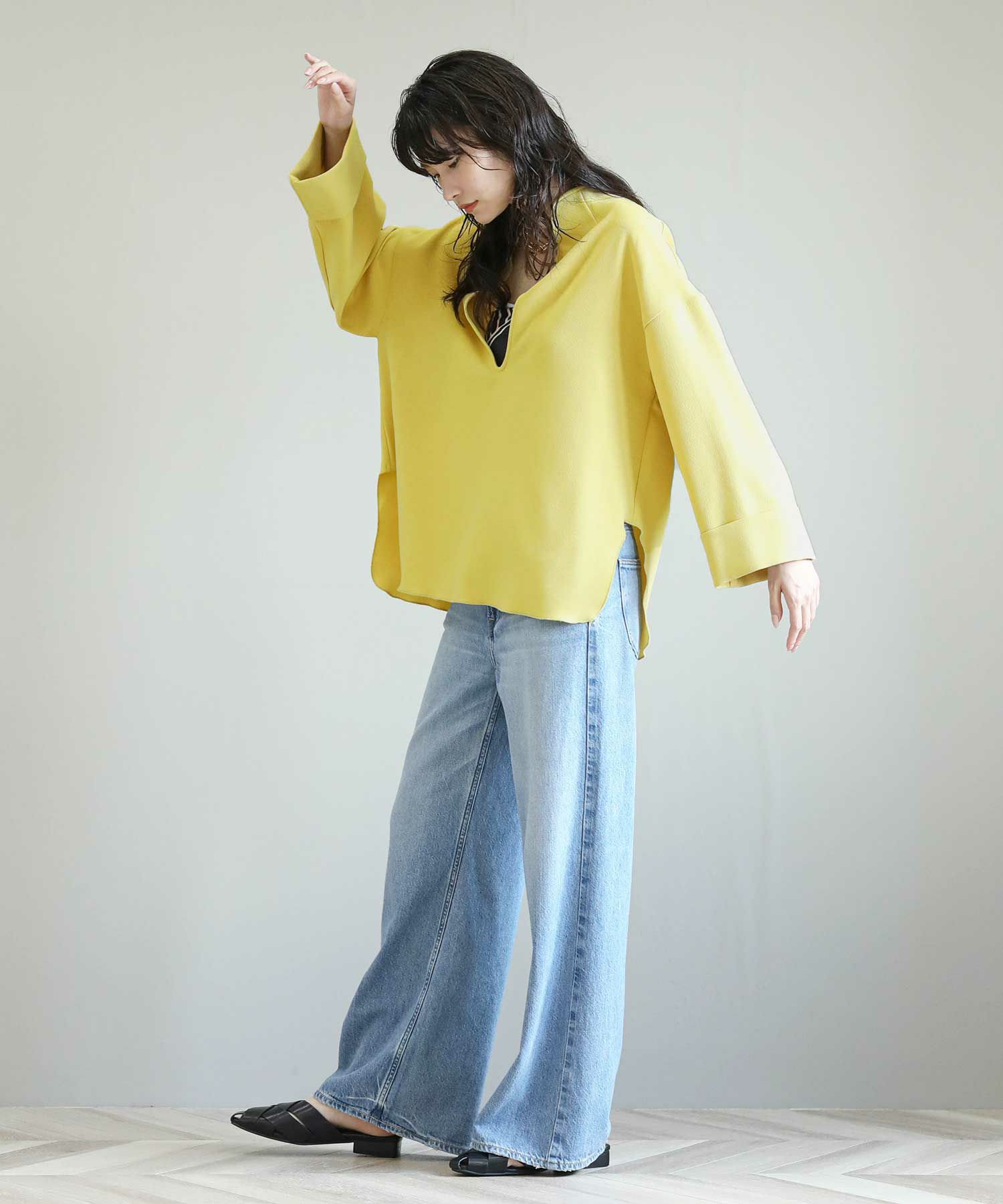 フロントの深いスリットが大人の抜け感をプラスしてくれます。ヒップまで隠れる丈感で、体型カバーにも◎