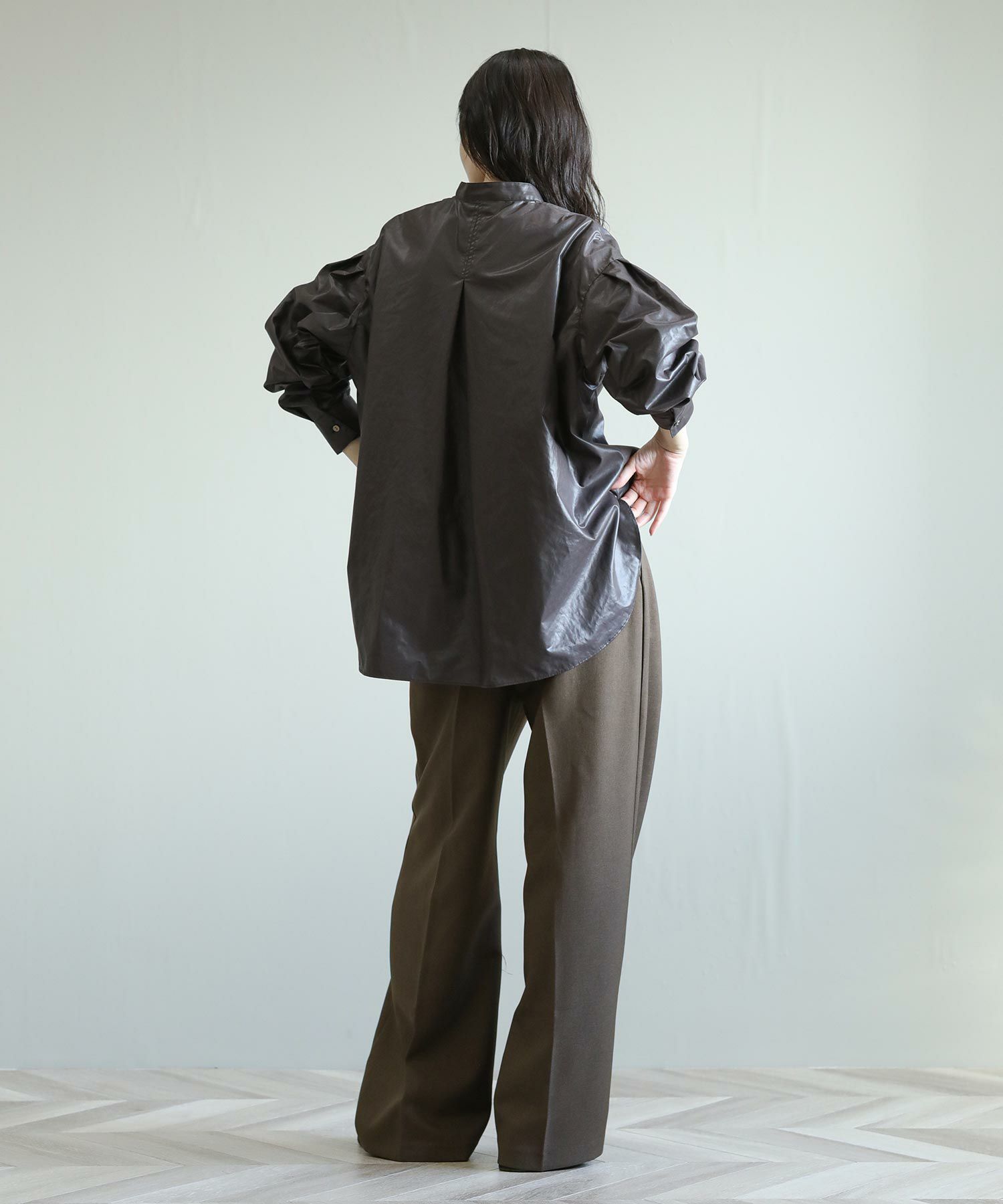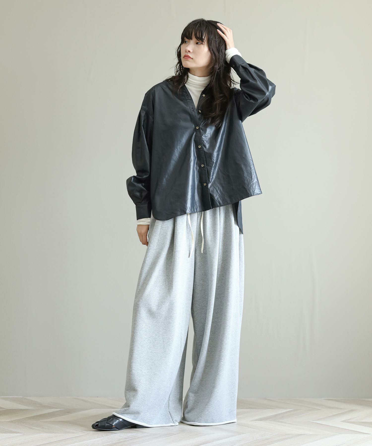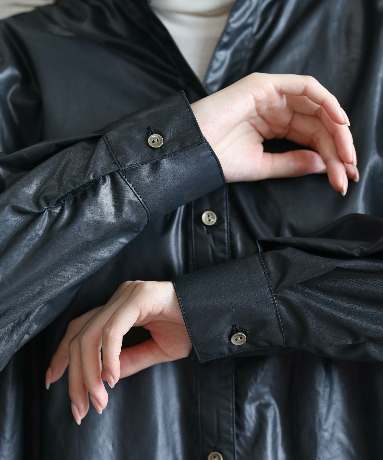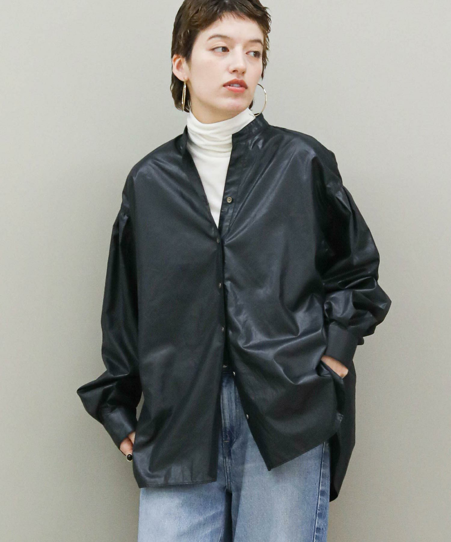 袖にボリュームをもたせることでハードになりがちなレザーアイテムを女性らしく仕上げました。スキッパーデザインを活かしてインナーにタートルやロンT仕込むのもおすすめ。腰回りをカバーしてくれる着丈なのでタイトスカートと好相性。スラックスやワイドパンツとはタックインしてきるとバランスも取りやすいです。